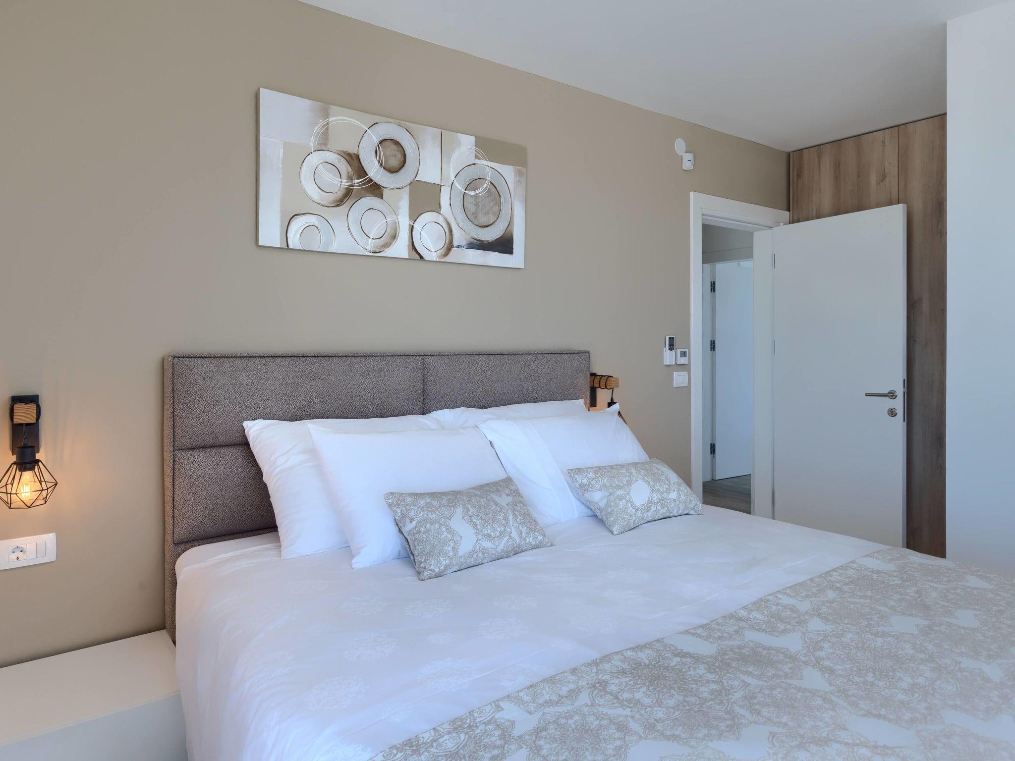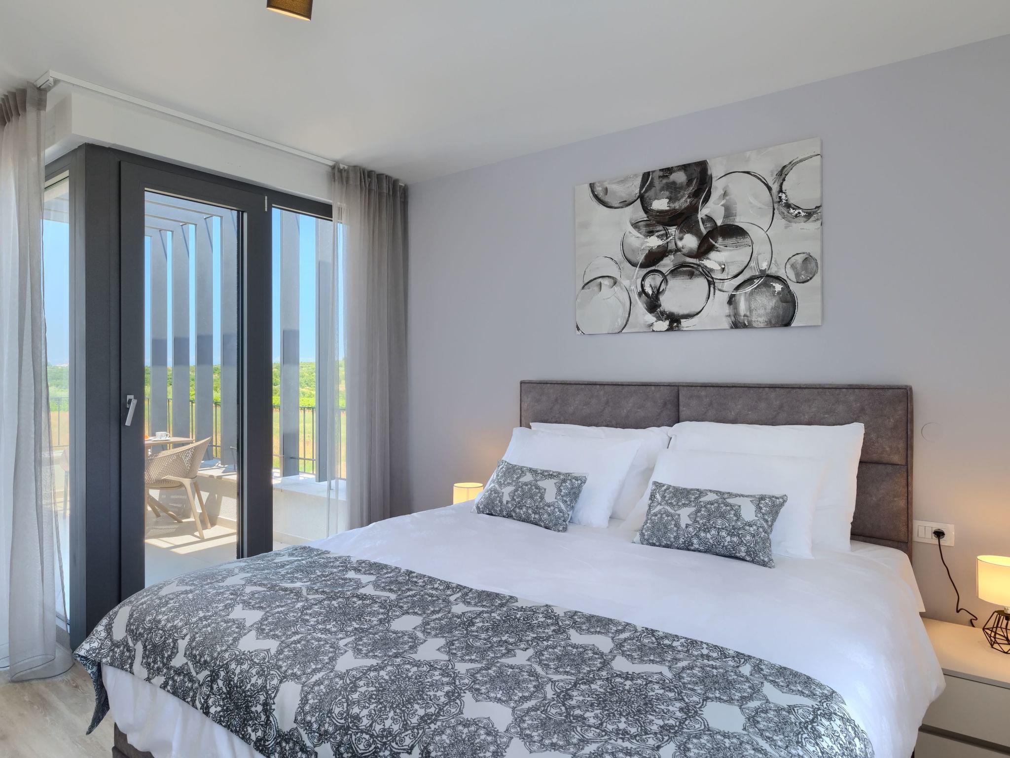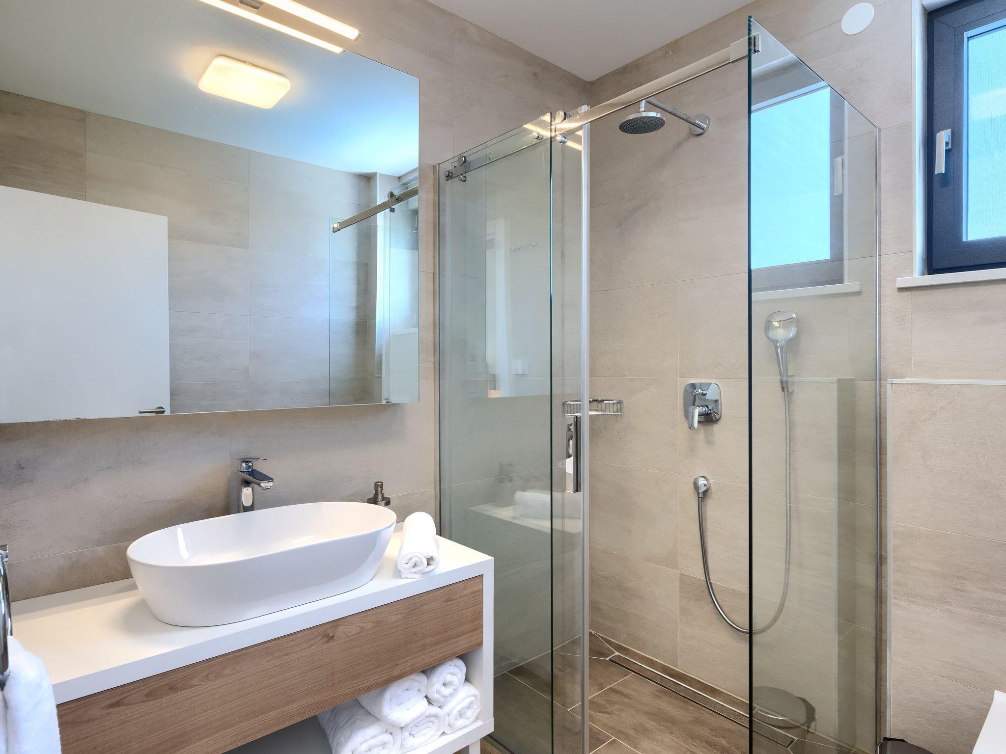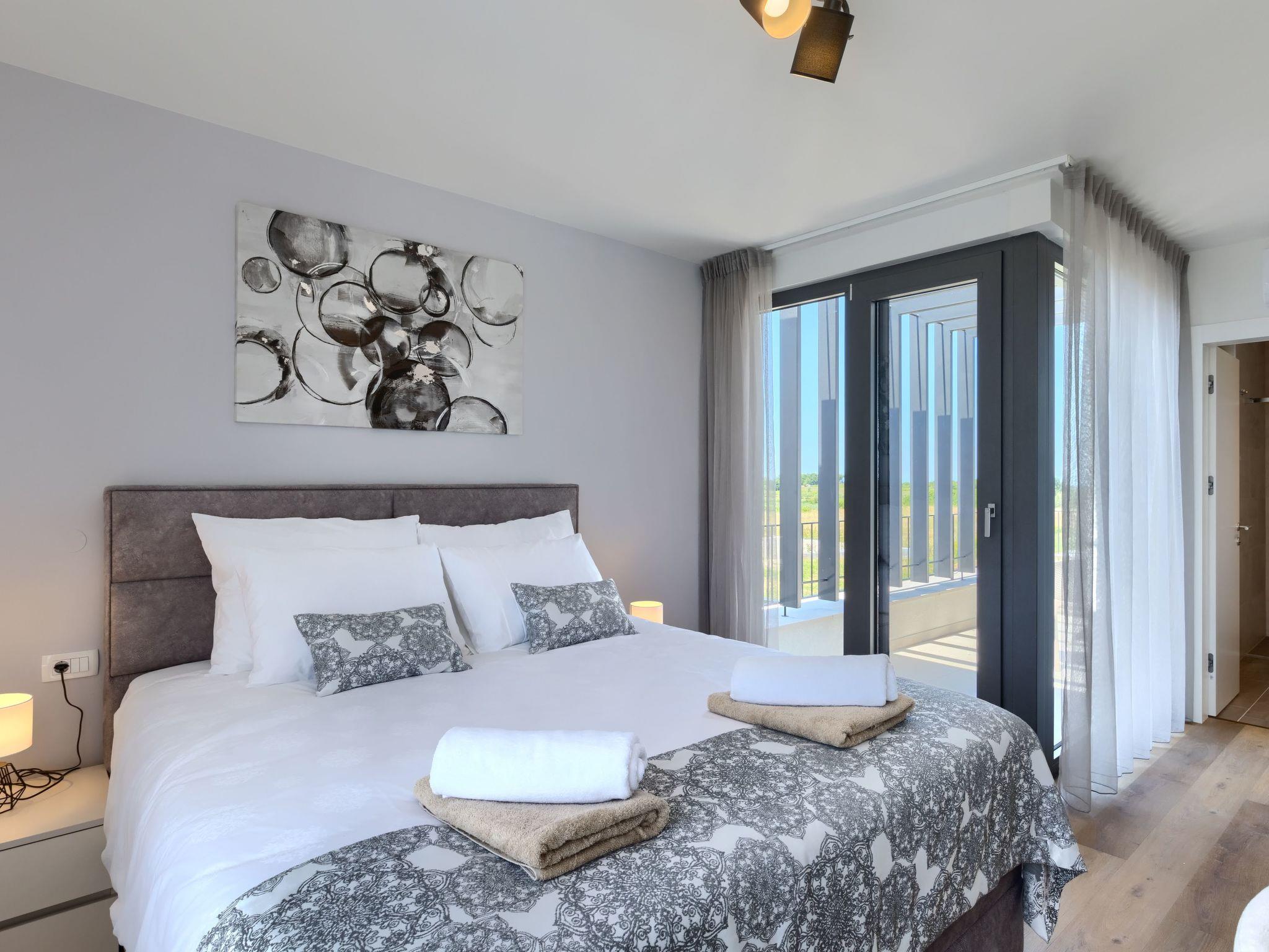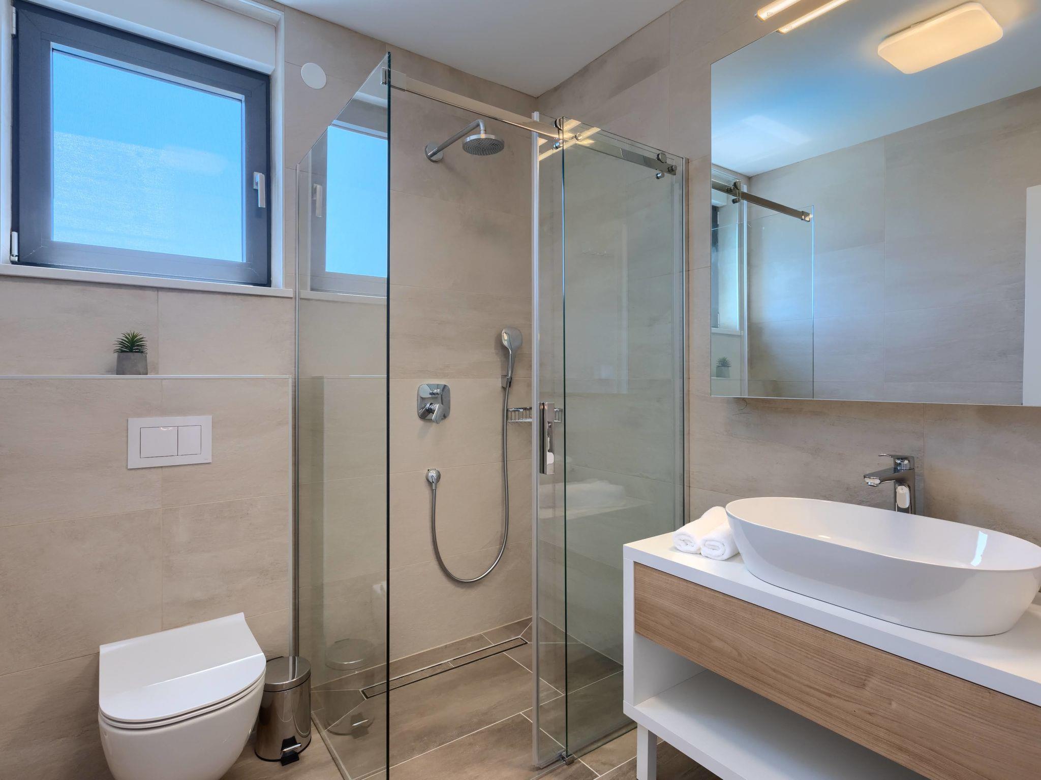 Luxurious villa "Bella & Chiara", 2 storeys, built in 2021. 1 km from the centre of Nova Vas, 2 km from the centre of Brtonigla, 10 km from the centre of Novigrad, 8.2 km from the sea. Private: property 1'800 m2 (fenced) with lawn, 2 swimming pools angular, heated (4 x 10 m, depth 135 cm, seasonal availability: 10.Apr. - 01.Nov.) with internal staircase. Outdoor shower, hot tub, badminton, terrace (10 m2), garden furniture, barbecue house. In the house: internet access, trampoline, washing machine, bicycles available. Available: bicycles (4), children's bicycles (2). Motor access (500 m via unmade road). Parking (for 6 cars) at the house on the premises. Shop 1.5 km, restaurant 650 m, bus stop 4 km, pebble beach 8.2 km. Walking paths from the house, cycle lane 100 m. Nearby attractions: Aquapark 2 km. Groups of teenagers on request only. Please note: airfield 20 km from the property. Swimming pool heated (extra). Video surveillance of the driveway and parking. The unit consists of 2 houses rented as one unit.