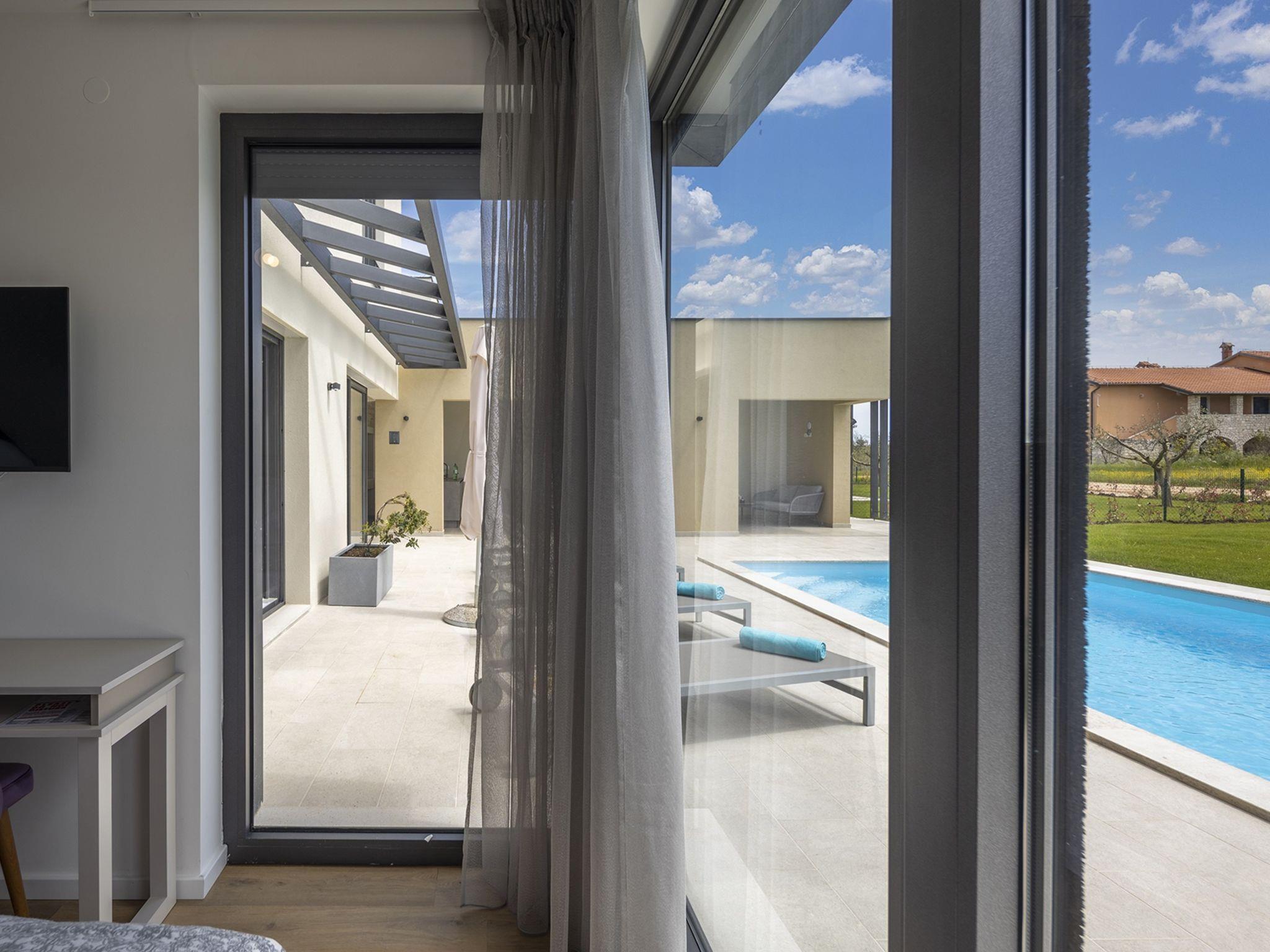 Luxurious villa "Stella", 2 storeys, built in 2021. 1 km from the centre of Nova Vas, 2 km from the centre of Brtonigla, 10 km from the centre of Novigrad, 8.2 km from the sea. Private: property 900 m2 (fenced) with lawn, swimming pool angular, heated (4 x 10 m, depth 135 cm, seasonal availability: 10.Apr. - 01.Nov.) with internal staircase. Outdoor shower, hot tub, badminton, terrace (10 m2), garden furniture, barbecue house. In the house: internet access, trampoline, washing machine, bicycles available. Available: bicycles (2), children's bicycles (1). Motor access (500 m via unmade road). Parking (for 3 cars) at the house on the premises. Shop 1.5 km, restaurant 650 m, bus stop 4 km, pebble beach 8.2 km. Walking paths from the house, cycle lane 100 m. Nearby attractions: Aquapark 2 km. Groups of teenagers on request only. Please note: airfield 20 km from the property. Swimming pool heated (extra). Video surveillance of the driveway and parking.