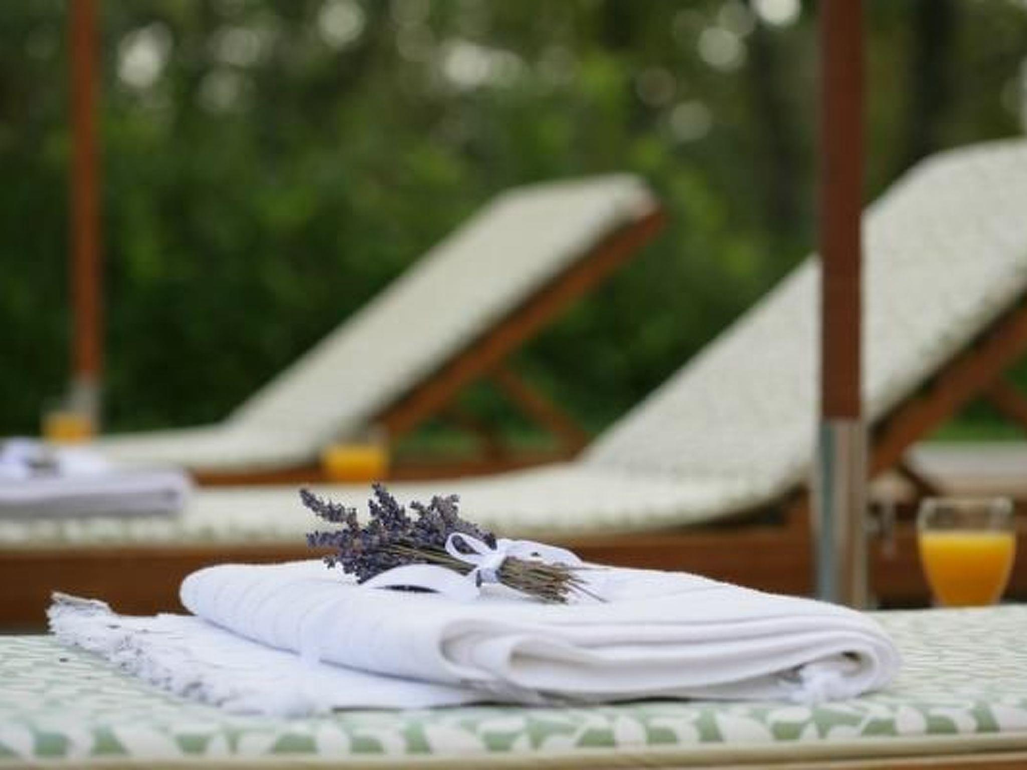 Other bedroom furniture : Panoramic view of the countryside and look at the pool. Double bed (2 x 80 x 200 cm) and day-bed for two persons (2 x 80 x 200 cm), sitting area, air conditioning. SHOWER / WC / 2 sinks, bidet.