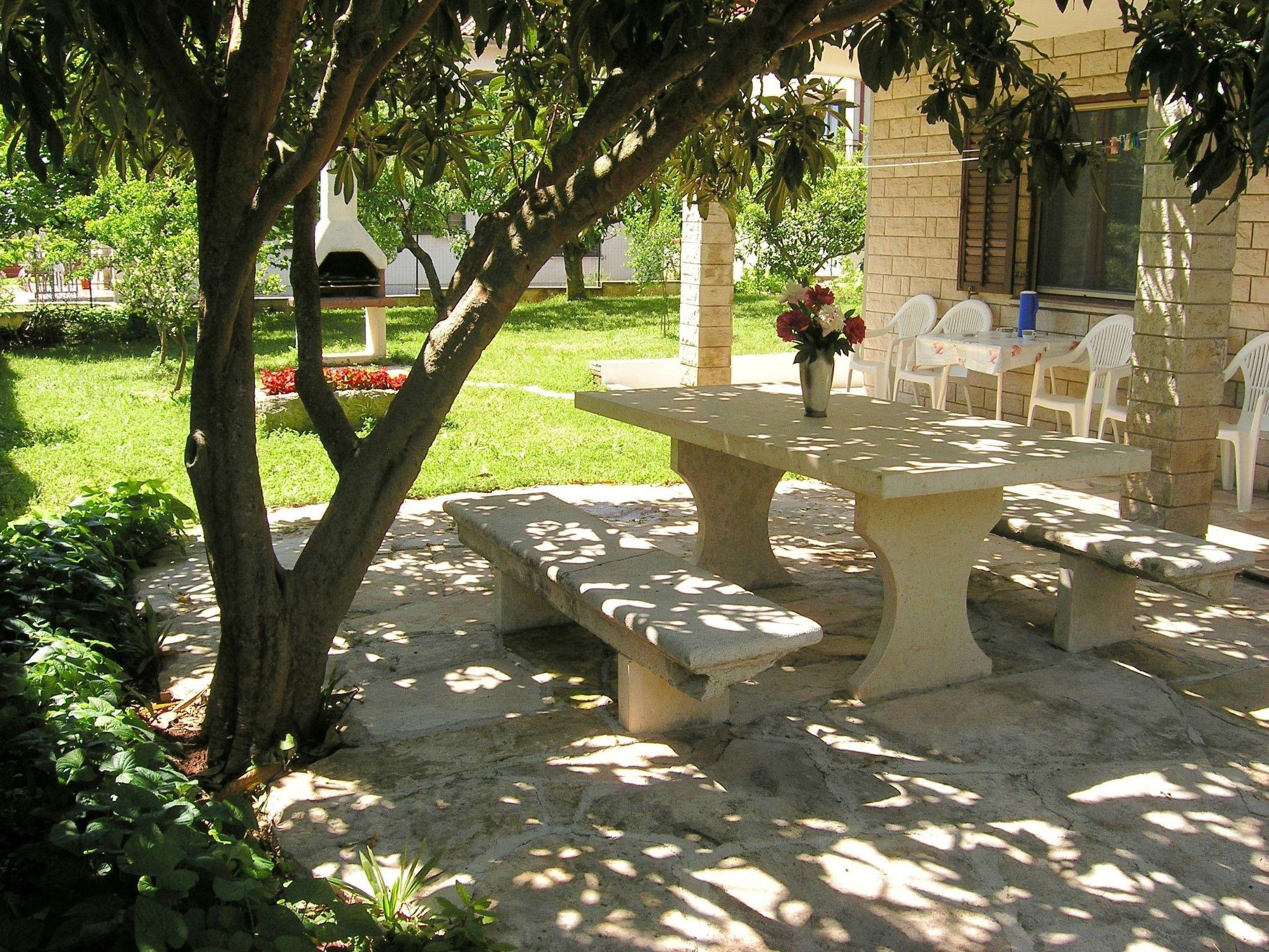 Outside, the flat extends into a lovely terrace shaded by Mediterranean trees. Equipped with a stone table and benches, this outdoor area is ideal for moments of pure relaxation and conviviality, providing the perfect setting for al fresco dining.