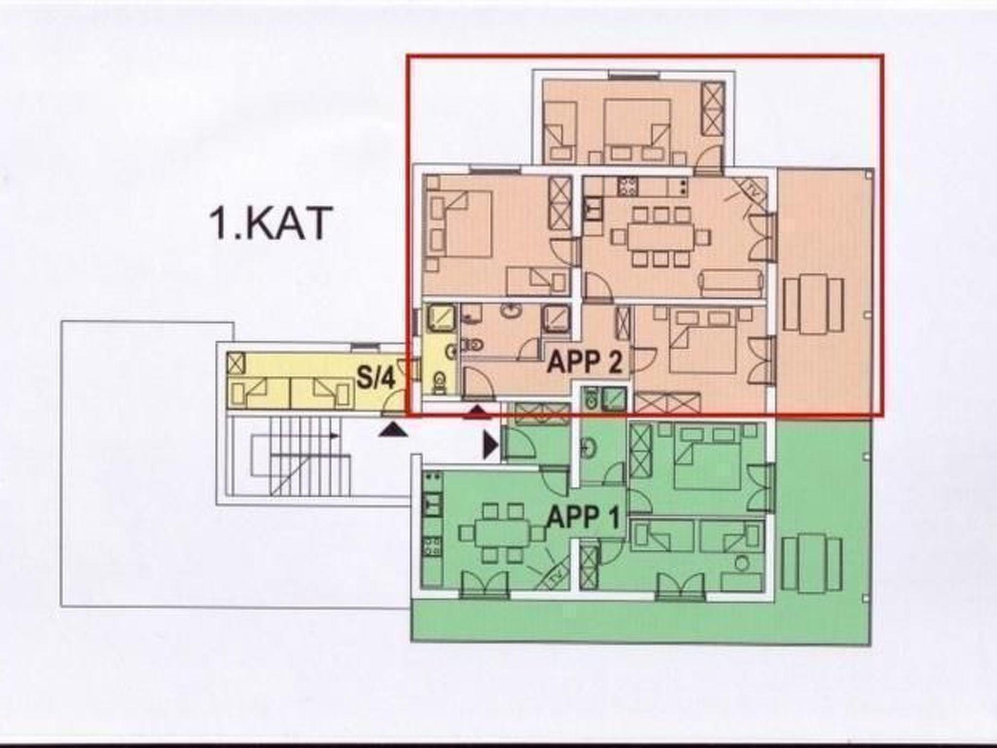 The 110 m² flat is located on the first floor and has two bedrooms with double beds (200x200cm) and one bedroom with four single beds (100x200cm each) next to each other. If necessary, the owner can provide a cot free of charge.