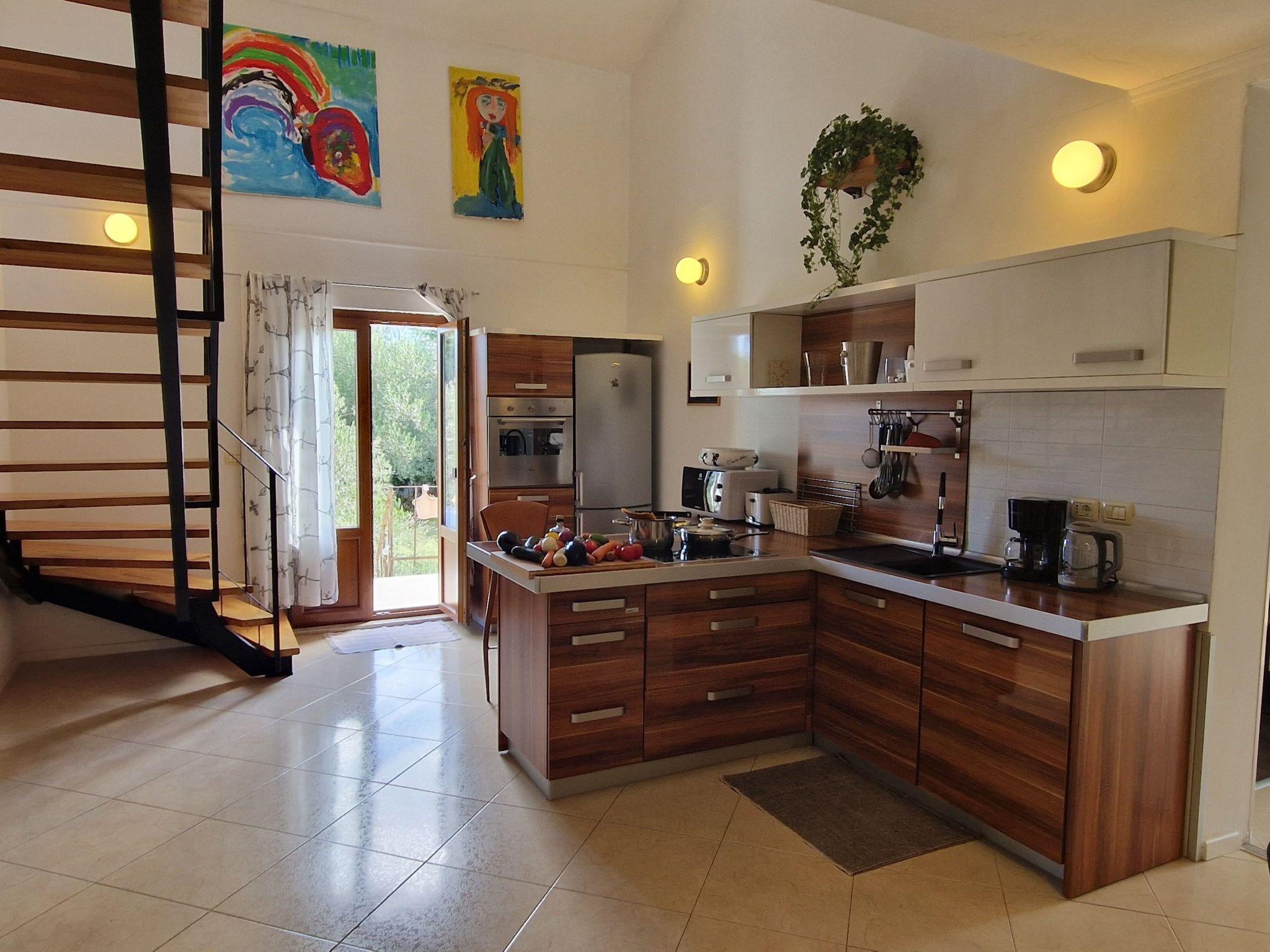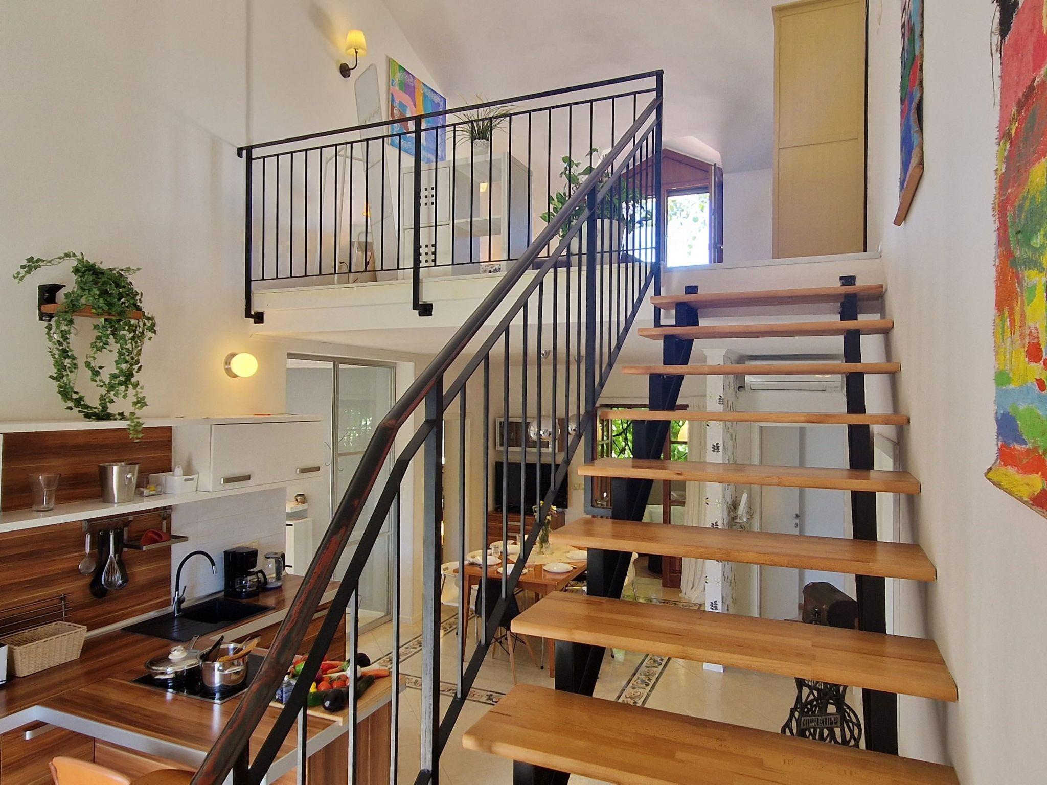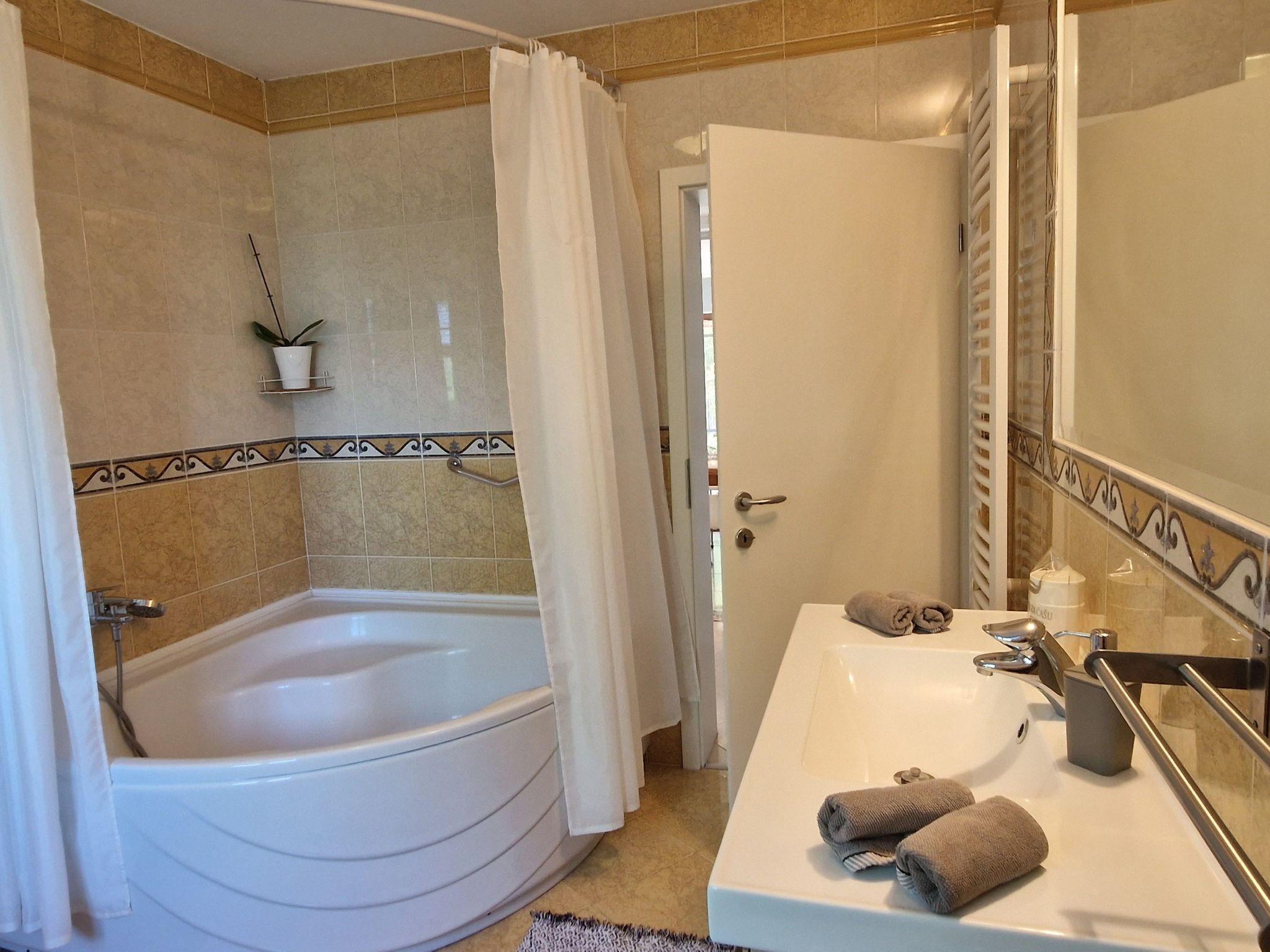 The villa has 4 bedrooms, 3 bathrooms, a large living room with a beautiful table. The kitchen is well equipped with everything you need; oven, stove, dishes, dishwasher, freezer, etc. The three bedrooms are on the ground floor, as are the 2 bathrooms. The fourth bedroom has an artistic touch 'so to speak', located on the first floor of the house, in the gallery, in front of a lovely balcony where you can spend romantic evenings..In addition, the villa has one more floor where you will find the third bathroom, an equally well-equipped kitchen, living room with satellite TV and sofa bed, relaxation room with karaoke and gym equipment.