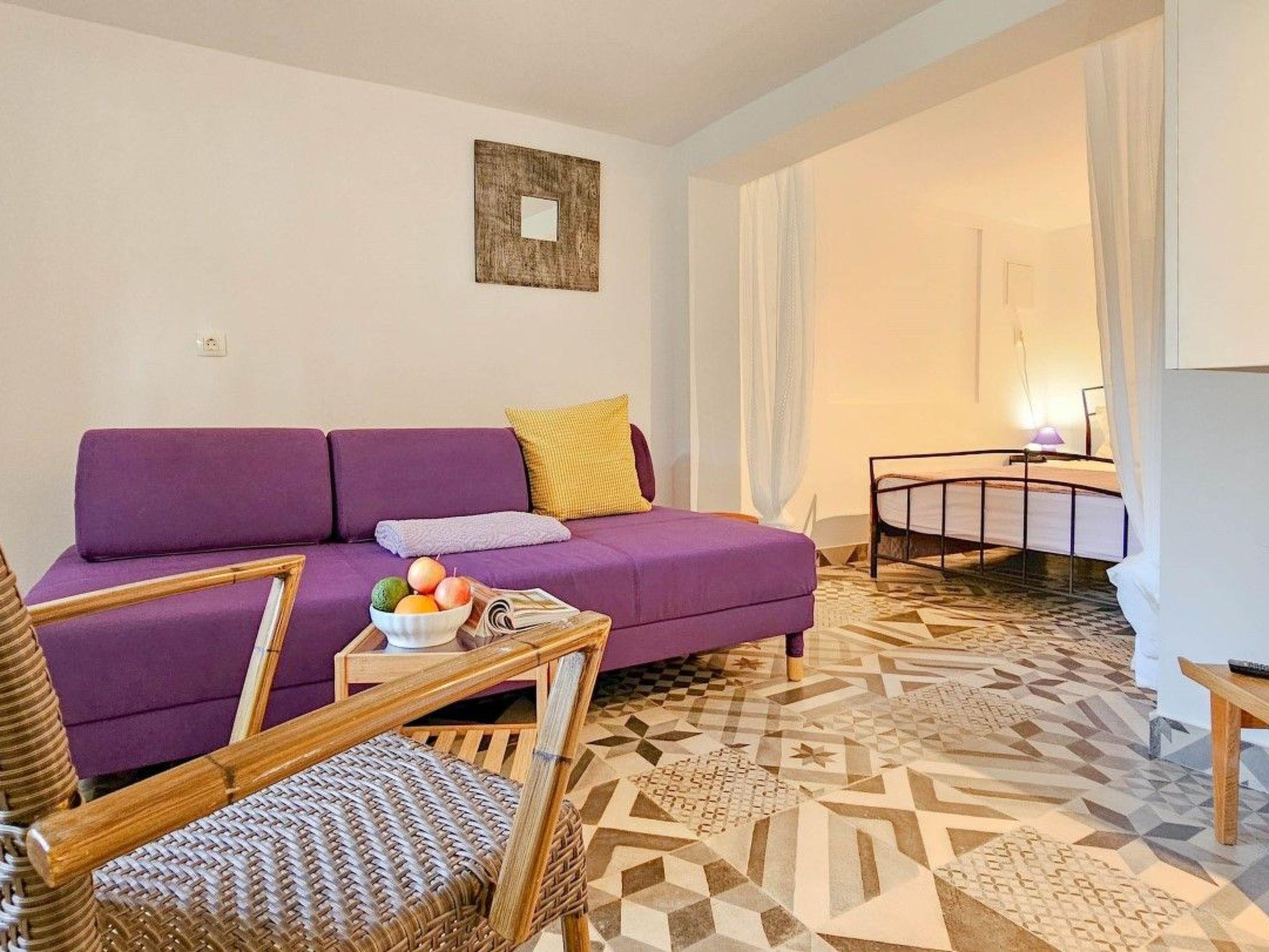 The studio offers a double bed and a living room with a sofa bed, a fully equipped kitchen for preparing simple meals, a modern bathroom with shower and a private terrace with a table and chairs - perfect for morning coffee or evening relaxation.
