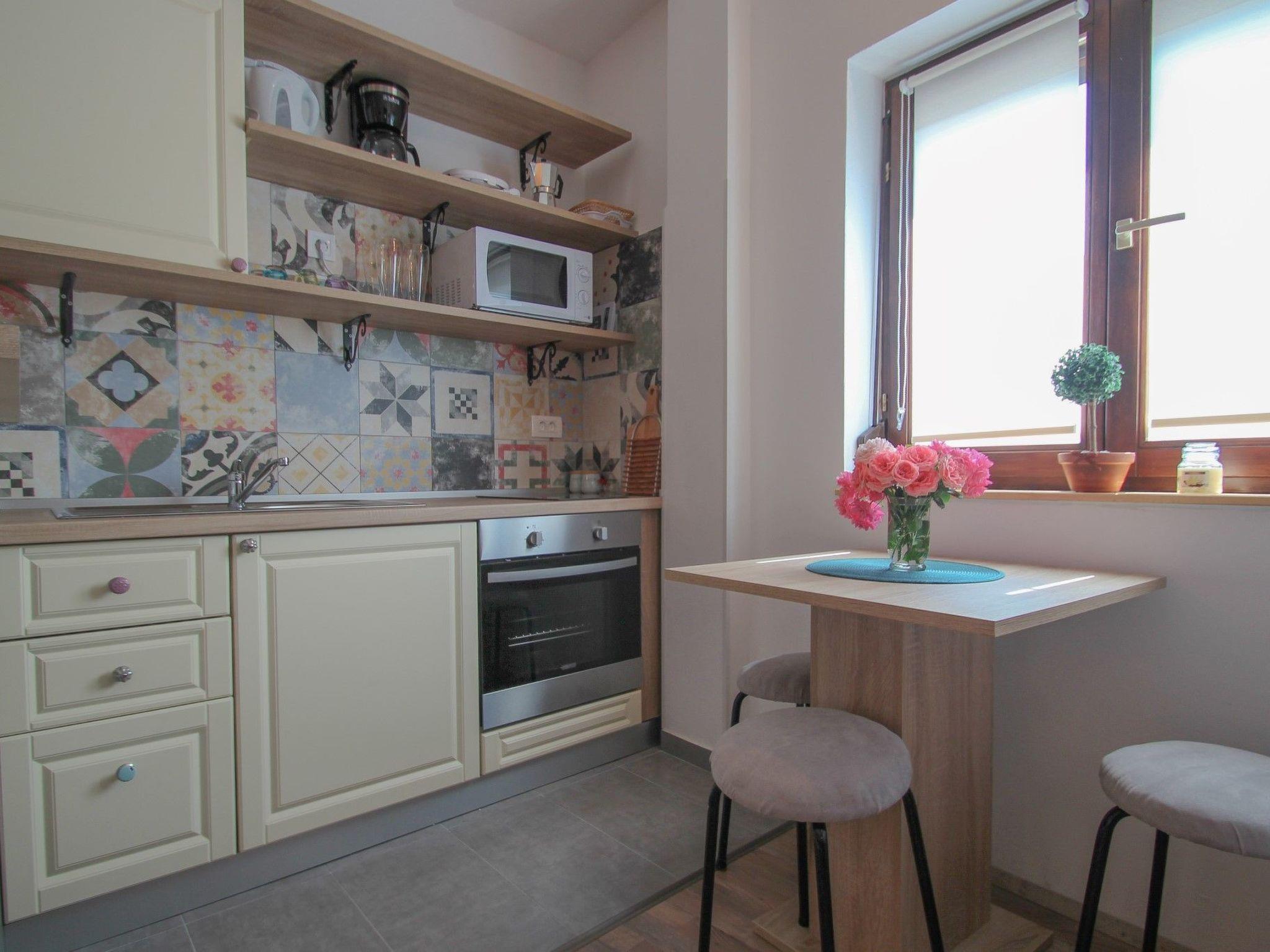 Inside, the apartment offers a welcoming bedroom with a comfortable double bed, ensuring a restful night's sleep. The integrated kitchen and dining area come fully equipped with everything you need for a hassle-free stay, including an electric stove, oven, refrigerator, microwave, and, for those essential morning brews, a coffee maker. Air conditioning is available in part of the apartment, providing a cool retreat from the Istrian sun. Additionally, the bathroom features a shower, ensuring convenience and comfort throughout your stay.