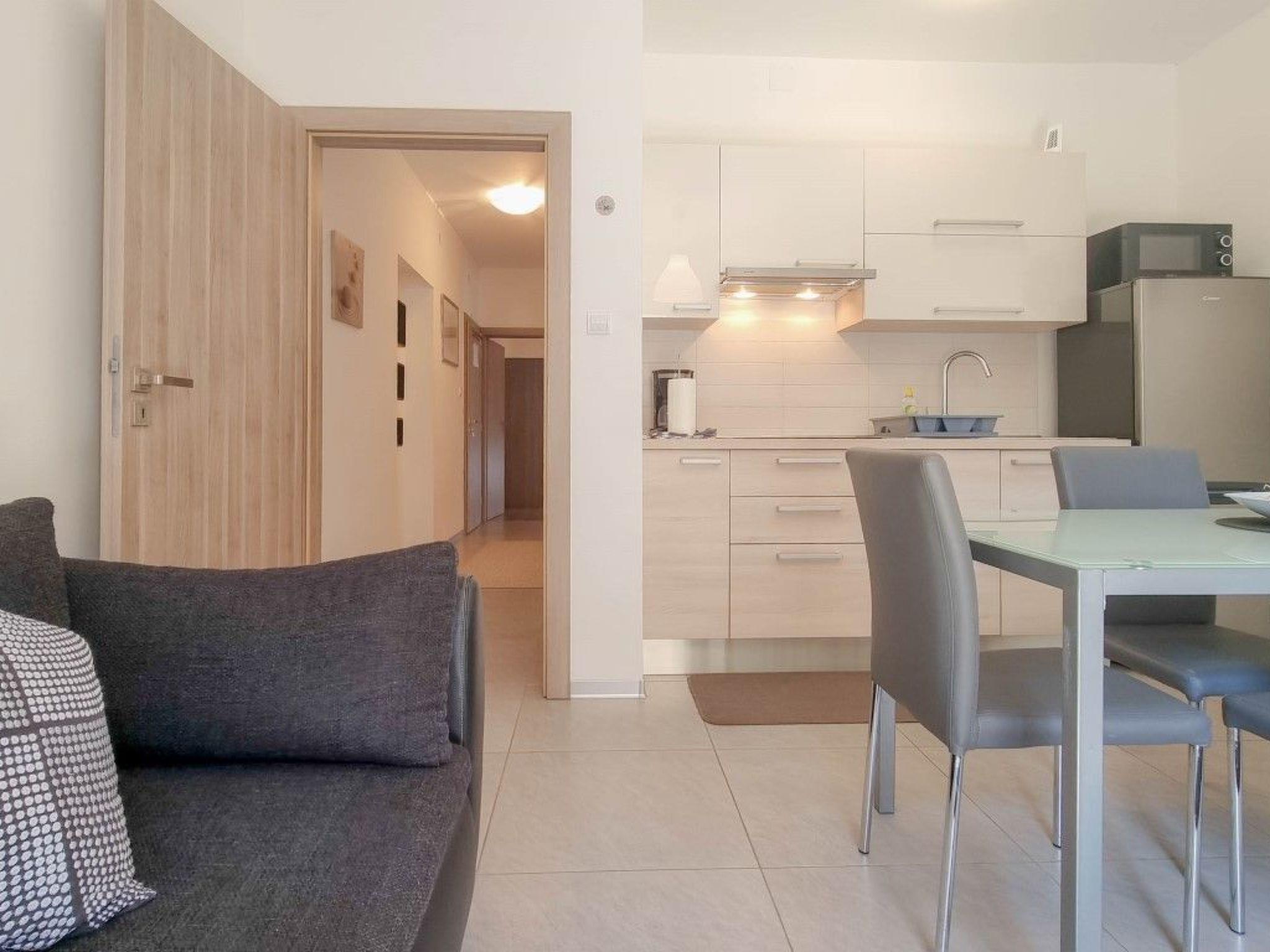 The apartment consists of two bedrooms – one with a double bed and one with a single bed – and a living room with a sofa bed, ideal for one more person. The kitchen is equipped with basic amenities and offers everything you need to prepare light meals. The bathroom with shower and toilet, as well as a beautiful terrace with garden furniture and greenery, provide the perfect place to relax with a morning coffee or an evening glass of wine.