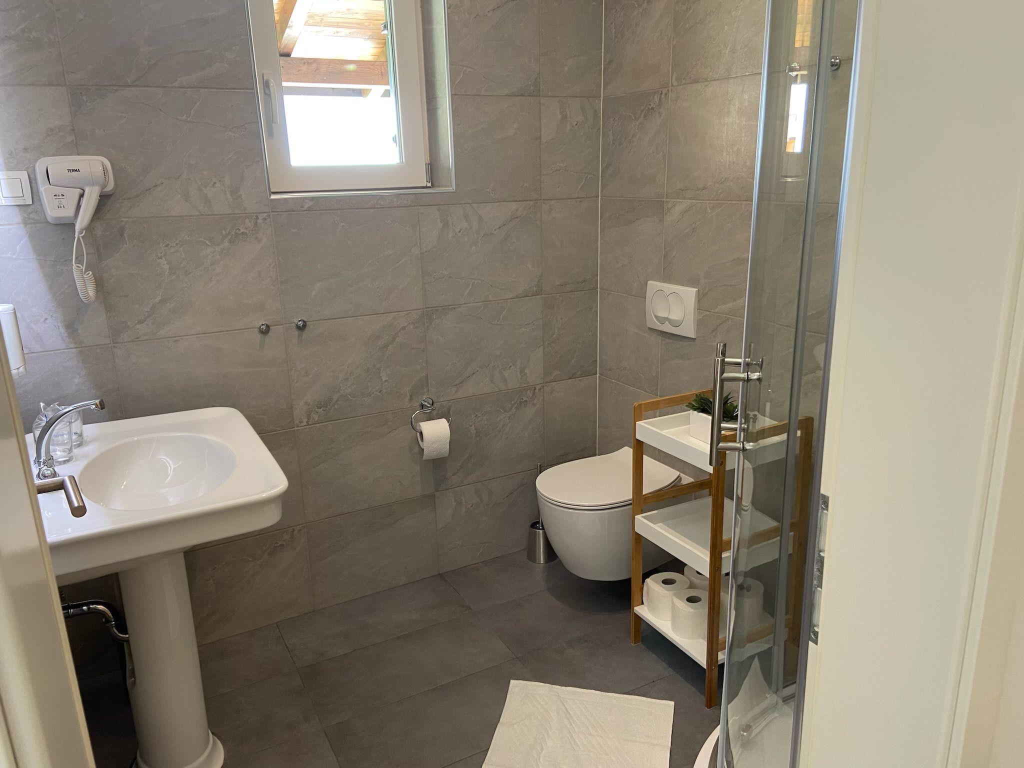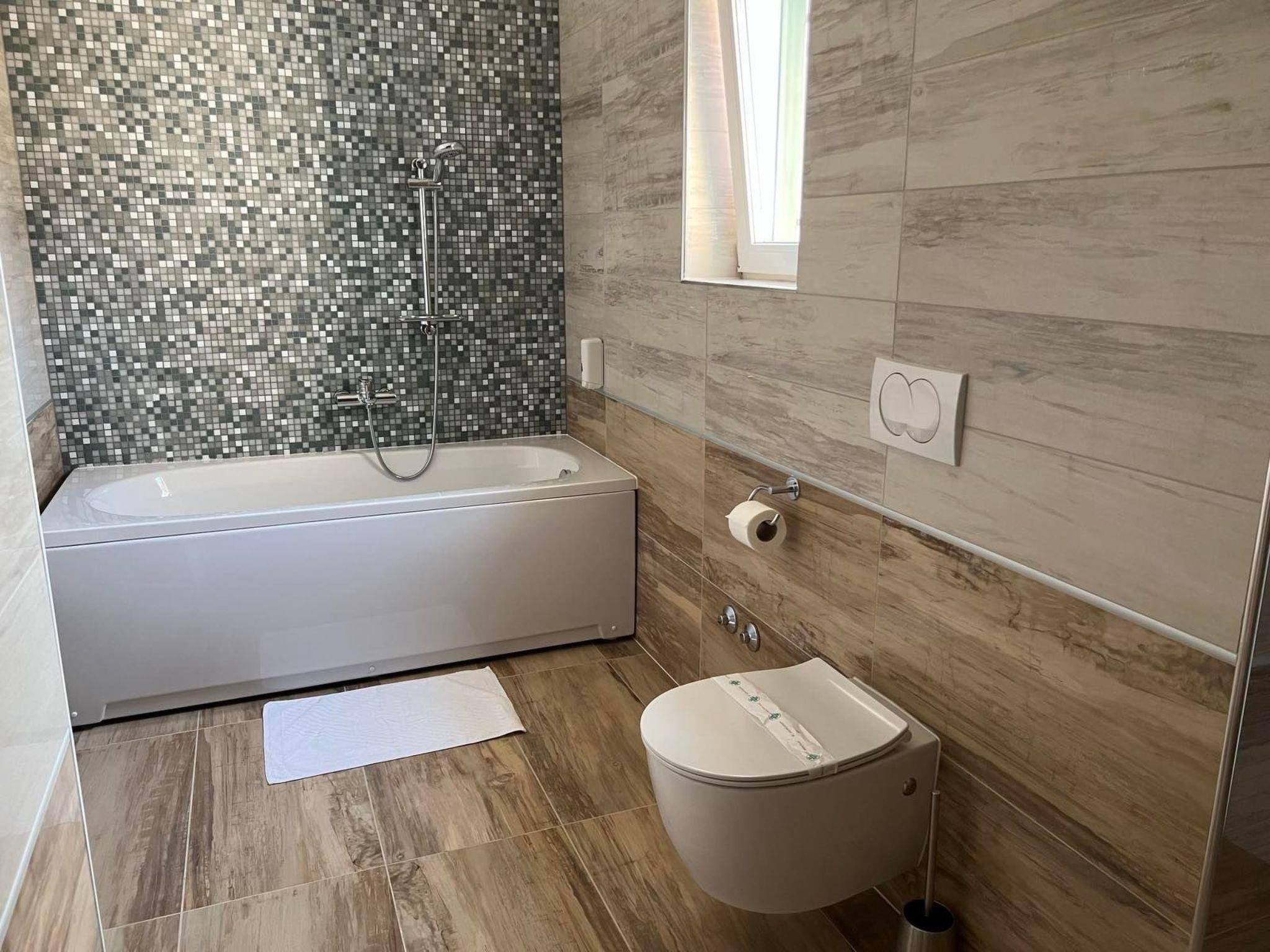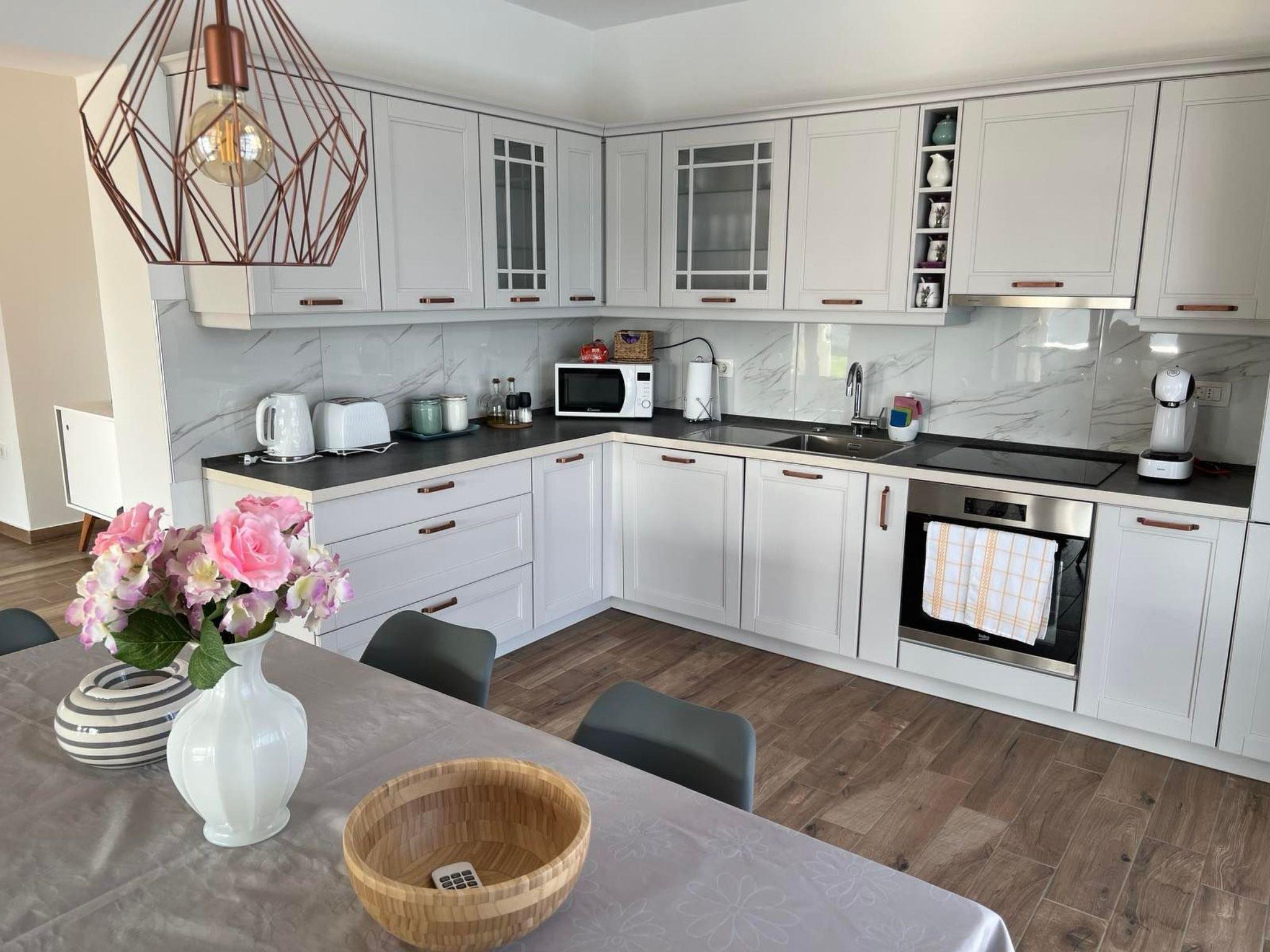 The spacious villa has 4 bedrooms, a living room and a kitchen with a dining room. On the first floor there is a master bedroom with a private bathroom with a bathtub and access to its own terrace, while the other two bedrooms on the floor share a bathroom with a large bathtub. On the ground floor there is another master bedroom with a shower cabin and exit to its own terrace, a toilet, a large equipped kitchen and a living room with a smart TV and a storage room. The villa is air-conditioned and has free high-speed WI-FI internet connection.