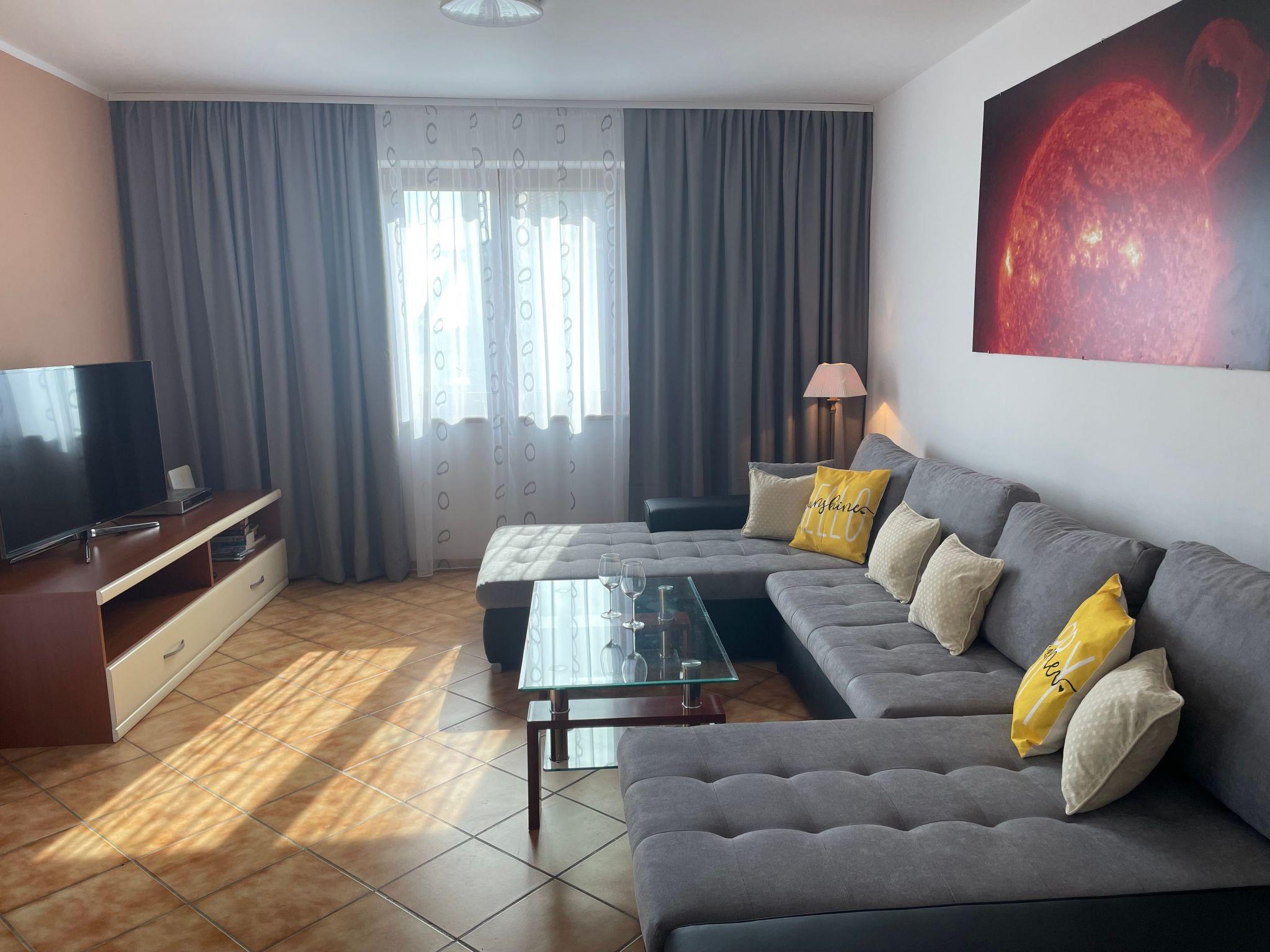 The interior of the apartment is thoughtfully equipped with a variety of amenities designed to enhance your living experience. The air-conditioned living room, besides offering cozy sofa beds, includes a fireplace for cooler evenings and a 50" flatscreen TV with satellite channels for your entertainment. Convenience is further provided by the inclusion of a mini oven, filter coffee machine, and an electric kettle in the fully-equipped kitchen, making meal preparation a breeze. The presence of underfloor heating in certain areas adds a touch of warmth and comfort throughout the apartment.