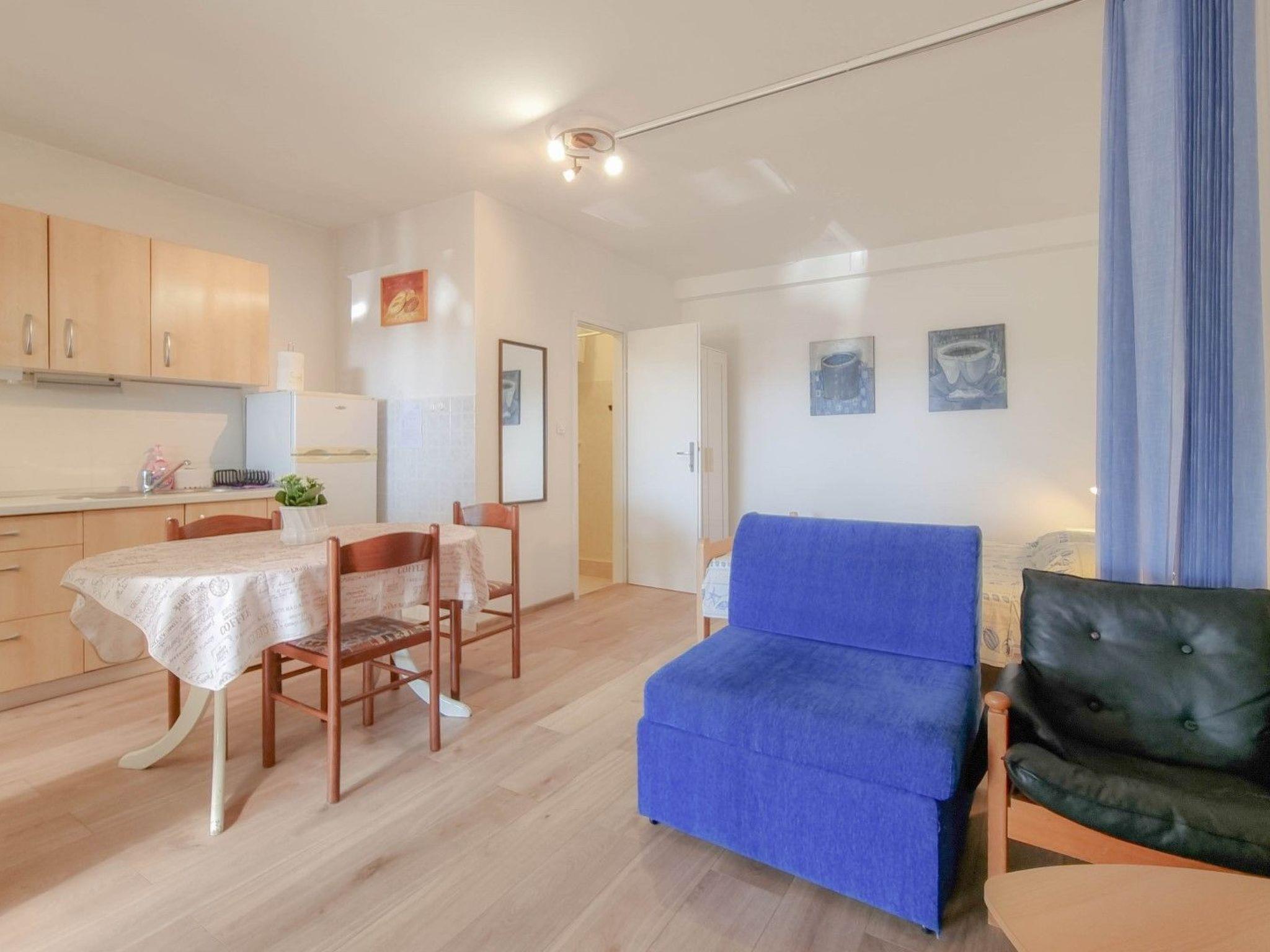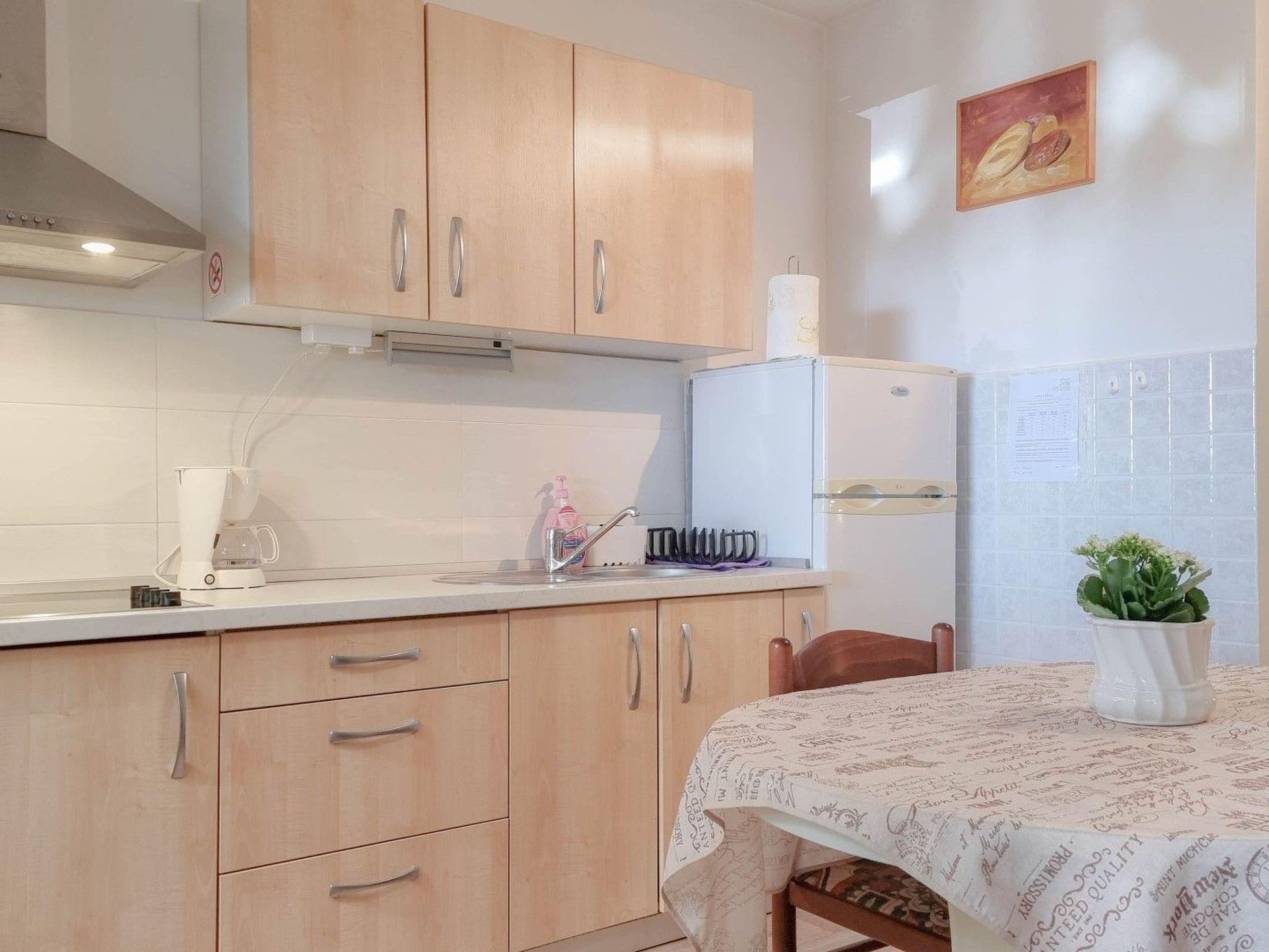 Step inside this ground floor retreat to find a cozy and efficiently designed space that accommodates 2 guests comfortably. The apartment boasts a combined living and sleeping area with a double bed, ensuring a restful night's sleep after a day of adventure. The kitchen area is well-equipped for your culinary needs, featuring an electric stove, refrigerator, and a coffee machine, making it easy to whip up breakfast or a quick snack before heading out to explore.