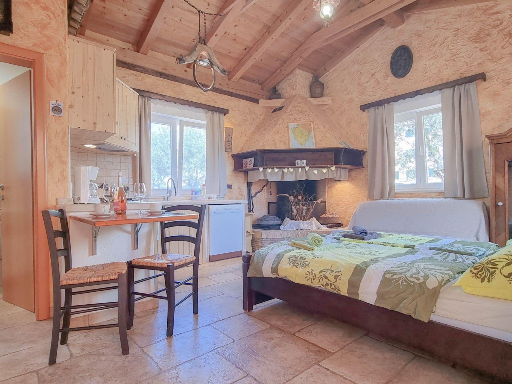 The interior of the apartment is thoughtfully arranged to maximize comfort and convenience for two guests. It features a comfortable double bed and a well-equipped kitchenette that includes a gas cooker, electric stove, oven, refrigerator, dishwasher, and coffee maker. The partial air conditioning ensures a pleasant stay during warmer days, while the inclusion of bed linen and access to the internet add to the homely atmosphere. The bathroom provides a refreshing shower experience, contributing to the overall comfort of the apartment.