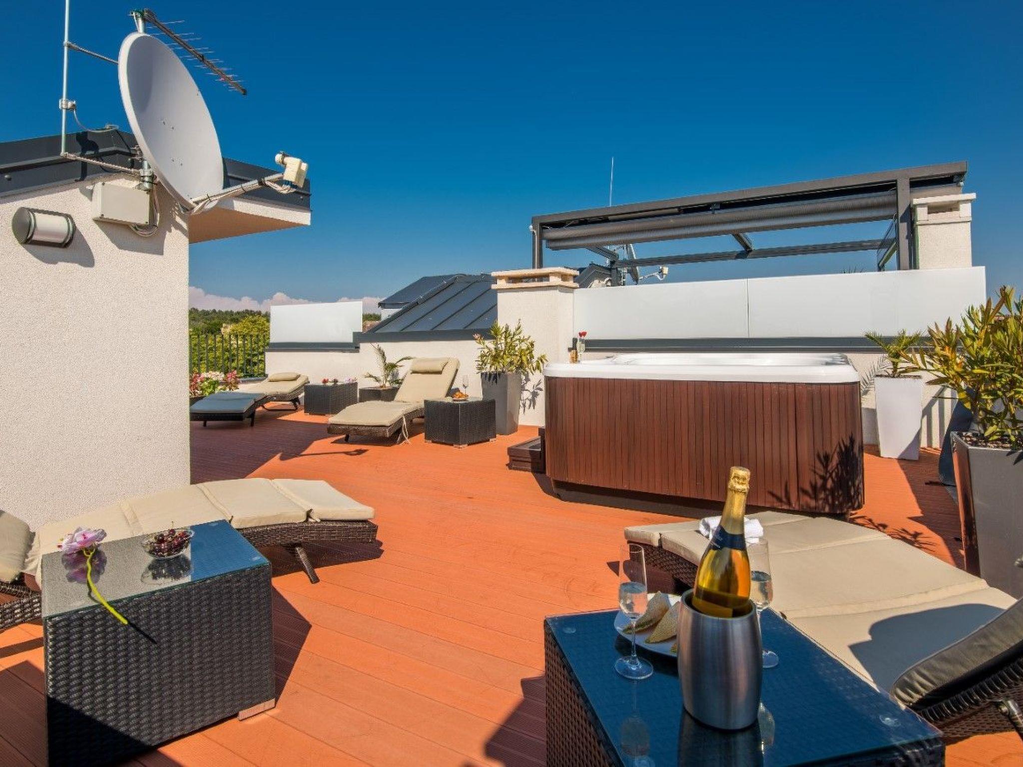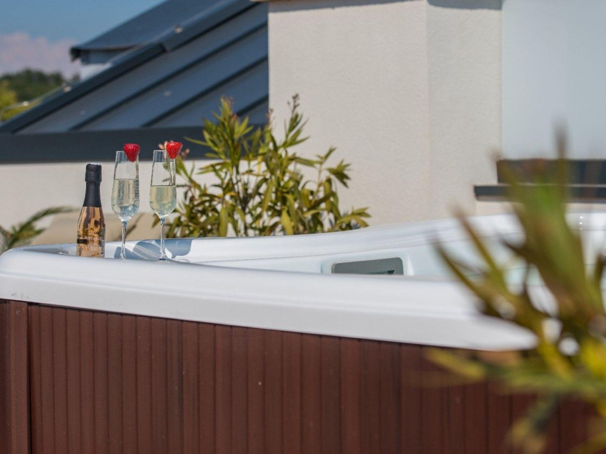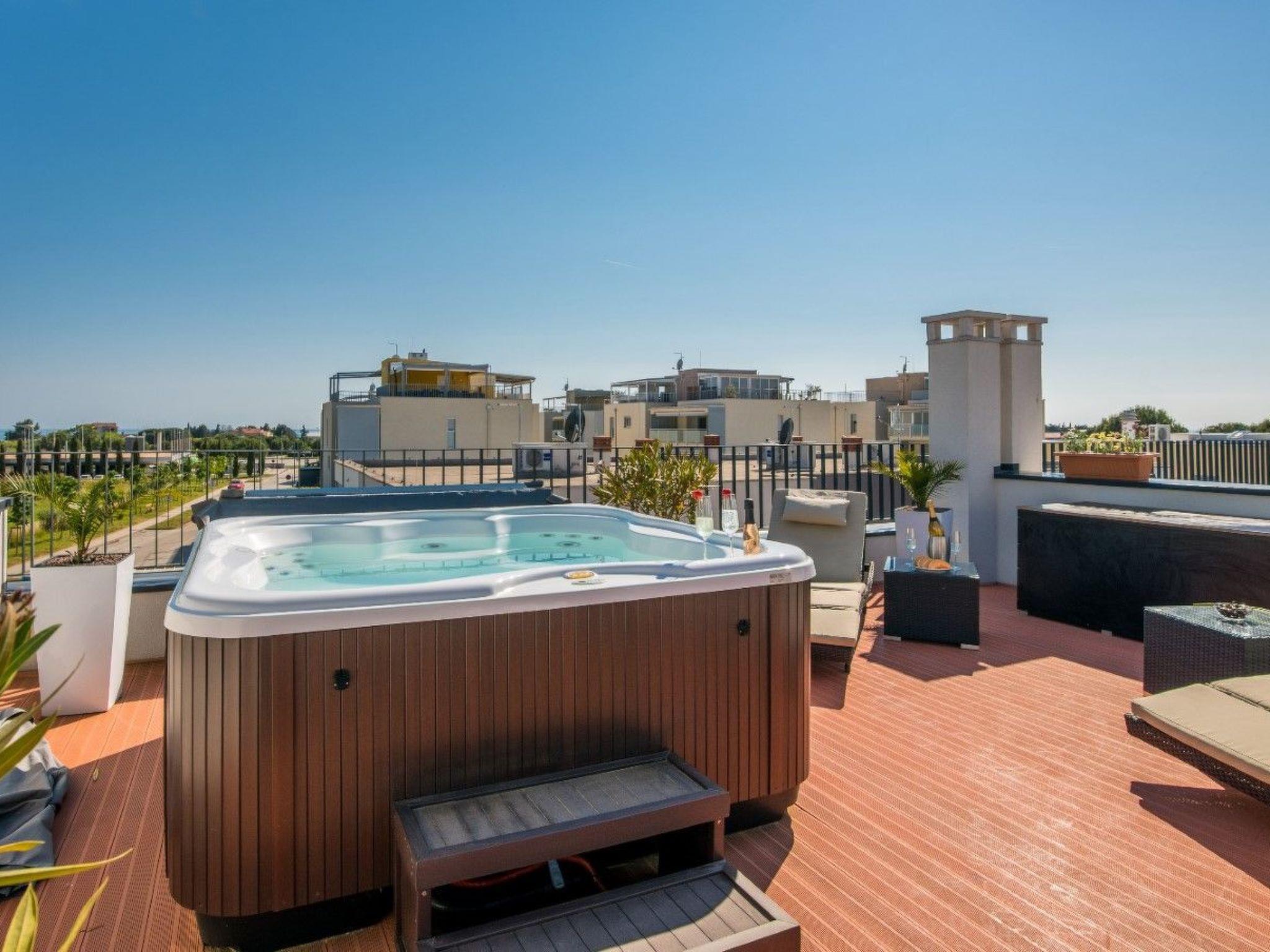 The outdoor spaces of this holiday house are just as impressive. The terrace on the ground level invites you to linger over morning coffees or evening relaxation, while the balcony offers a private spot to enjoy the fresh air. The highlight, however, is the spacious roof terrace, complete with a hot tub and furniture – a perfect oasis for relaxation at any time of the day. These outdoor areas provide ideal settings for relaxation, conversation, and enjoying the company of your group.
