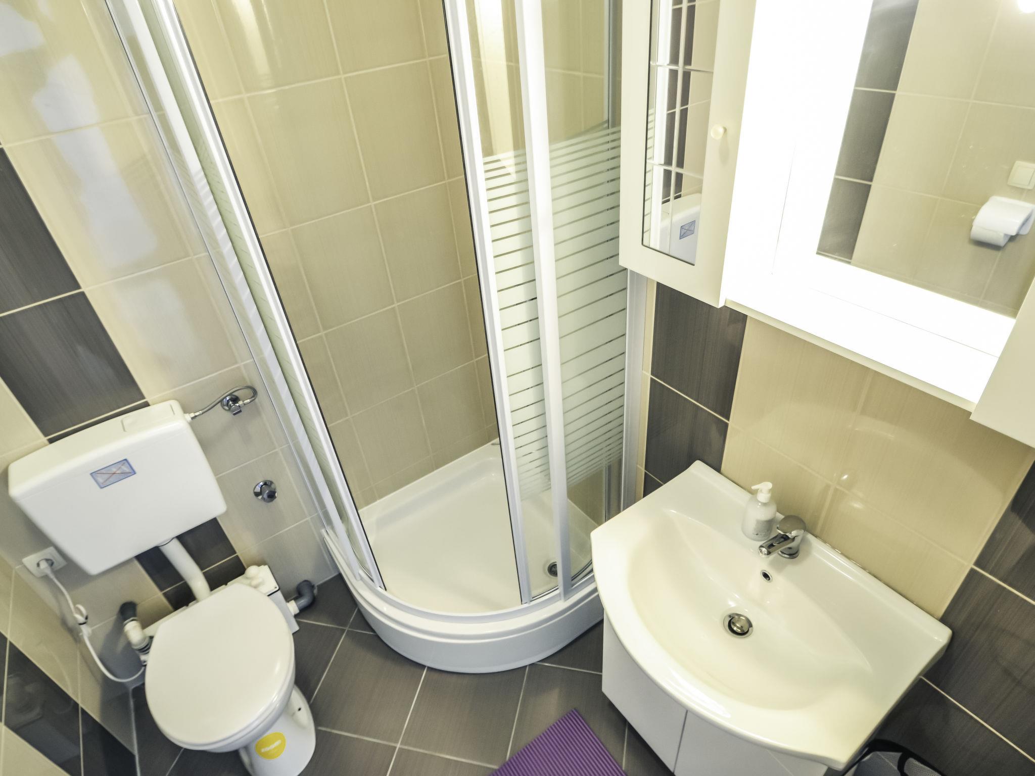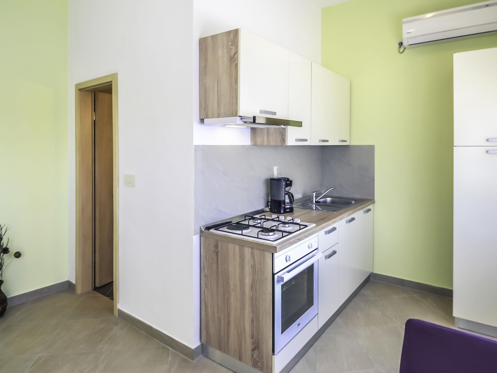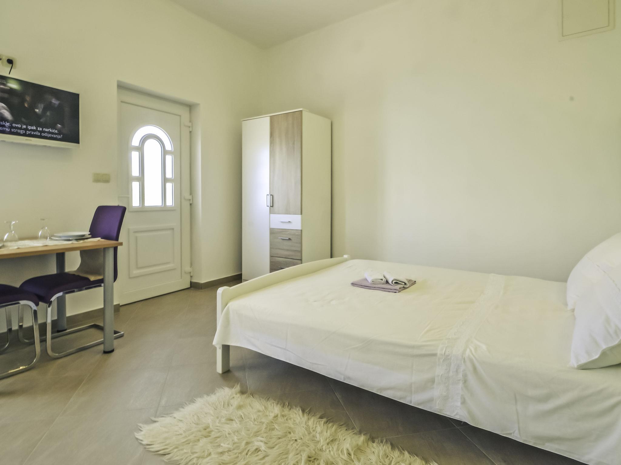 1-room bungalow 30 m2, south-west facing position. Studio with 1 french bed (160 cm, length 200 cm), satellite TV (flat screen). Exit to the terrace. Open kitchen (4 hot plates, oven, freezer, electric coffee machine) with dining table, air conditioning. Shower/WC. No heating option. Terrace. Terrace furniture. Facilities: Internet (WiFi, free). 1 small pet/ dog allowed. UP/I-335-03/15-01/17