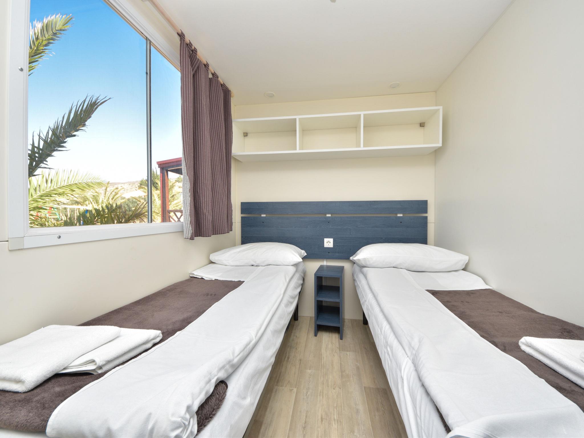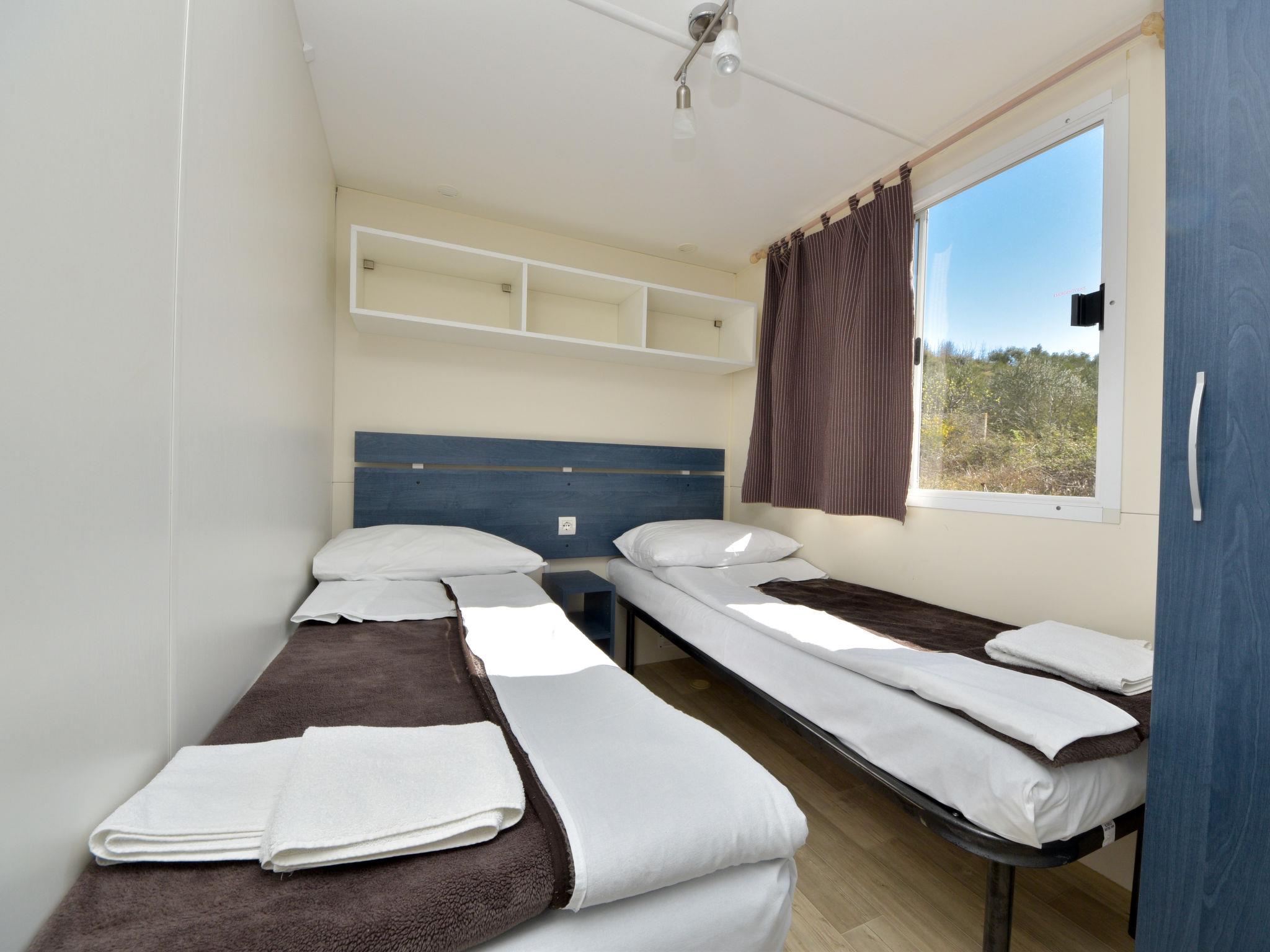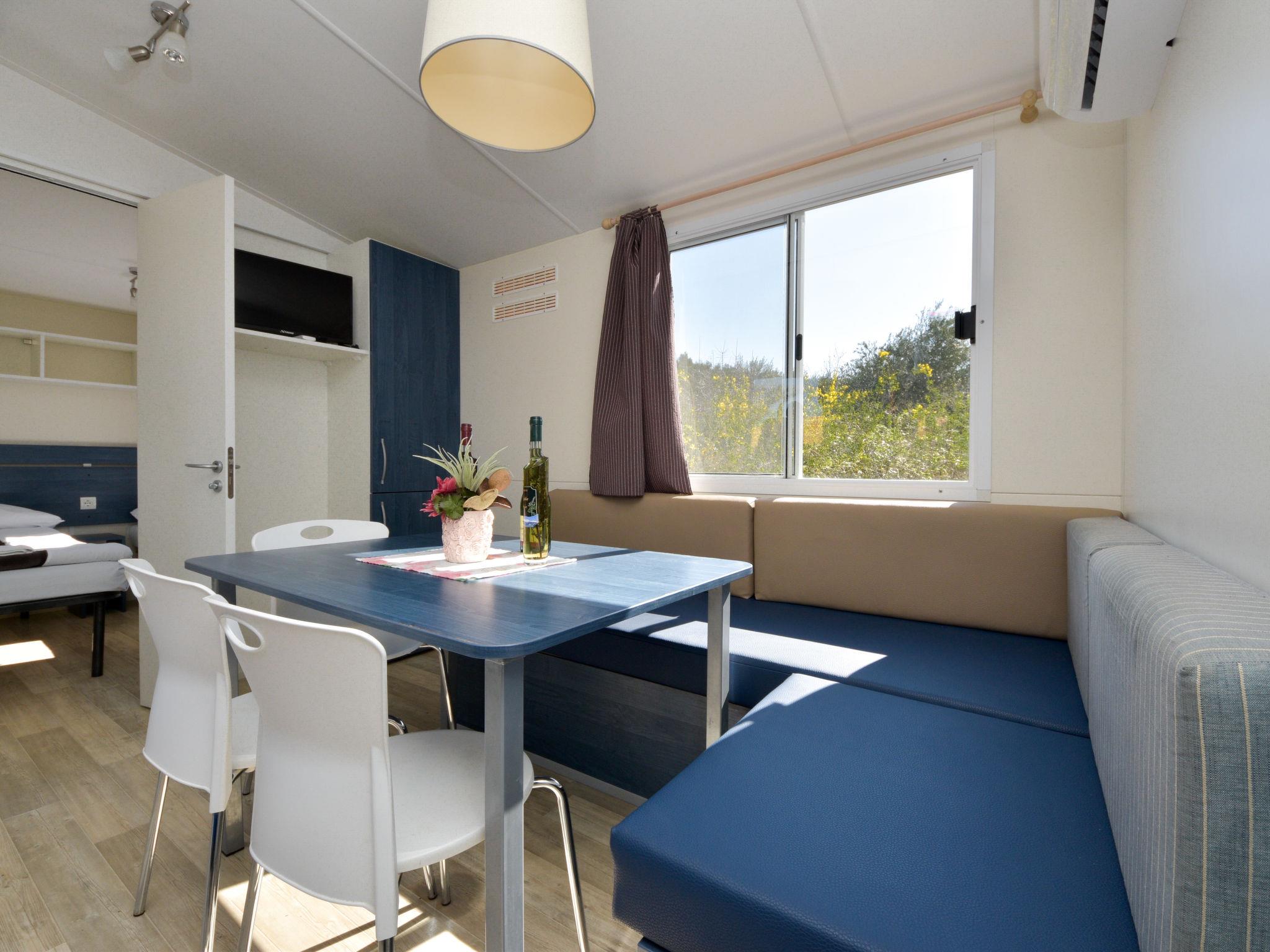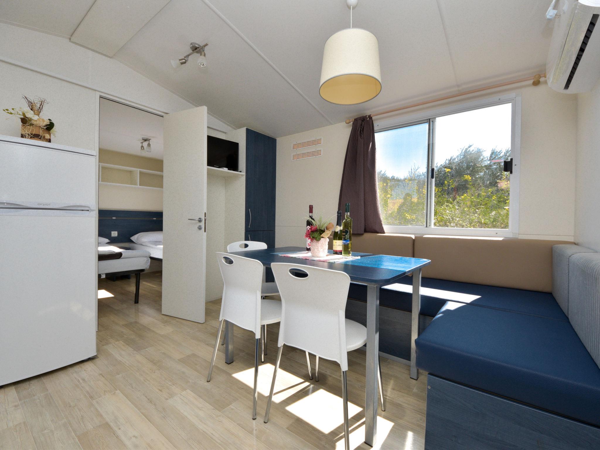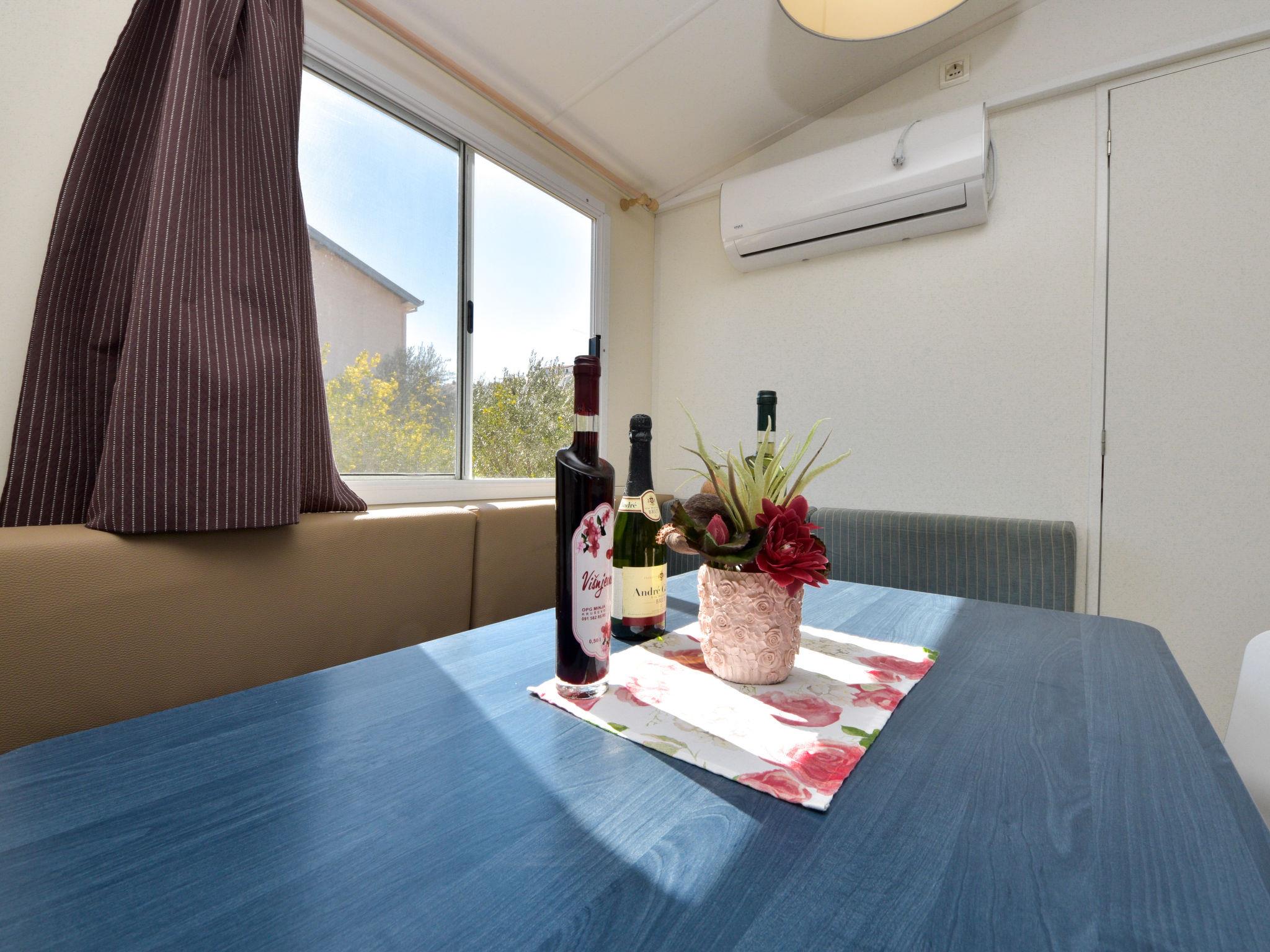 4-room mobile home 32 m2, west facing position. Living/dining room with satellite TV (flat screen), air conditioning. Exit to the terrace. 1 room with 1 french bed (140 cm, length 190 cm). 2 rooms, each room with 2 beds (70 cm, length 190 cm). Open kitchen (4 hot plates, freezer). Shower/WC. No heating option. Terrace 14 m2 partly roofed. Terrace furniture. View of the sea. Facilities: washing machine, hair dryer. Internet (WiFi, free).