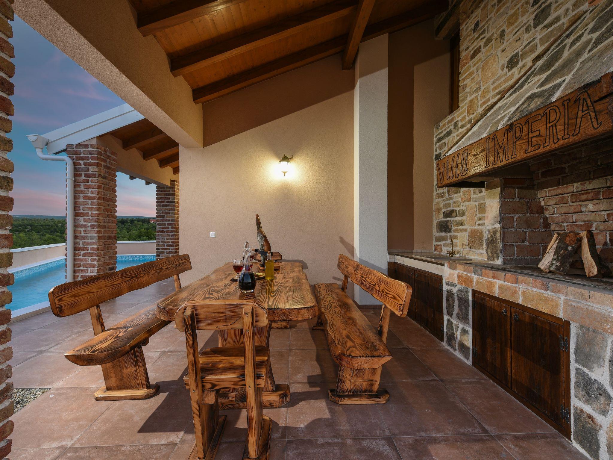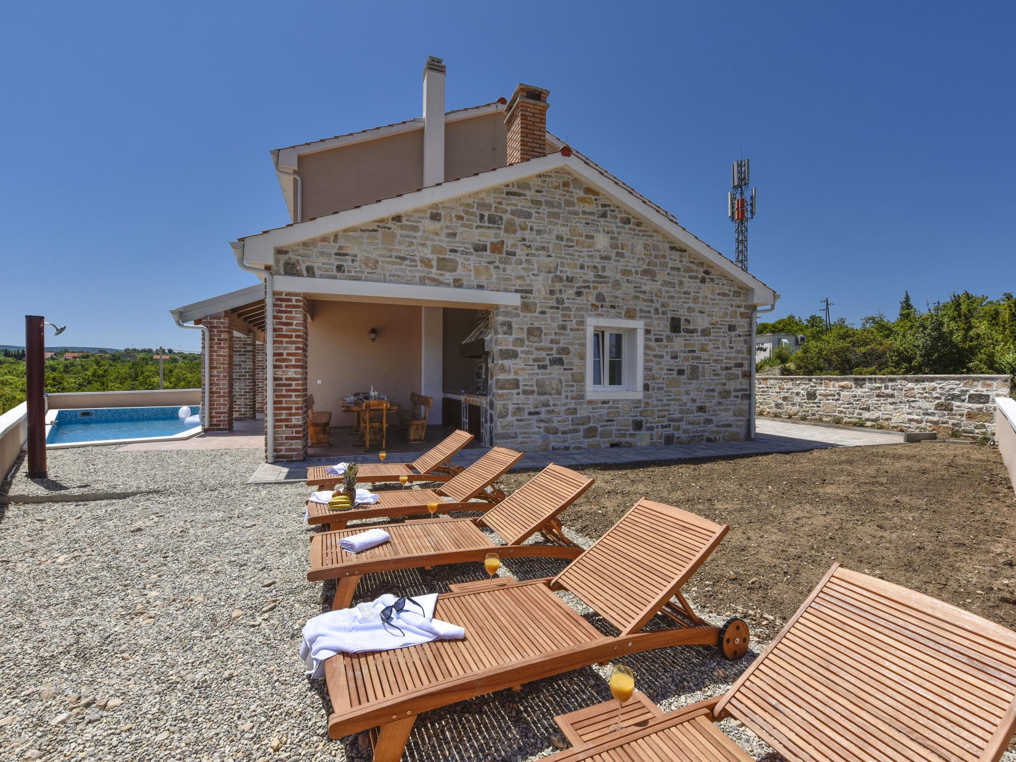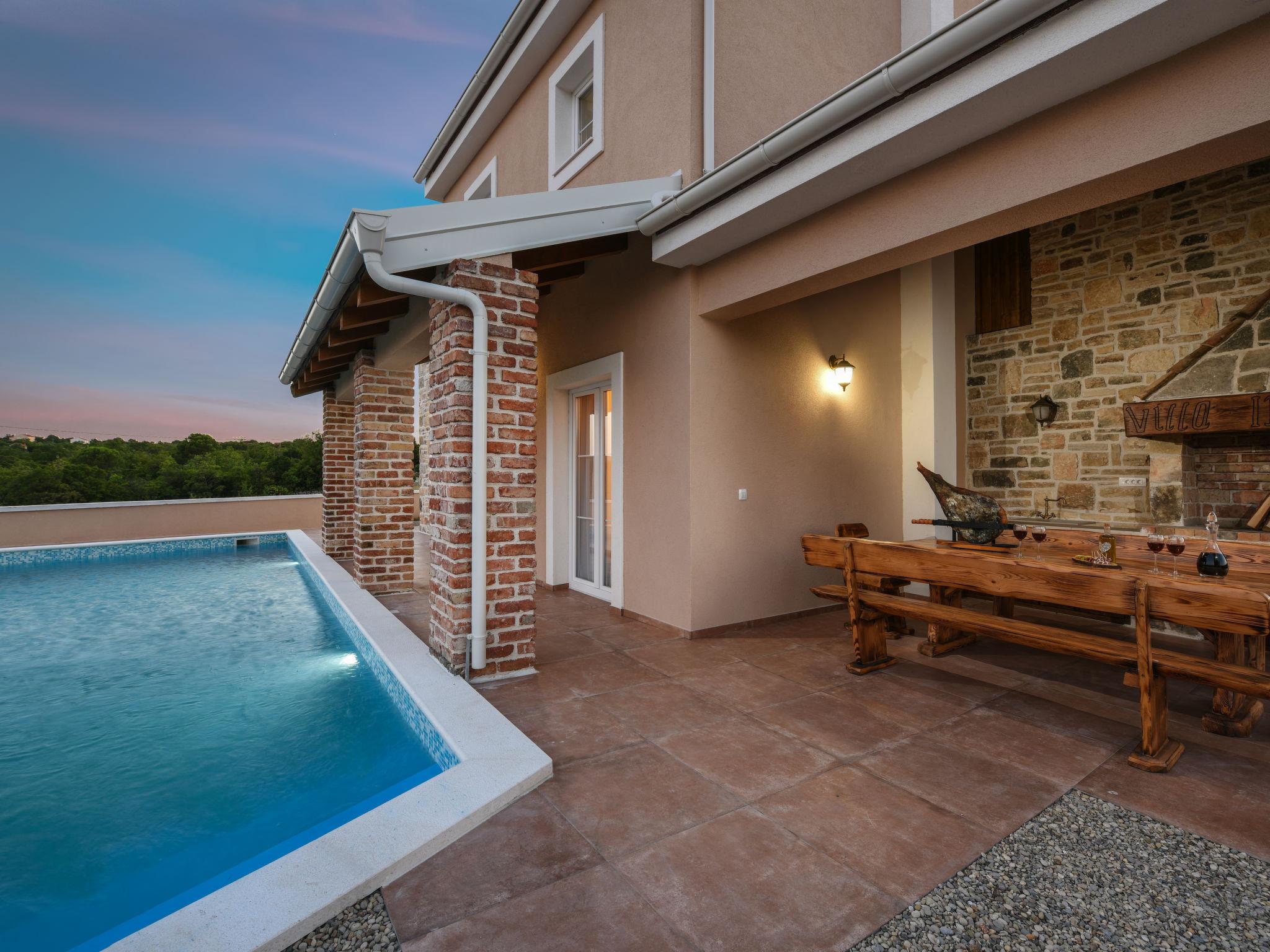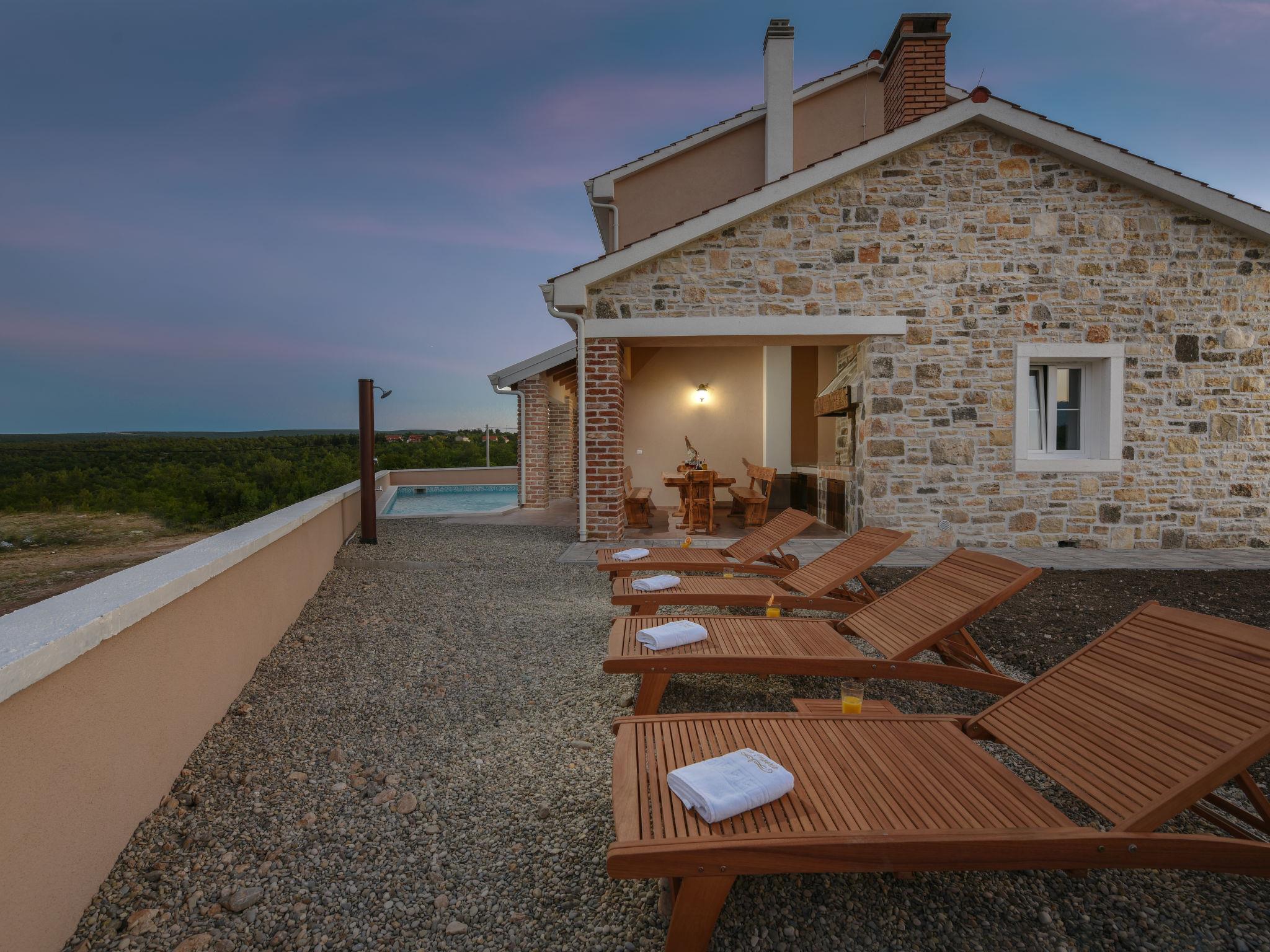 Pridraga 9 km from Novigrad: Single-family house "Imperia", 2 storeys, built in 2019. 2 km from the centre of Pridraga, in a quiet, sunny, elevated position, 800 m from the sea, 800 m from the beach. Private: property 500 m2 (fenced), swimming pool heated (44 m2, depth 140 cm, seasonal availability: 01.Jan. - 31.Dec.) with internal staircase. Unconventional pool shape. Outdoor shower, garden furniture, barbecue. In the house: internet access, washing machine, tumble dryer. Motor access to the house (20 m via unmade road). Parking (for 3 cars) at the house on the premises. Shop 2 km, restaurant 9 km, bus stop 15.8 km, pebble beach, concrete beach 800 m. By groups of young people double deposit is requested on arrival. Swimming pool heated (extra).