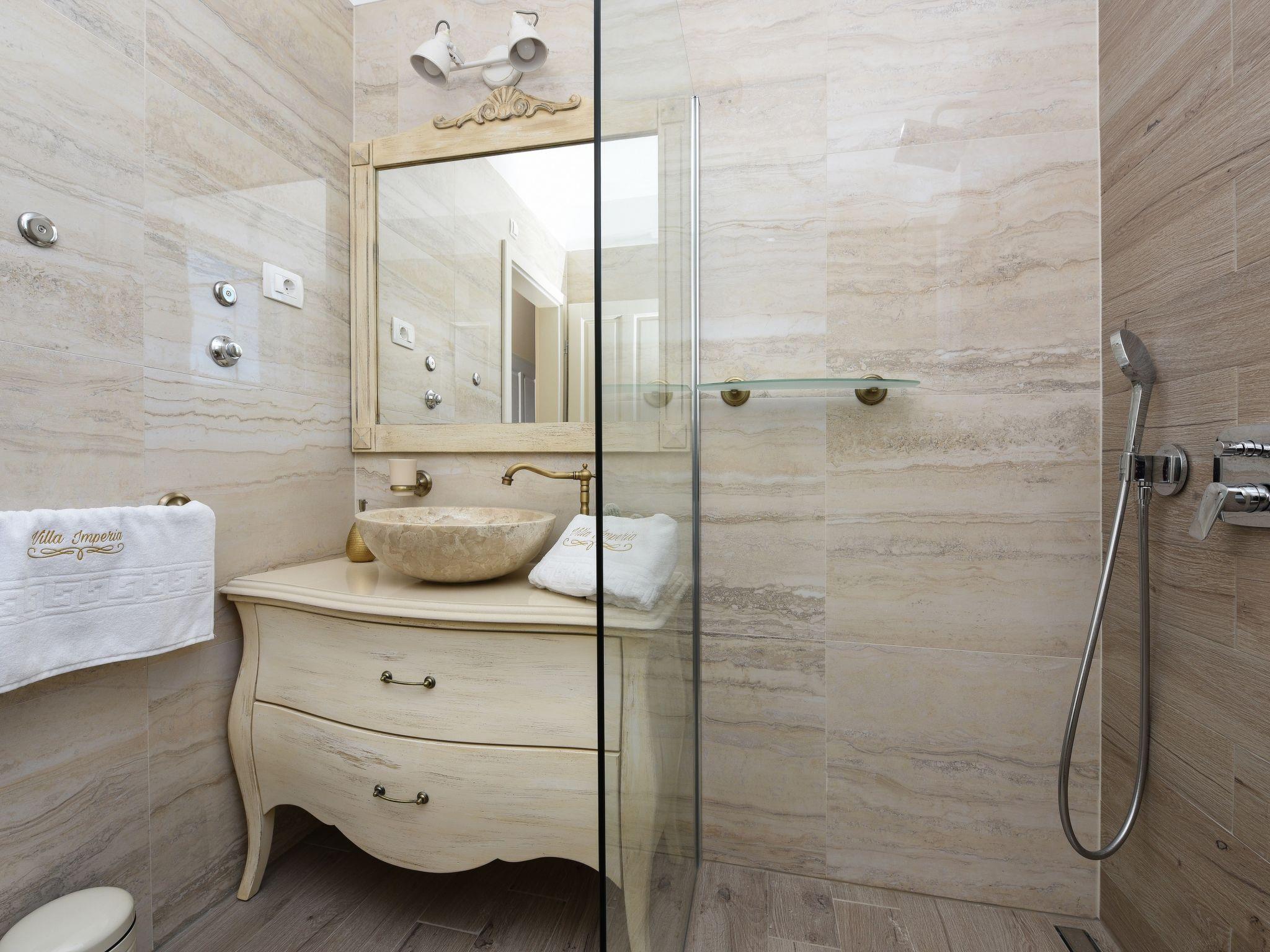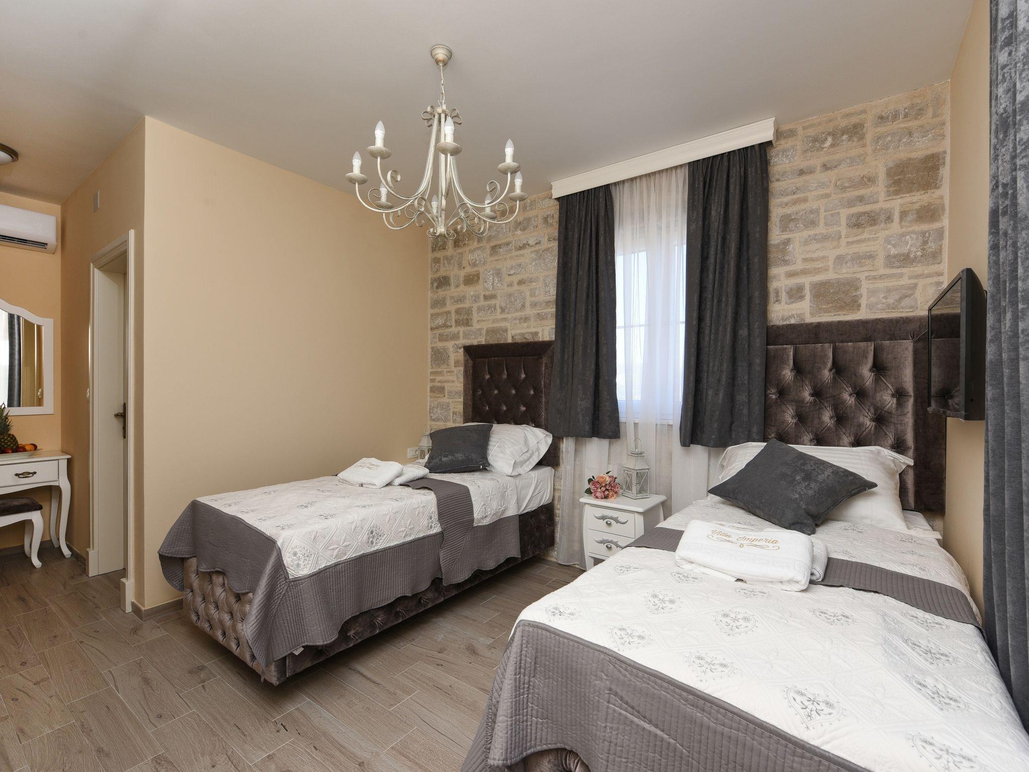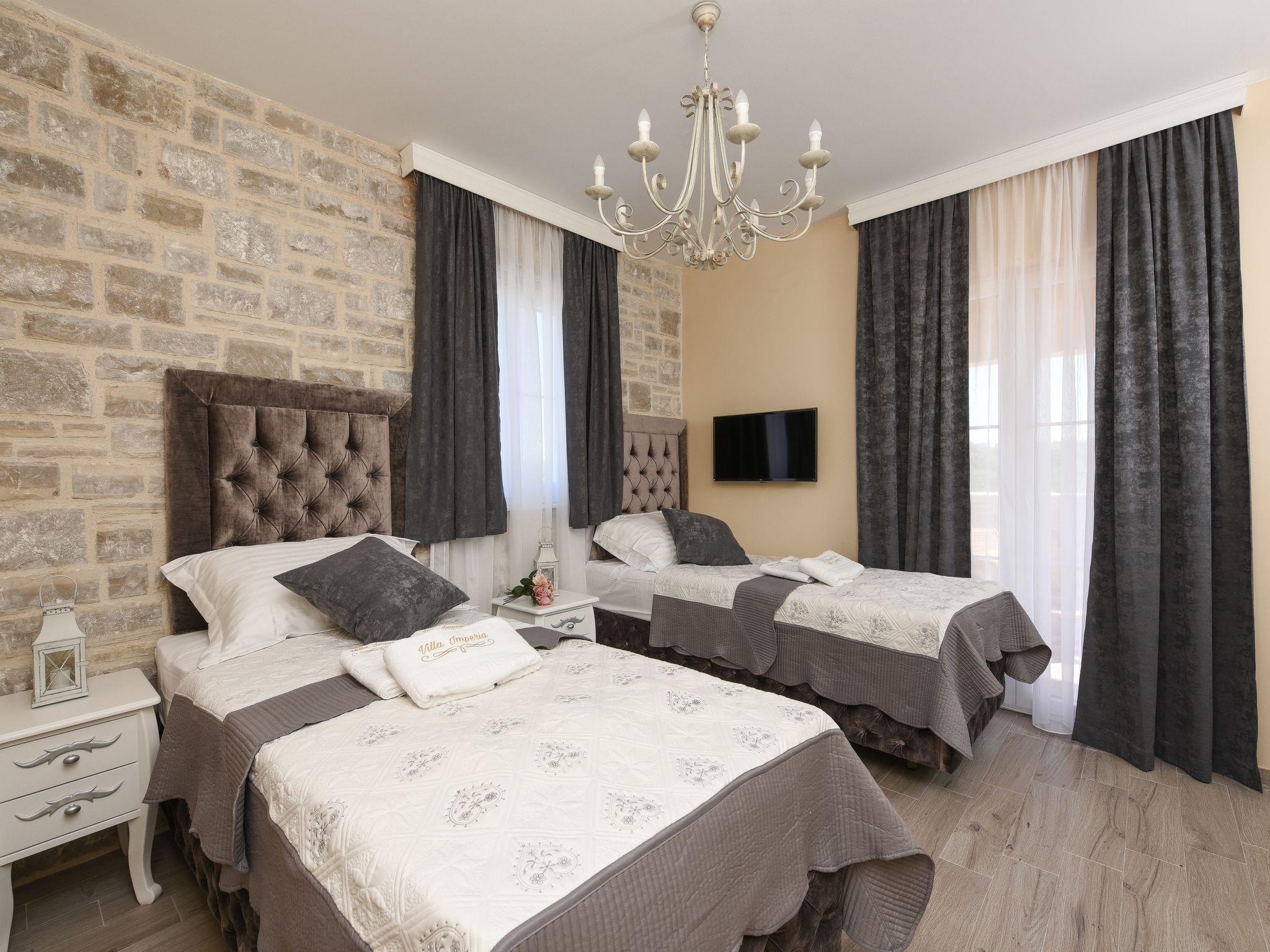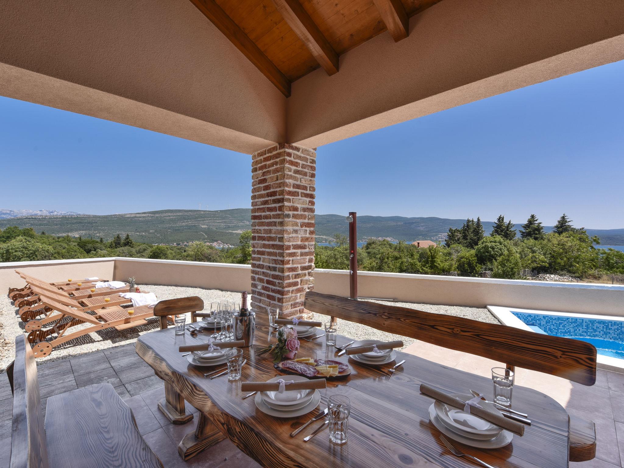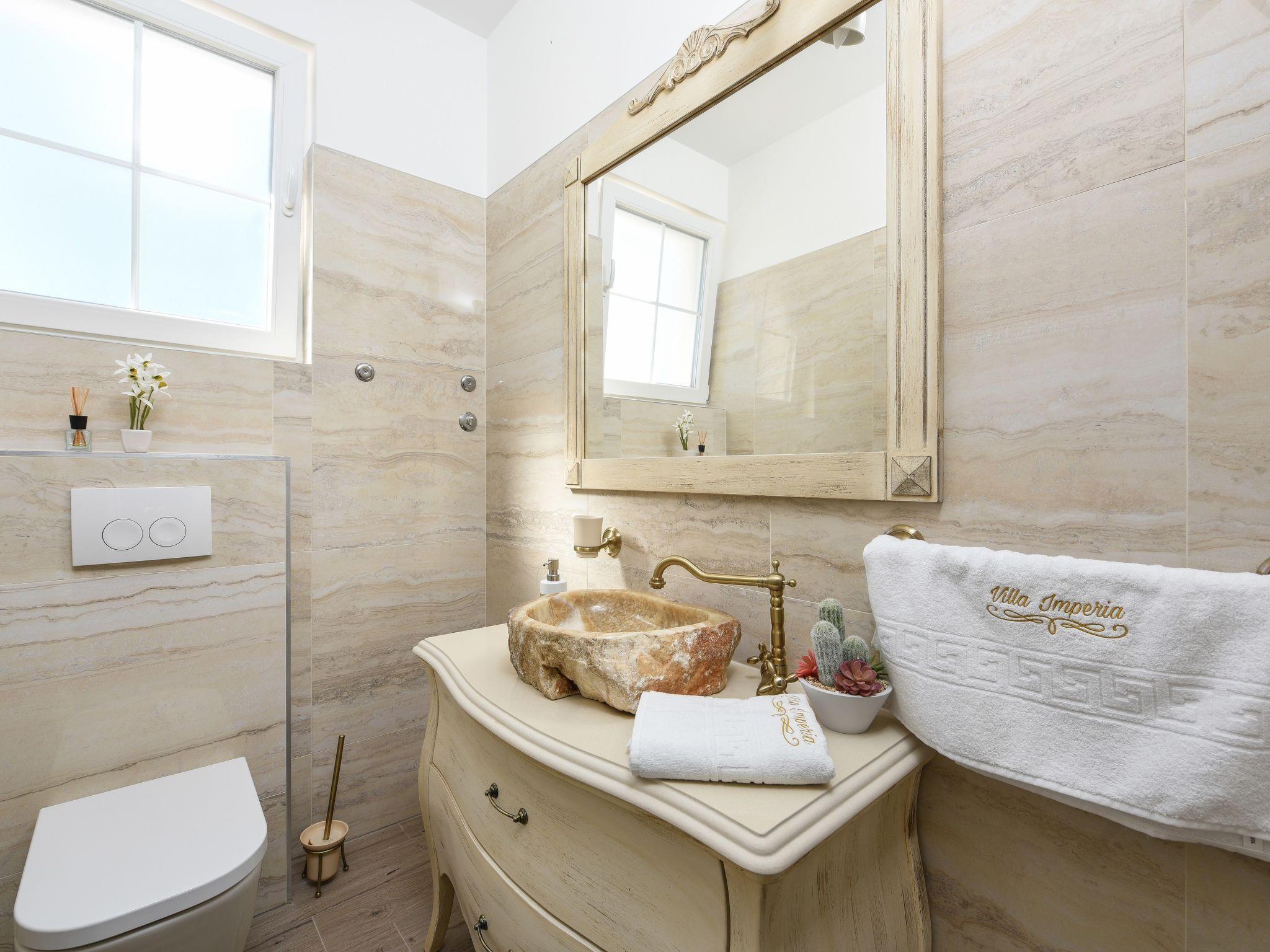Pridraga 9 km from Novigrad: Single-family house "Imperia", 2 storeys, built in 2019. 2 km from the centre of Pridraga, in a quiet, sunny, elevated position, 800 m from the sea, 800 m from the beach. Private: property 500 m2 (fenced), swimming pool heated (44 m2, depth 140 cm, seasonal availability: 01.Jan. - 31.Dec.) with internal staircase. Unconventional pool shape. Outdoor shower, garden furniture, barbecue. In the house: internet access, washing machine, tumble dryer. Motor access to the house (20 m via unmade road). Parking (for 3 cars) at the house on the premises. Shop 2 km, restaurant 9 km, bus stop 15.8 km, pebble beach, concrete beach 800 m. By groups of young people double deposit is requested on arrival. Swimming pool heated (extra).