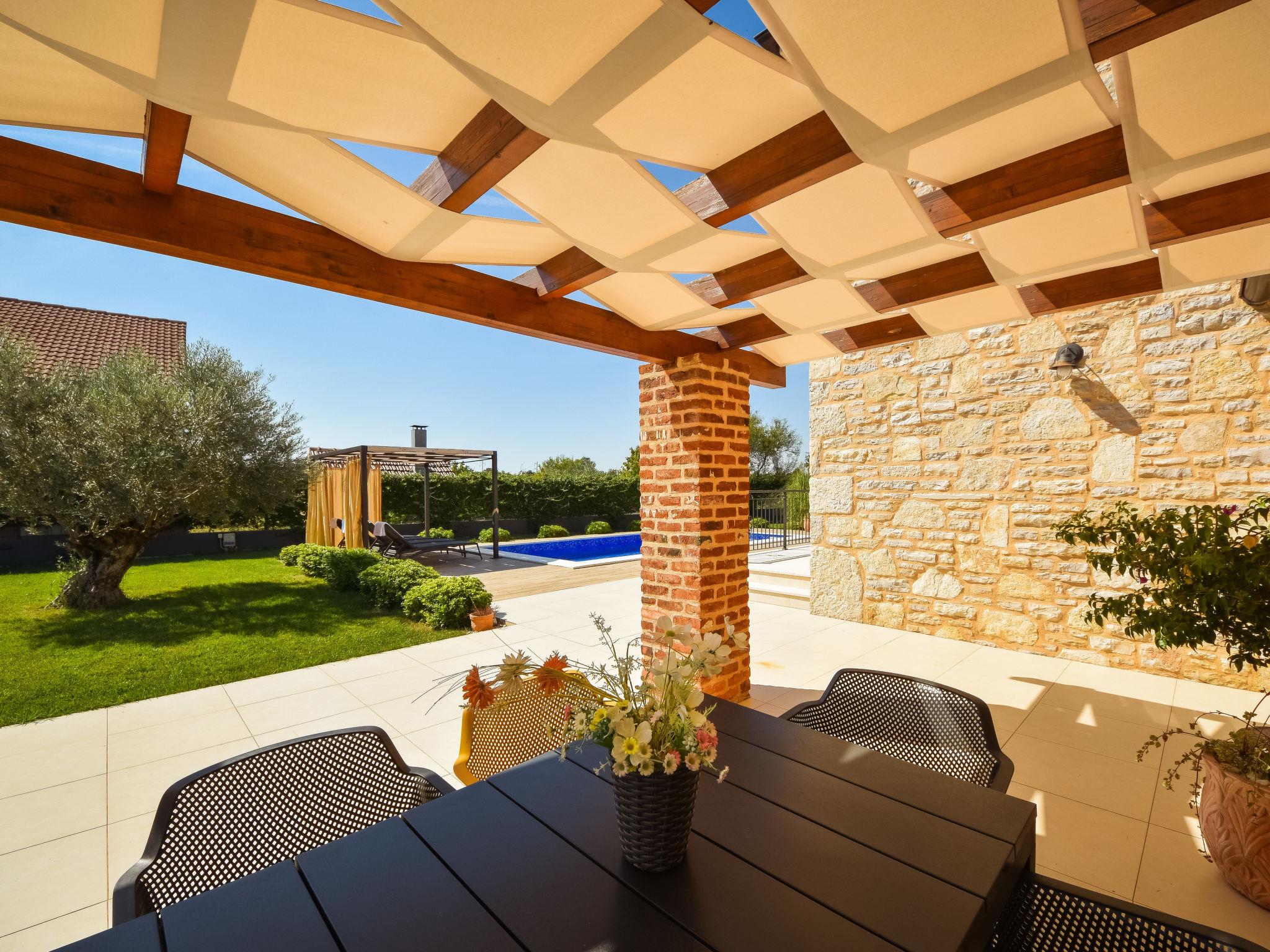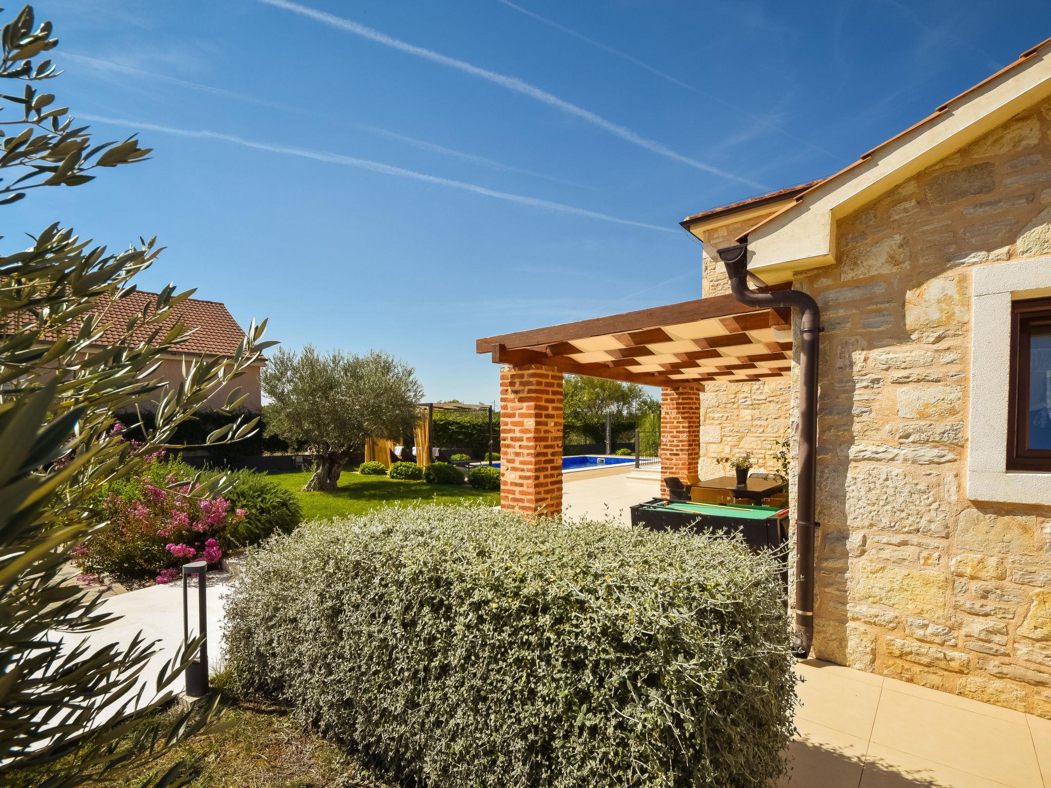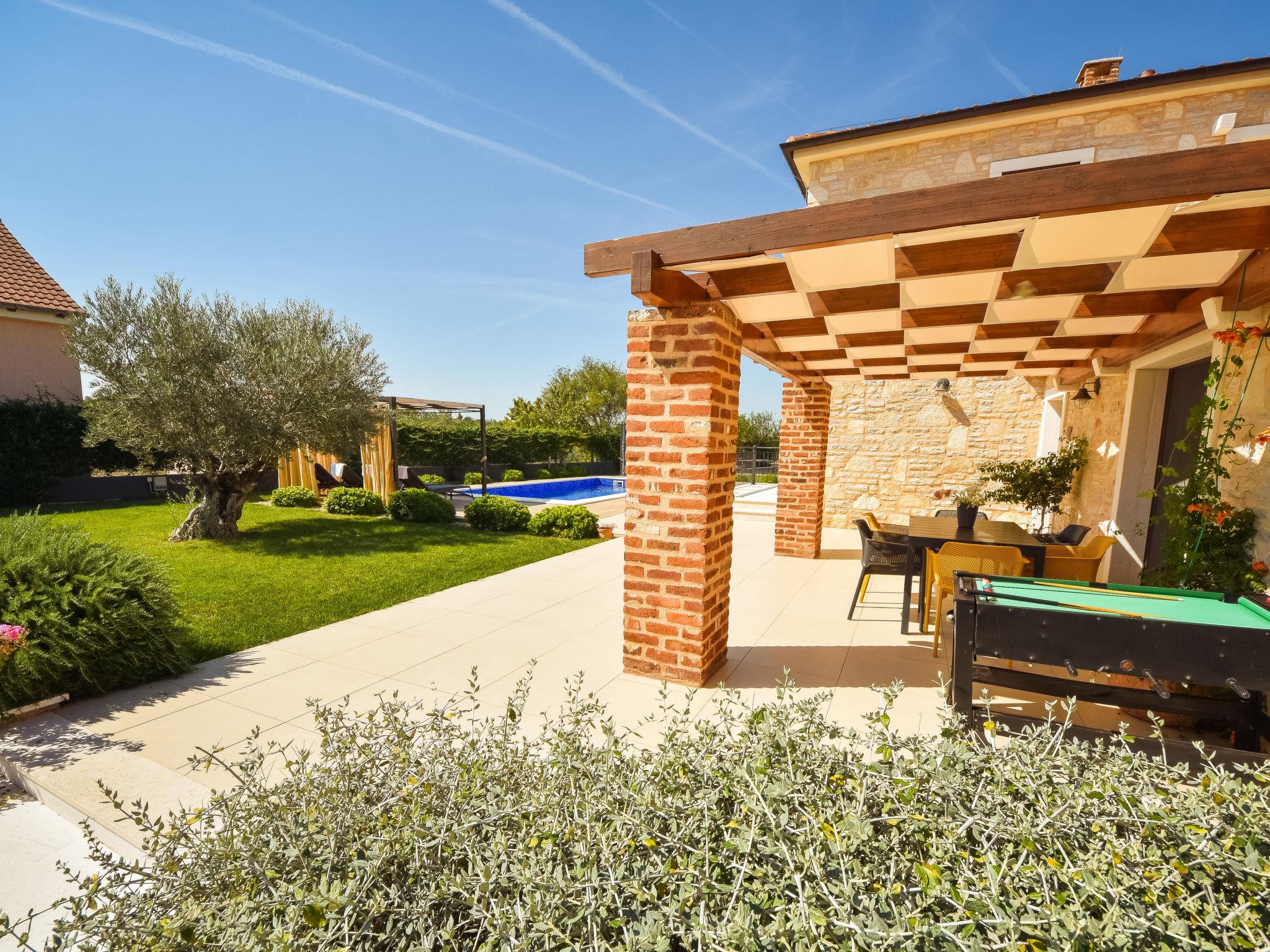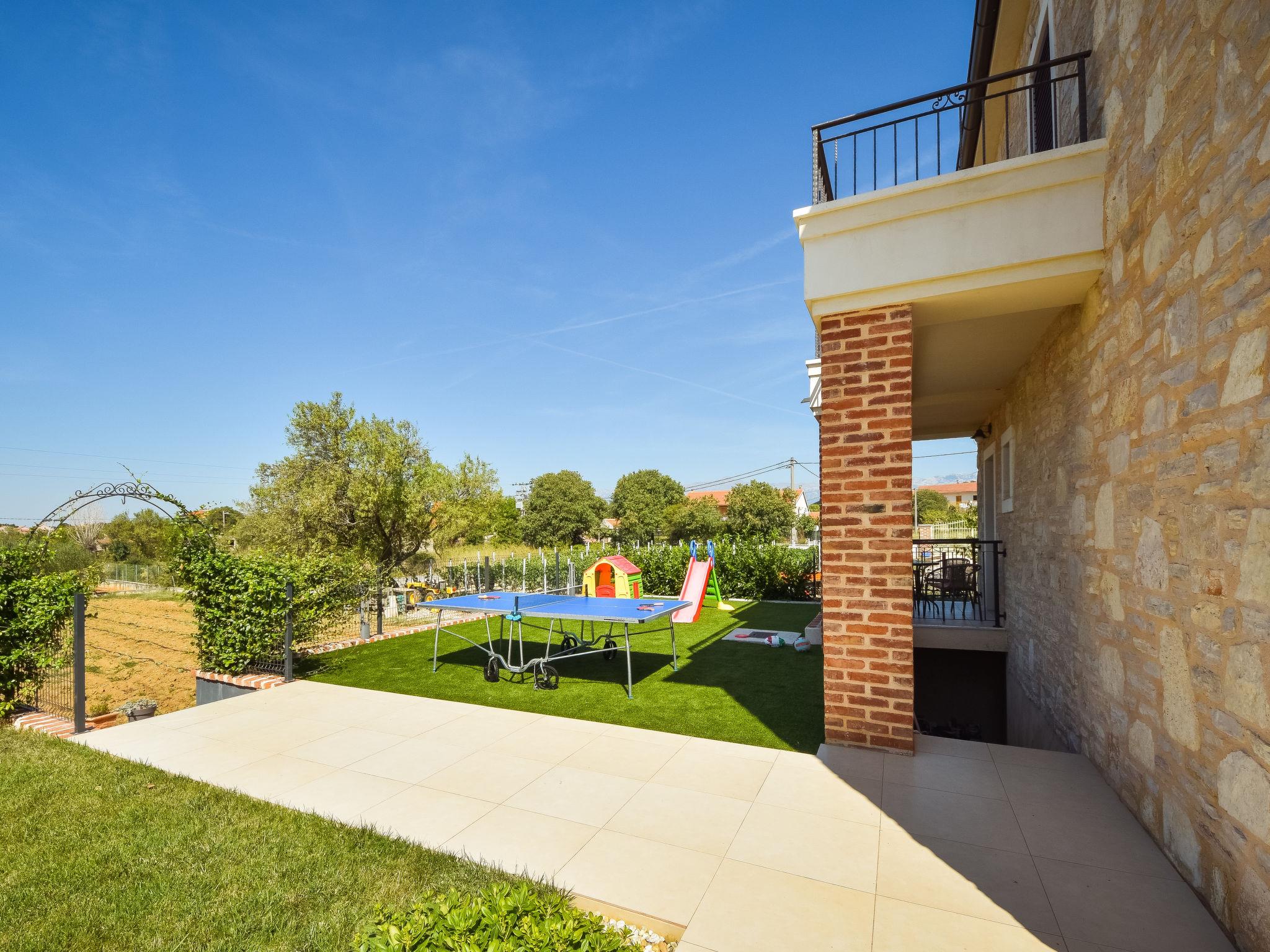 Pridraga: 2-family house "Korina", 2 storeys. 2 km from the centre of Pridraga, 5 km from the centre of Novigrad, in a quiet, sunny position, 2.5 km from the sea, 2.5 km from the beach. Private: property 1'500 m2 (fenced), lawn, swimming pool angular (8 x 4 m, depth 145 cm, seasonal availability: 01.May. - 01.Oct.) with internal staircase. Outdoor shower, garden furniture, barbecue house. In the house: internet access, air conditioning, washing machine. Parking (for 3 cars) at the house on the premises. Shop 2 km, restaurant 2 km, bus stop 14.6 km, pebble beach 2.5 km. Groups of teenagers on request only. Please note: airfield 25 km from the property. Barbecue house (open-hearth fireplace, 2 ceramic glass hob hotplates, 2 gas rings, dining table, air conditioning, shower/WC).