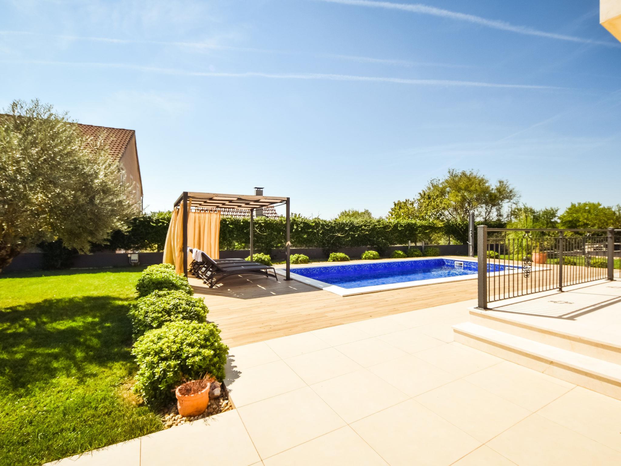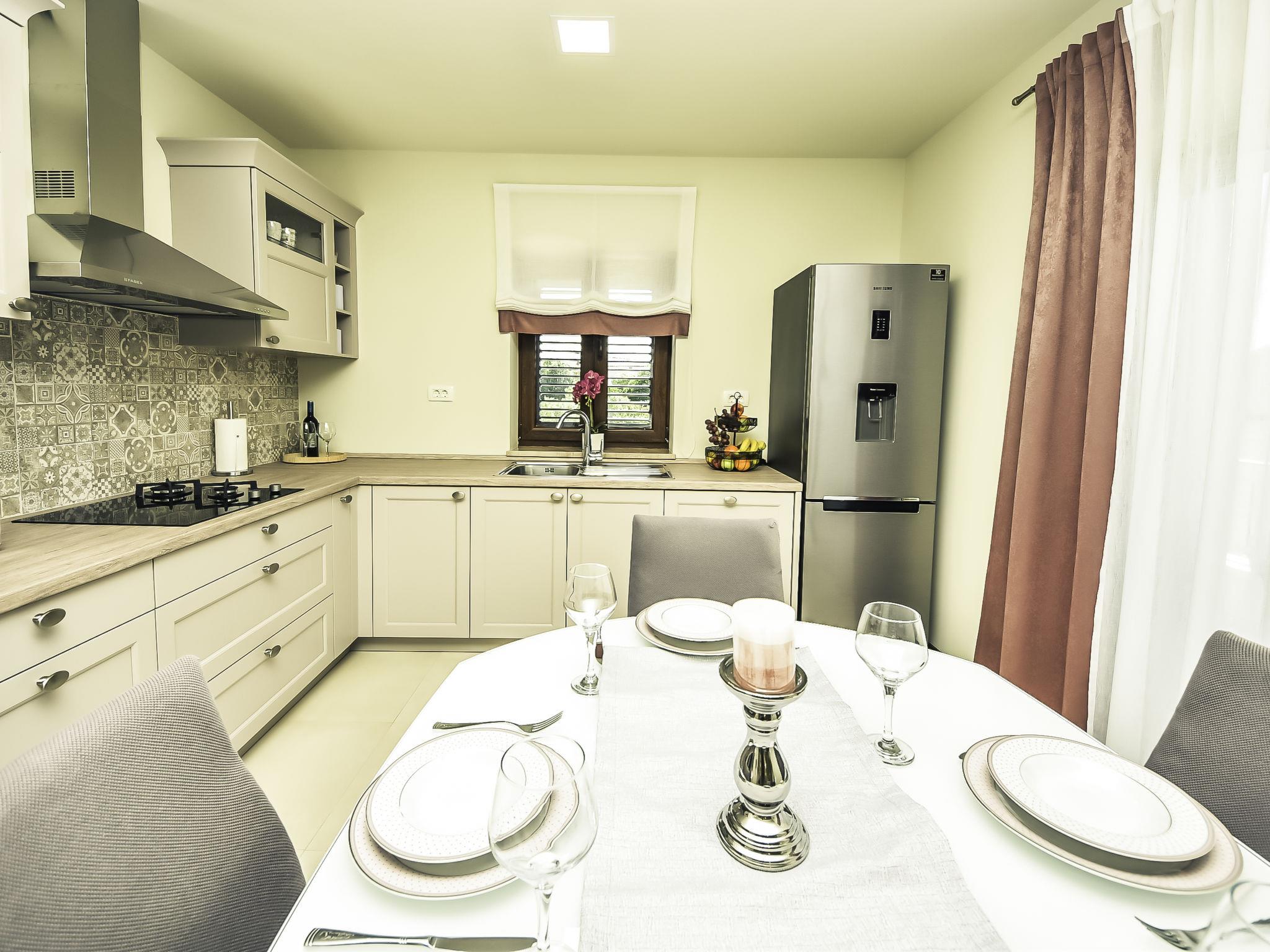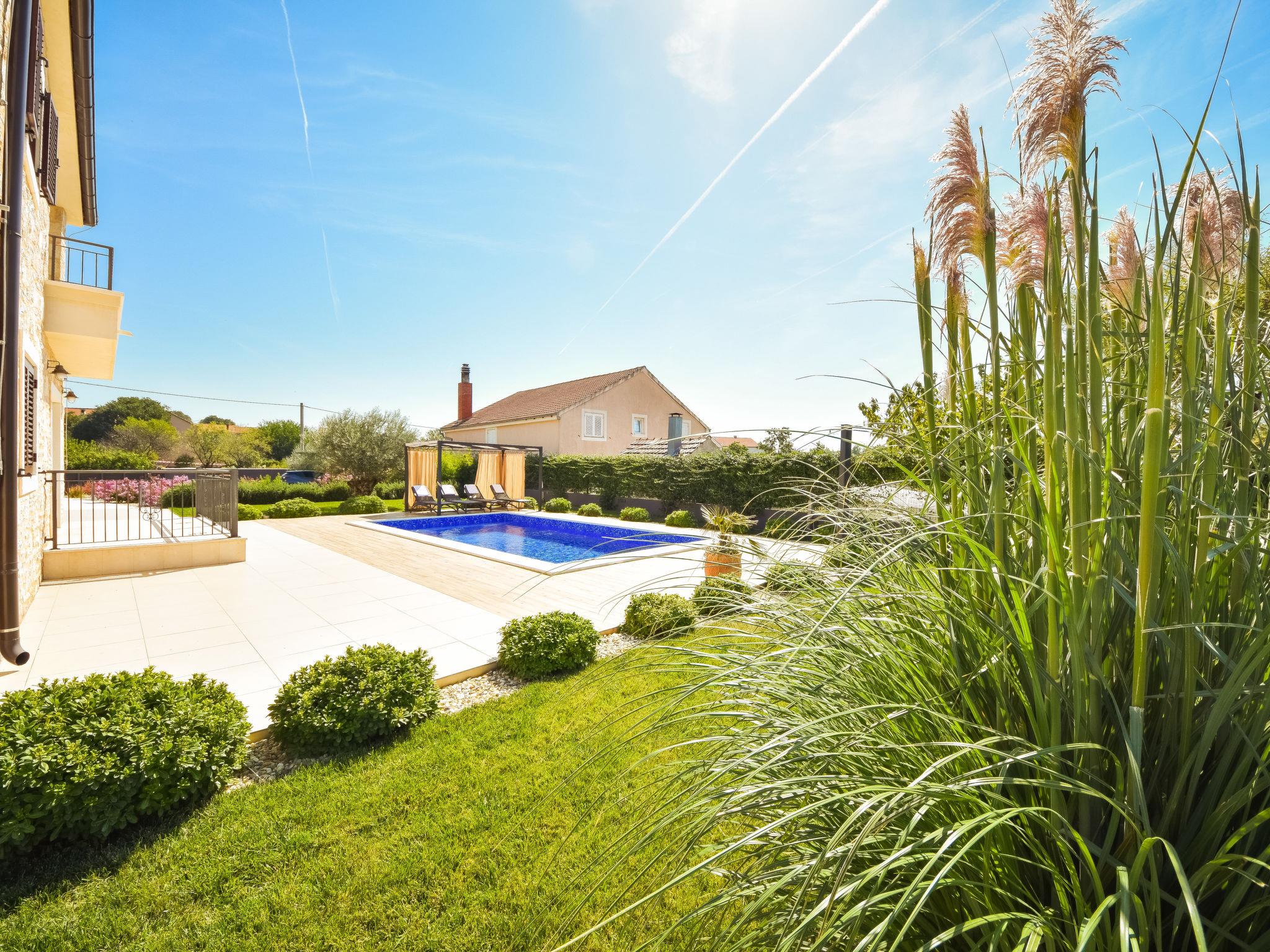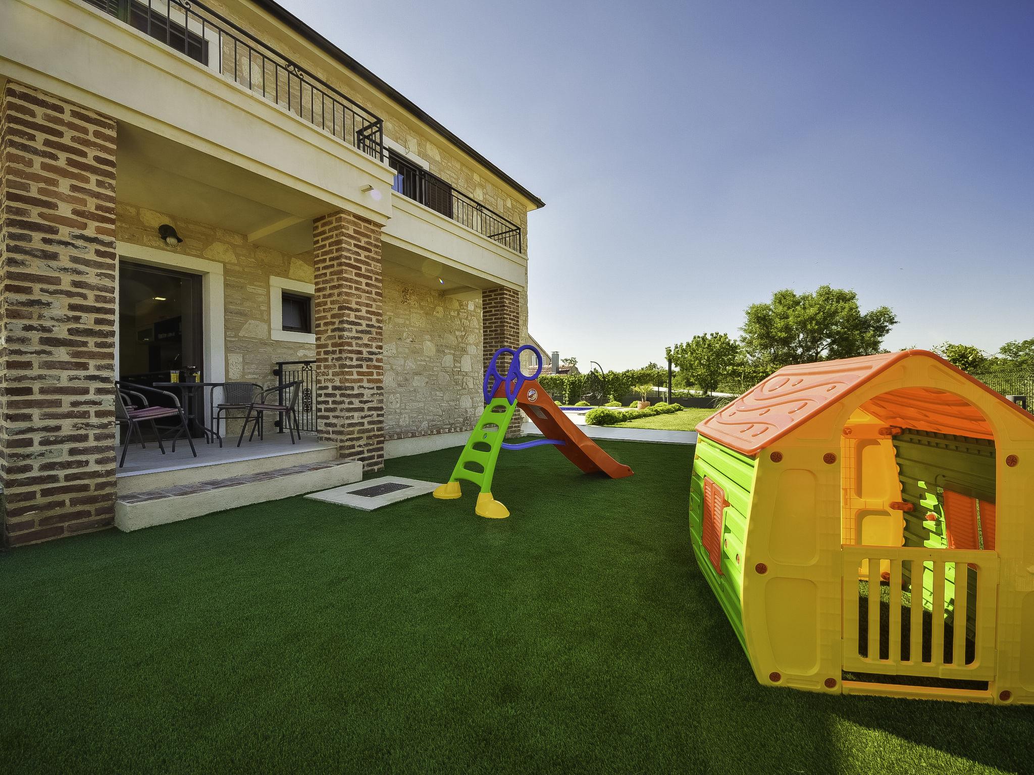 Pridraga: 2-family house "Korina", 2 storeys. 2 km from the centre of Pridraga, 5 km from the centre of Novigrad, in a quiet, sunny position, 2.5 km from the sea, 2.5 km from the beach. Private: property 1'500 m2 (fenced), lawn, swimming pool angular (8 x 4 m, depth 145 cm, seasonal availability: 01.May. - 01.Oct.) with internal staircase. Outdoor shower, garden furniture, barbecue house. In the house: internet access, air conditioning, washing machine. Parking (for 3 cars) at the house on the premises. Shop 2 km, restaurant 2 km, bus stop 14.6 km, pebble beach 2.5 km. Groups of teenagers on request only. Please note: airfield 25 km from the property. Barbecue house (open-hearth fireplace, 2 ceramic glass hob hotplates, 2 gas rings, dining table, air conditioning, shower/WC).