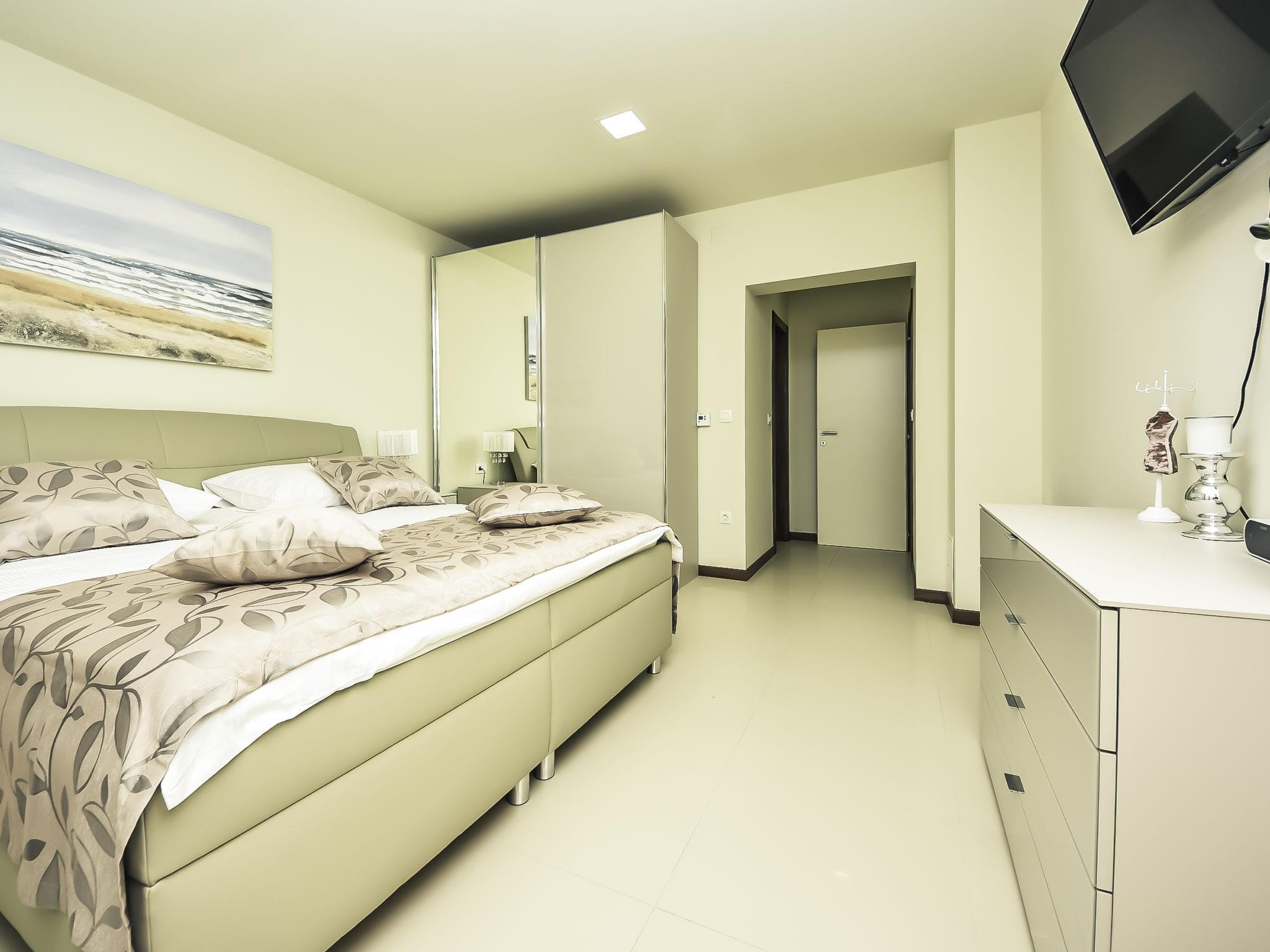 4-room house 180 m2 on 2 levels, south-west facing position. Living/dining room 30 m2 with 1 double sofabed (140 cm, length 200 cm), satellite TV (flat screen). Exit to the terrace. 1 room with 1 french bed (180 cm, length 200 cm), TV (flat screen). Open kitchen (oven, dishwasher, 4 ceramic glass hob hotplates, microwave, freezer, electric coffee machine). Shower/WC. Upper floor: 1 room 30 m2 with 1 french bed (160 cm, length 200 cm), air conditioning. Exit to the balcony. 1 room with 1 french bed (180 cm, length 200 cm), shower/WC and TV (flat screen). Open kitchen (oven, dishwasher, 2 ceramic glass hob hotplates, 2 gas rings, microwave, freezer, electric coffee machine). No heating option. Balcony 20 m2, terrace 20 m2. Terrace furniture, deck chairs. View of the swimming pool. Facilities: safe, hair dryer. Internet (WiFi, free).