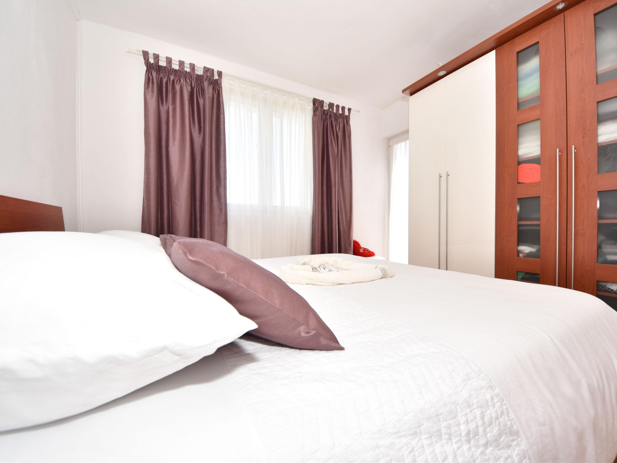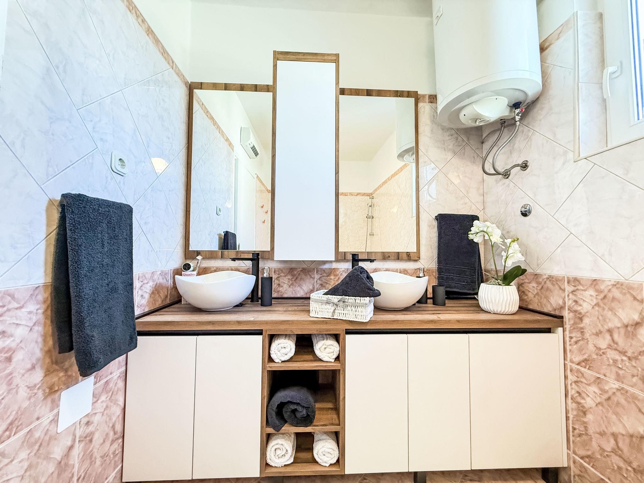 4-room house 100 m2, north-west facing position. Living/dining room 45 m2 with satellite TV (flat screen), air conditioning. Exit to the terrace. Entrance hall with air conditioning. 2 rooms, each room with 1 french bed (180 cm, length 200 cm), air conditioning. 1 room with 1 french bed (160 cm, length 200 cm), air conditioning. Open kitchen (1 hot plate, oven, dishwasher, 3 gas rings, freezer). Bath/WC, shower/WC. No heating option. Terrace 20 m2, roofed. Terrace furniture. Facilities: baby cot. Internet (WiFi, free).