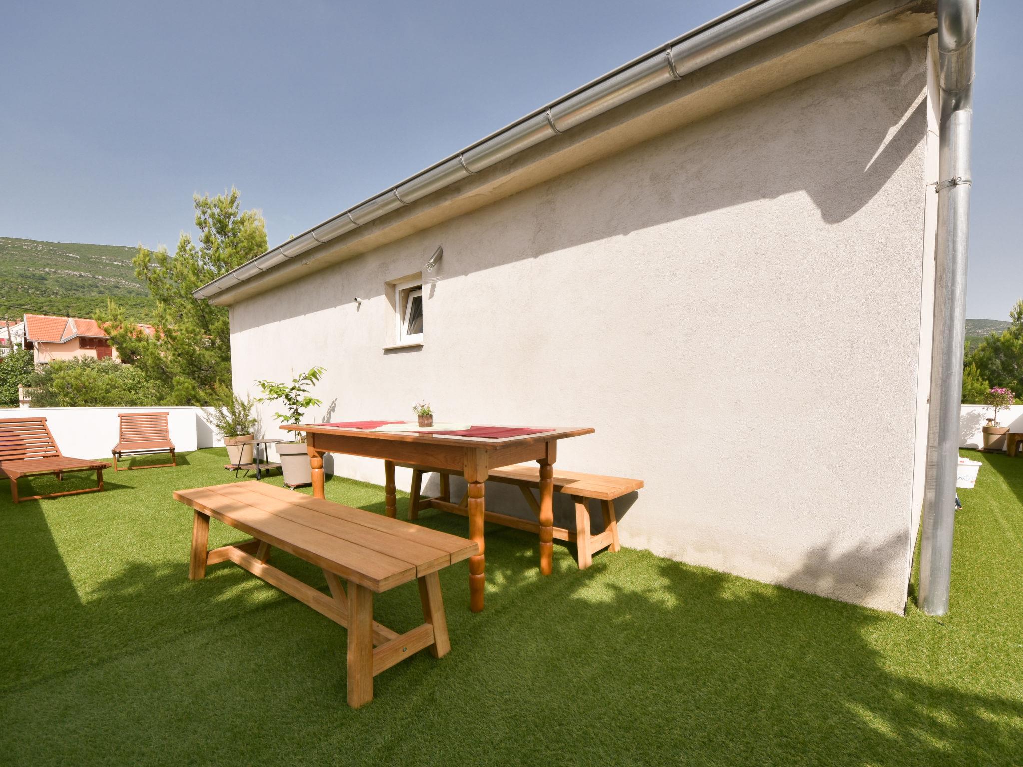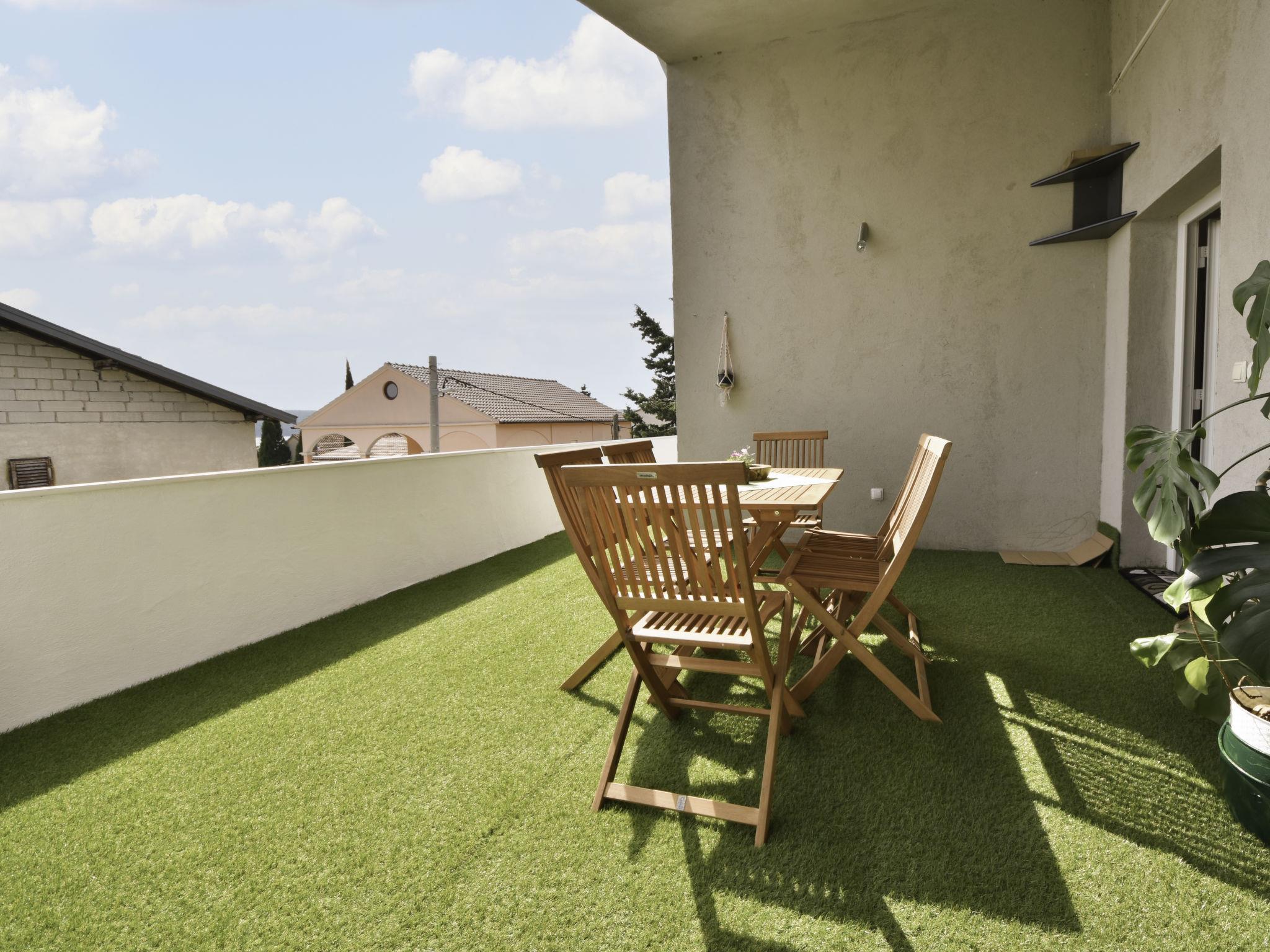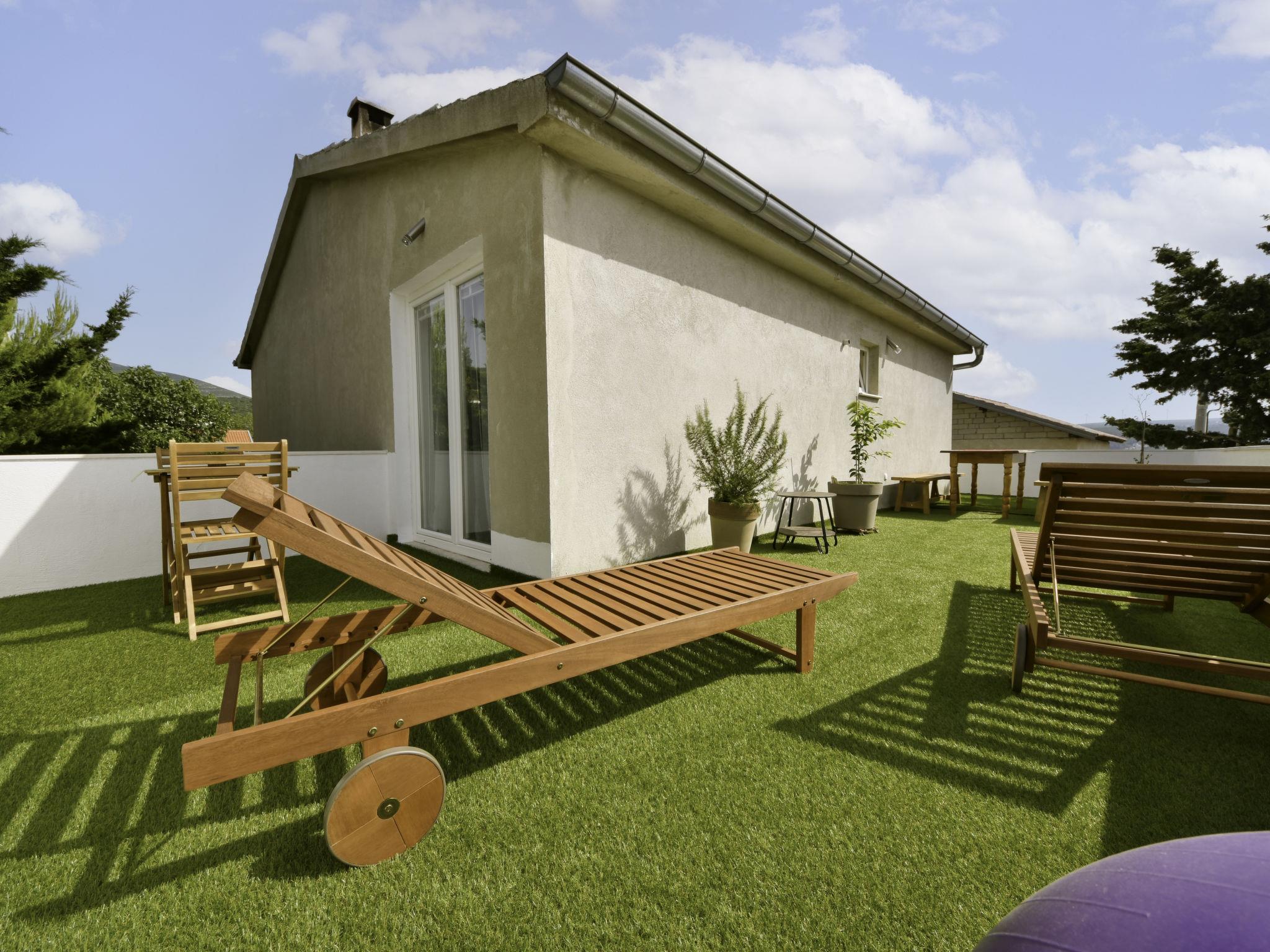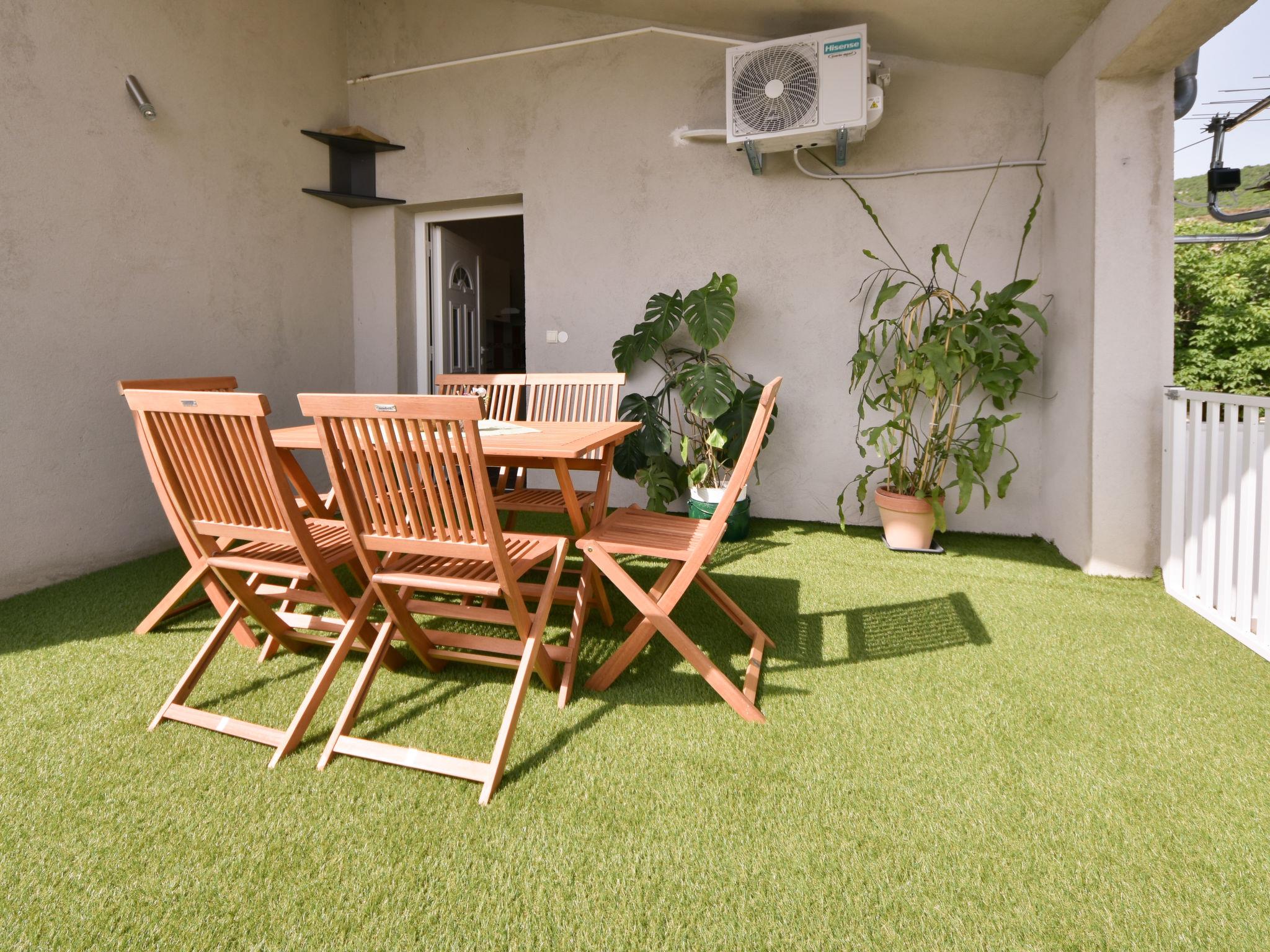 3-room apartment 55 m2 on 1st floor. Beautiful furnishings: living/dining room 35 m2 with TV (flat screen), heating stove and air conditioning. 1 room with 1 french bed (160 cm, length 200 cm). 1 room with 2 beds (90 cm, length 200 cm). Open kitchen (oven, 4 induction hot plates, toaster, kettle, microwave, freezer, electric coffee machine). Shower/WC. Electric heating, wood heating, forced-air heating. Terrace 80 m2. Terrace furniture, deck chairs. Partial distant view of the sea. Facilities: washing machine, hair dryer. Internet (WiFi, free).