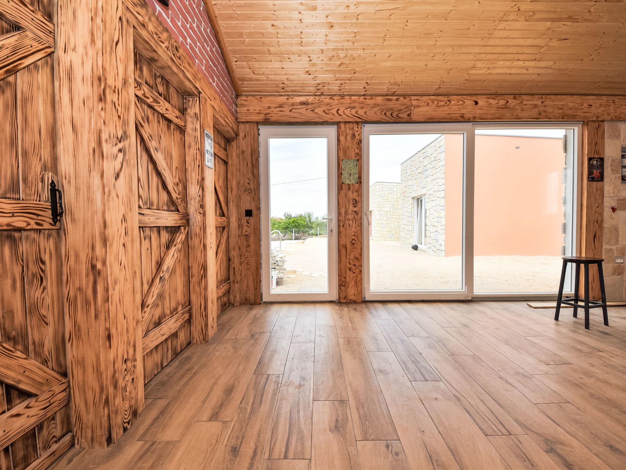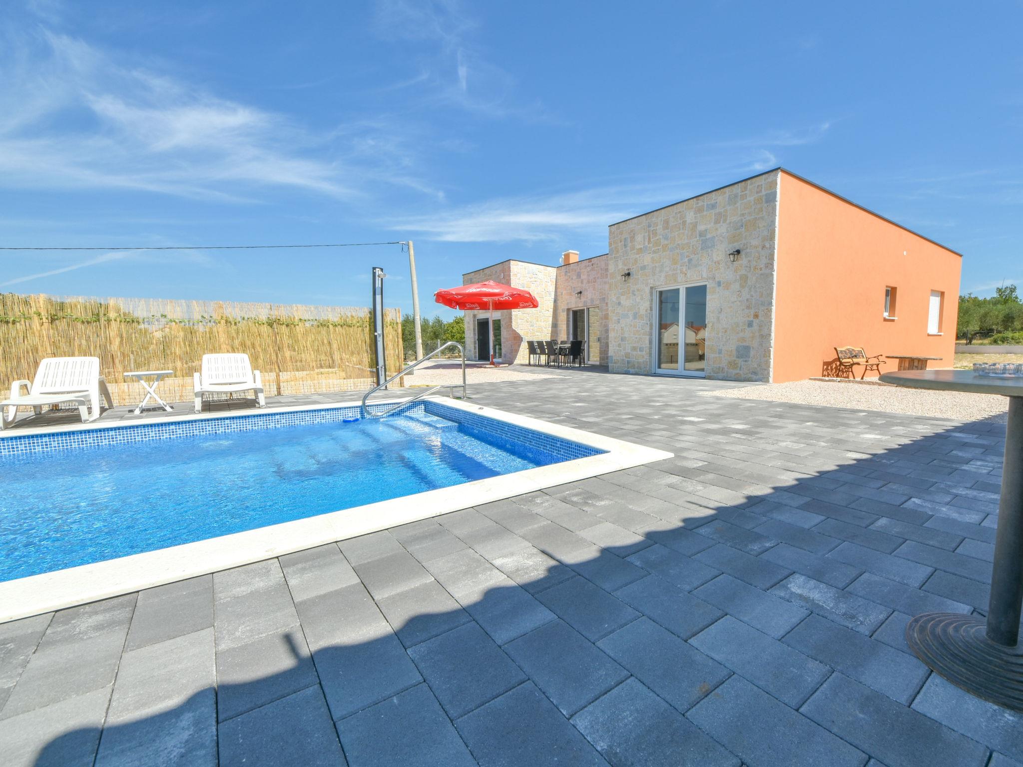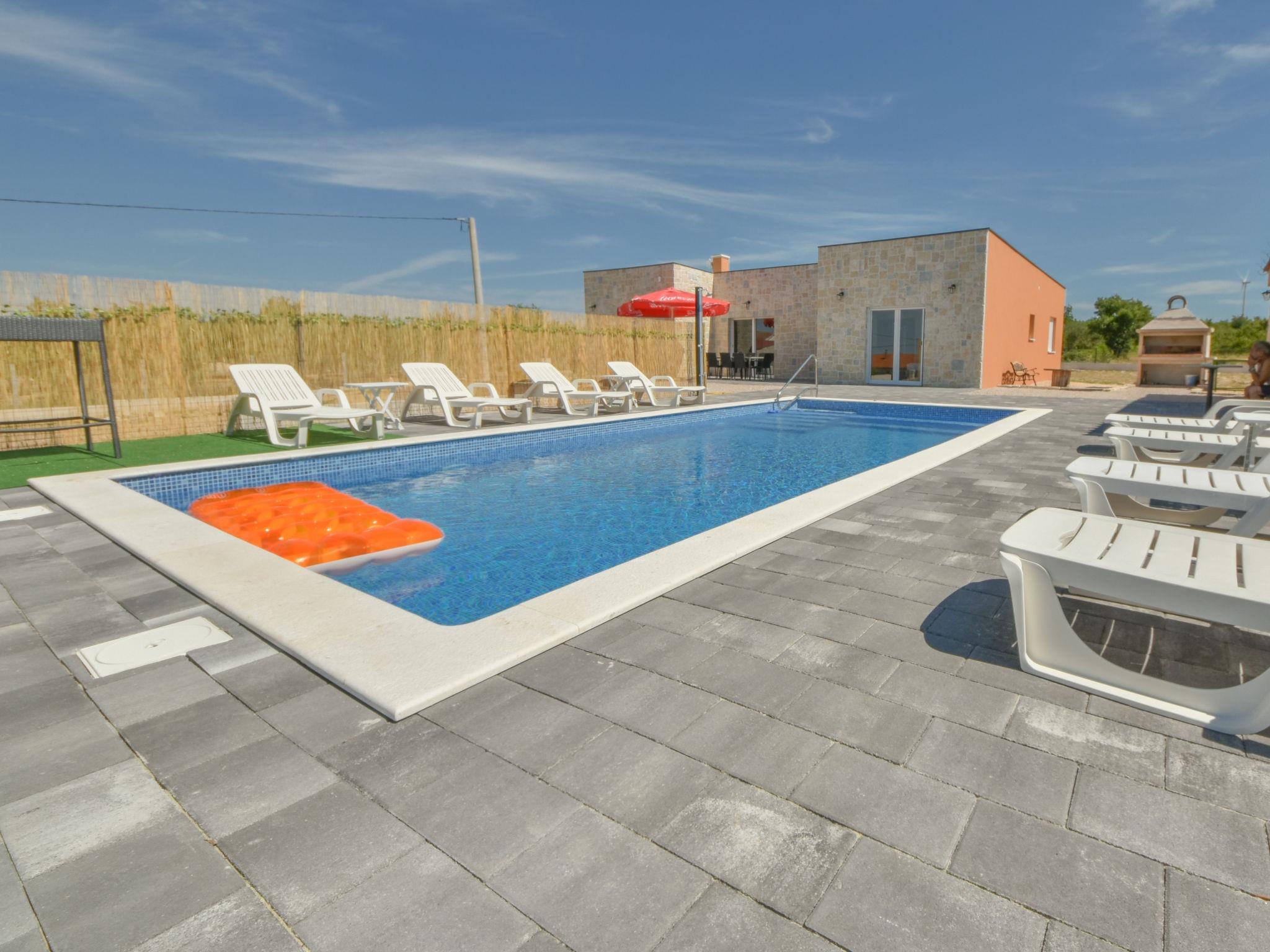 Korlat 13 km from Novigrad: Modern single-family house "Vulelija Holiday Home", built in 2024. 11 km from the centre of Benkovac, 100 m from the edge of the forest, 16 km from the sea. Private: natural state property 5'000 m2, swimming pool angular, heated (8 x 4 m, depth 145 cm, seasonal availability: 01.May. - 01.Oct.). Outdoor shower, terrace (20 m2), garden furniture, barbecue, barbecue house. In the house: internet access, washing machine. Parking (for 4 cars) on the premises. Shop 11 km, restaurant 13 km, bus stop 16.6 km, pebble beach 16 km.