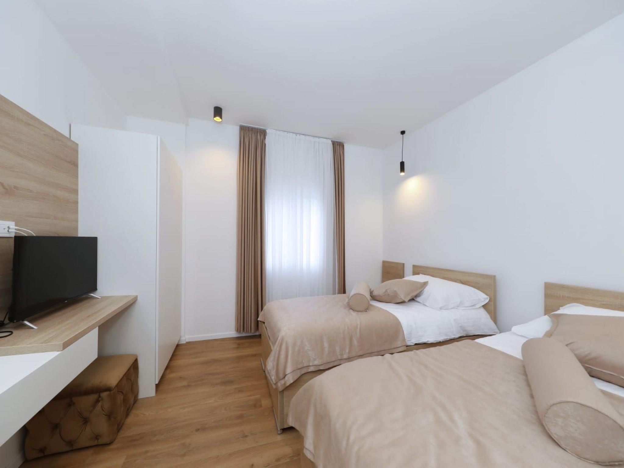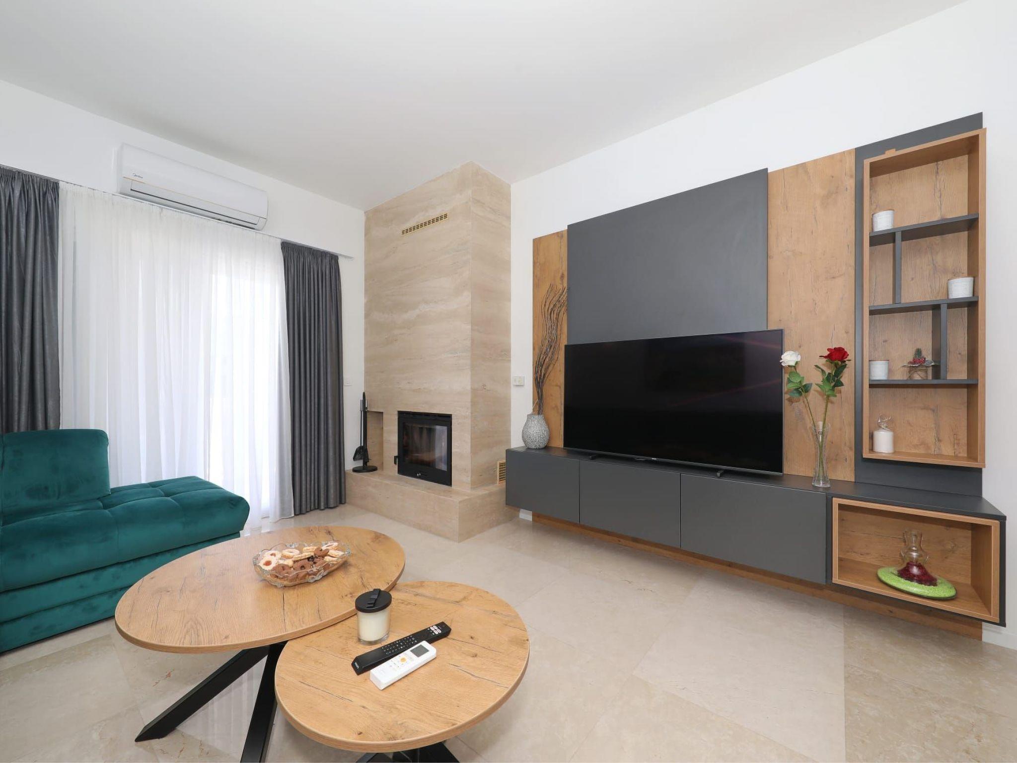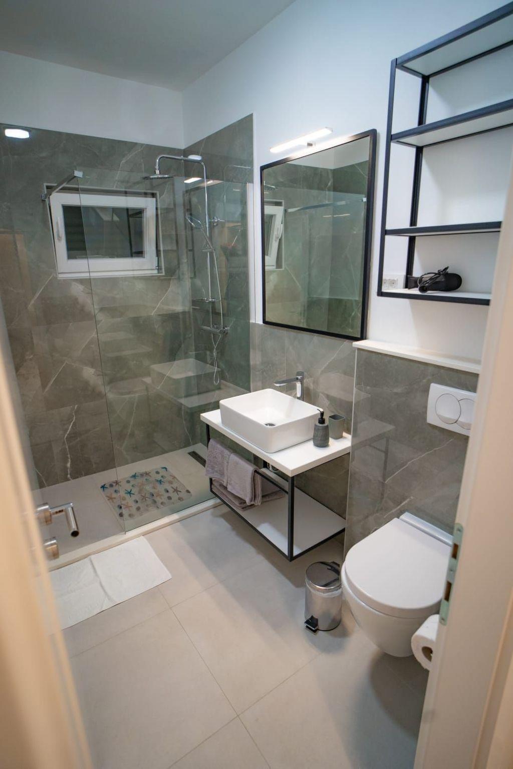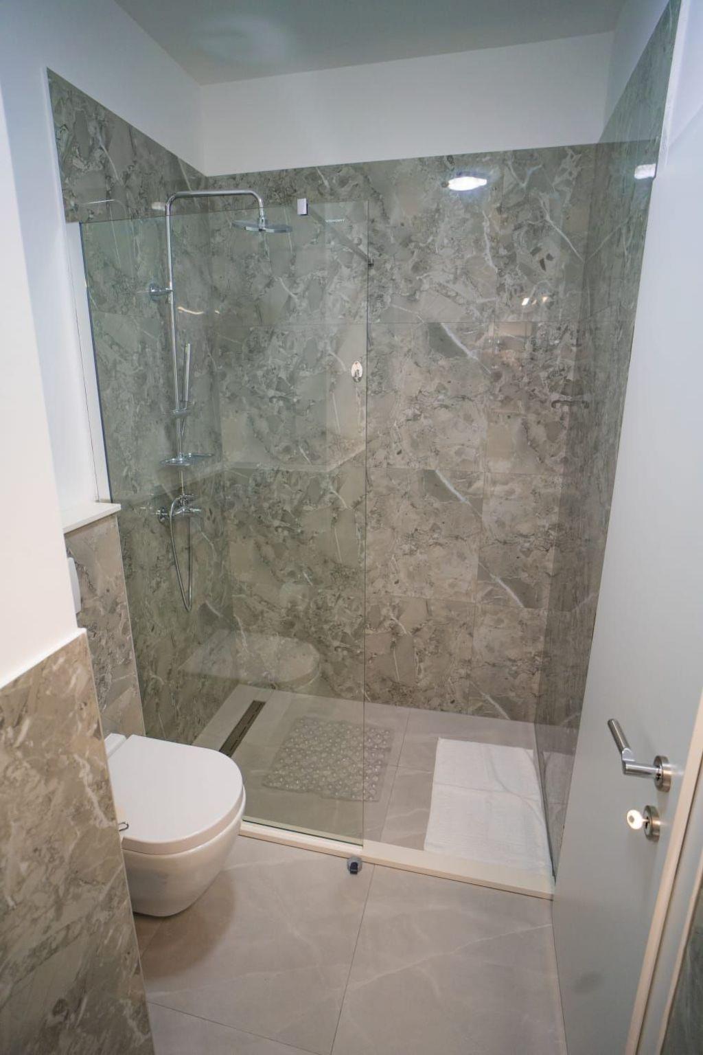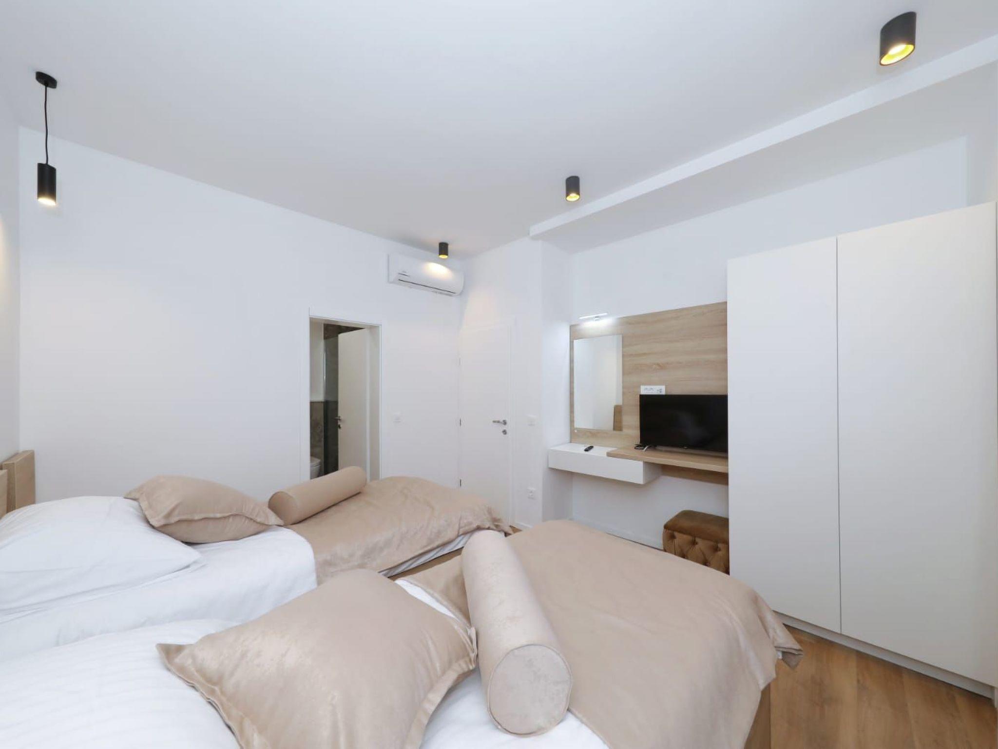 Step inside to discover a haven of comfort and convenience. The ground floor welcomes you with a fully equipped kitchen, seamlessly transitioning into a cozy dining area and a spacious living room. A toilet and a terrace further enhance the ground-floor’s appeal, ensuring every need is catered for. As you ascend to the first floor, each of the five bedrooms reveals itself, complete with en-suite bathrooms and individual terraces. Comfort is paramount, with air conditioning and a TV provided in each bedroom, alongside a living room designed to be a cool retreat during those warm Dalmatian days.