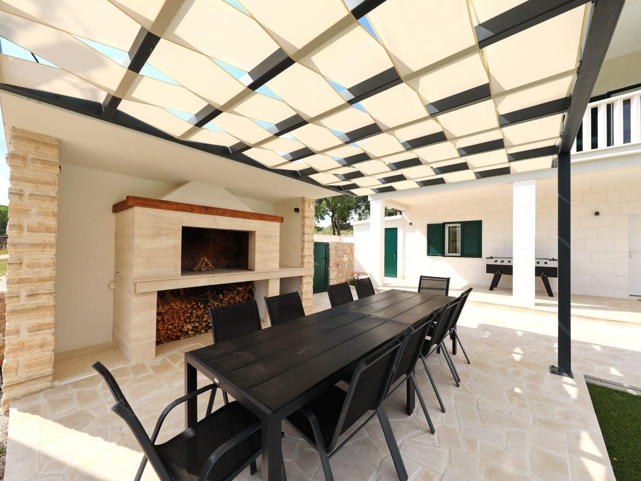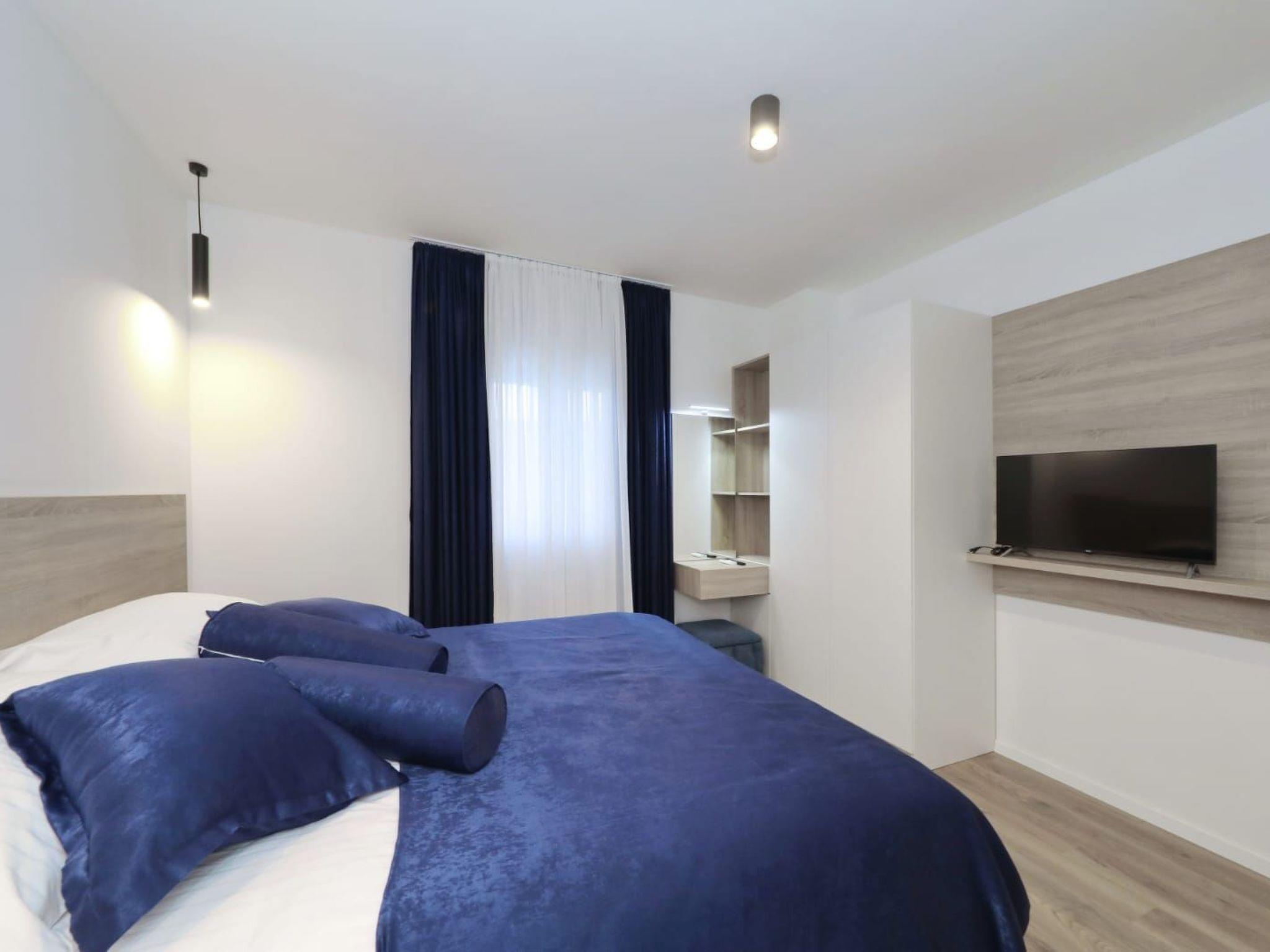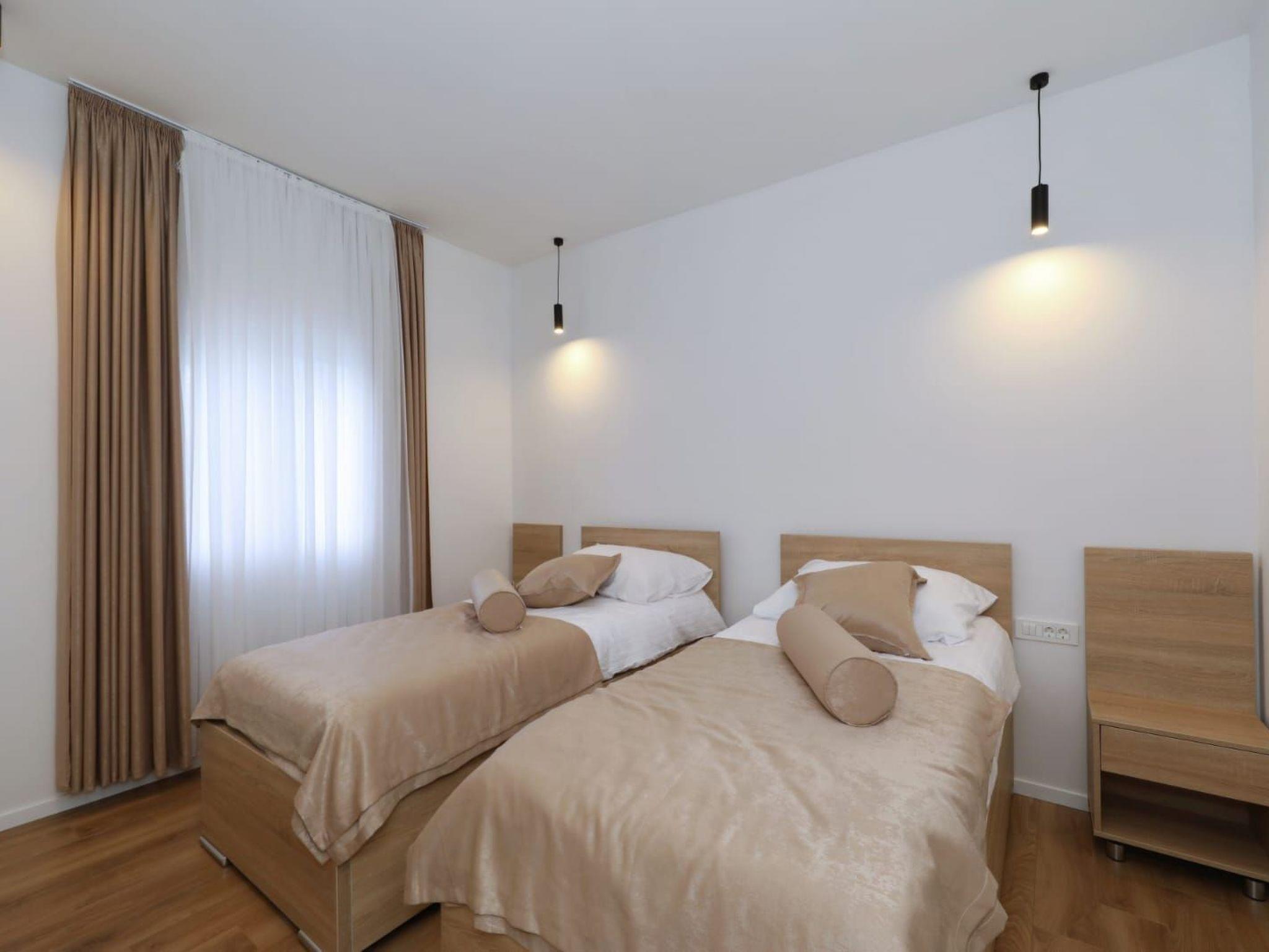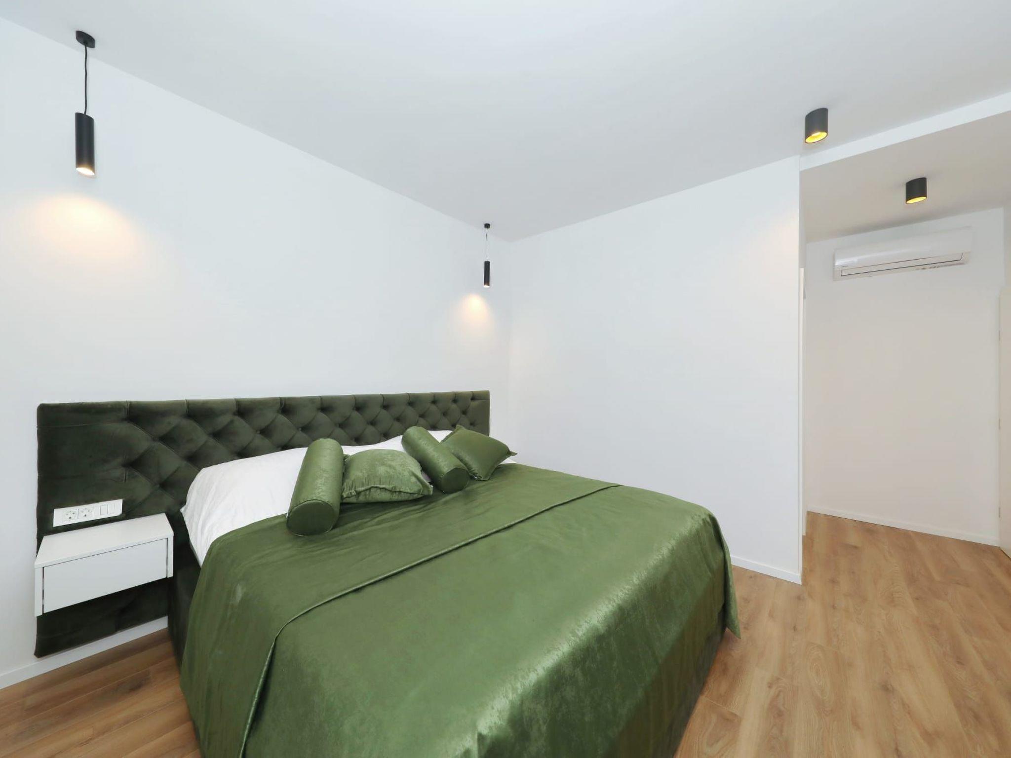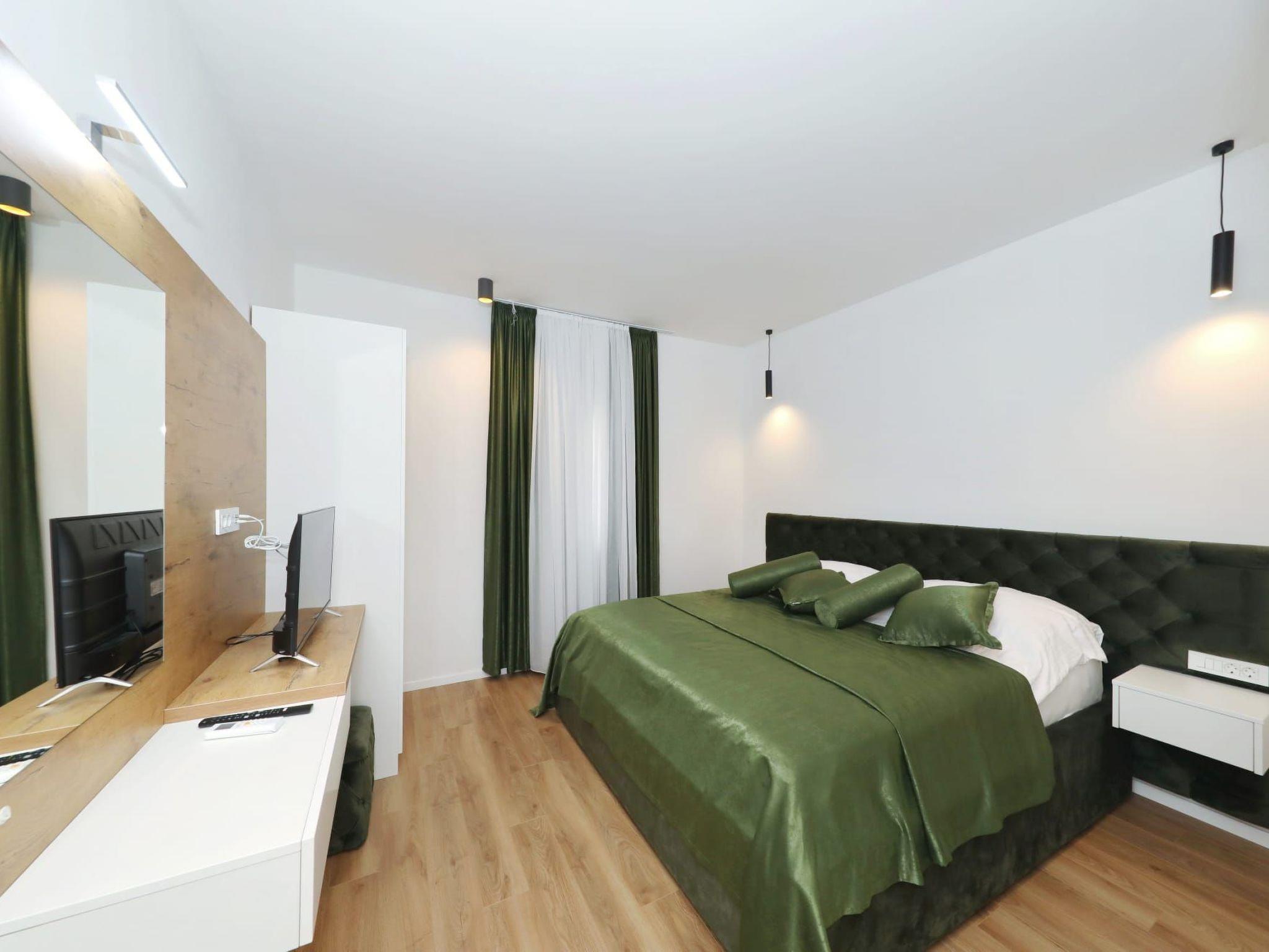 Step inside to discover a haven of comfort and convenience. The ground floor welcomes you with a fully equipped kitchen, seamlessly transitioning into a cozy dining area and a spacious living room. A toilet and a terrace further enhance the ground-floor’s appeal, ensuring every need is catered for. As you ascend to the first floor, each of the five bedrooms reveals itself, complete with en-suite bathrooms and individual terraces. Comfort is paramount, with air conditioning and a TV provided in each bedroom, alongside a living room designed to be a cool retreat during those warm Dalmatian days.