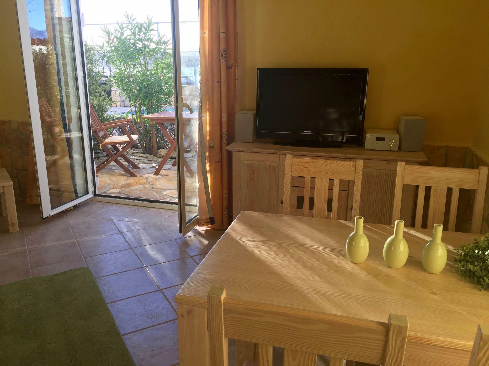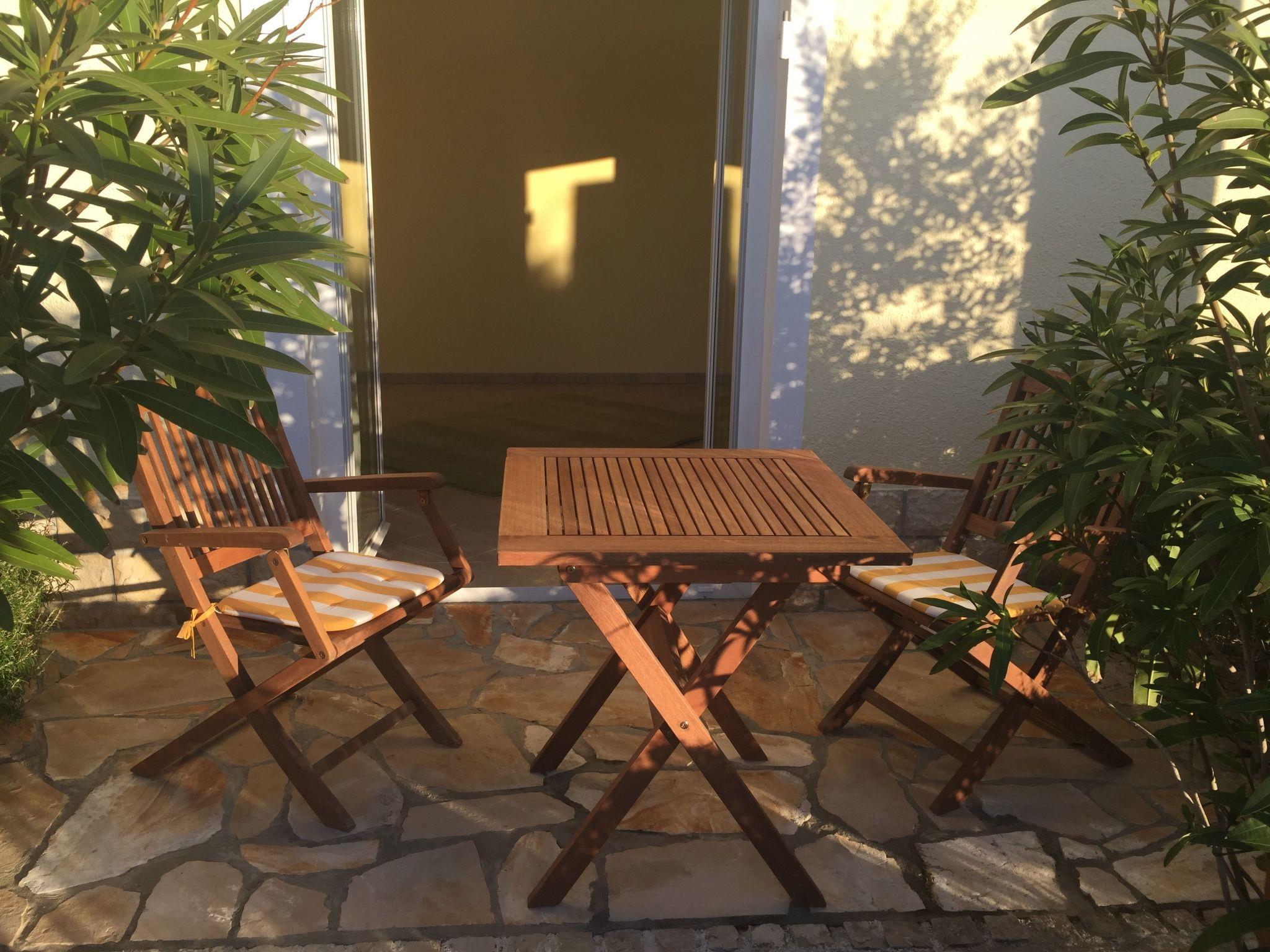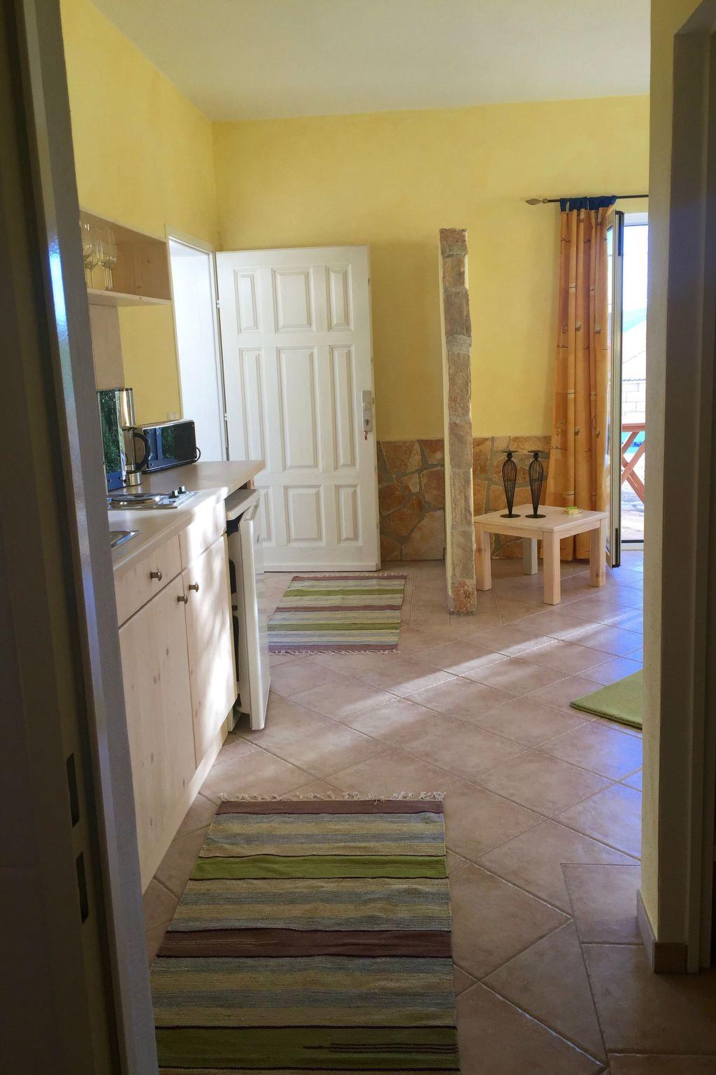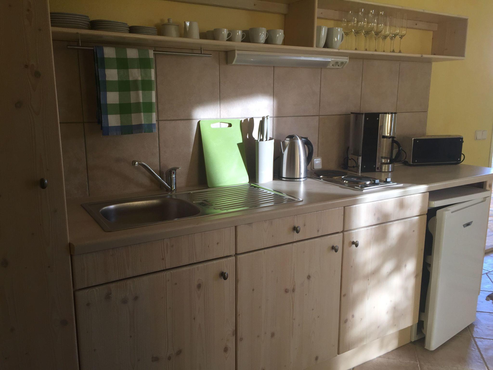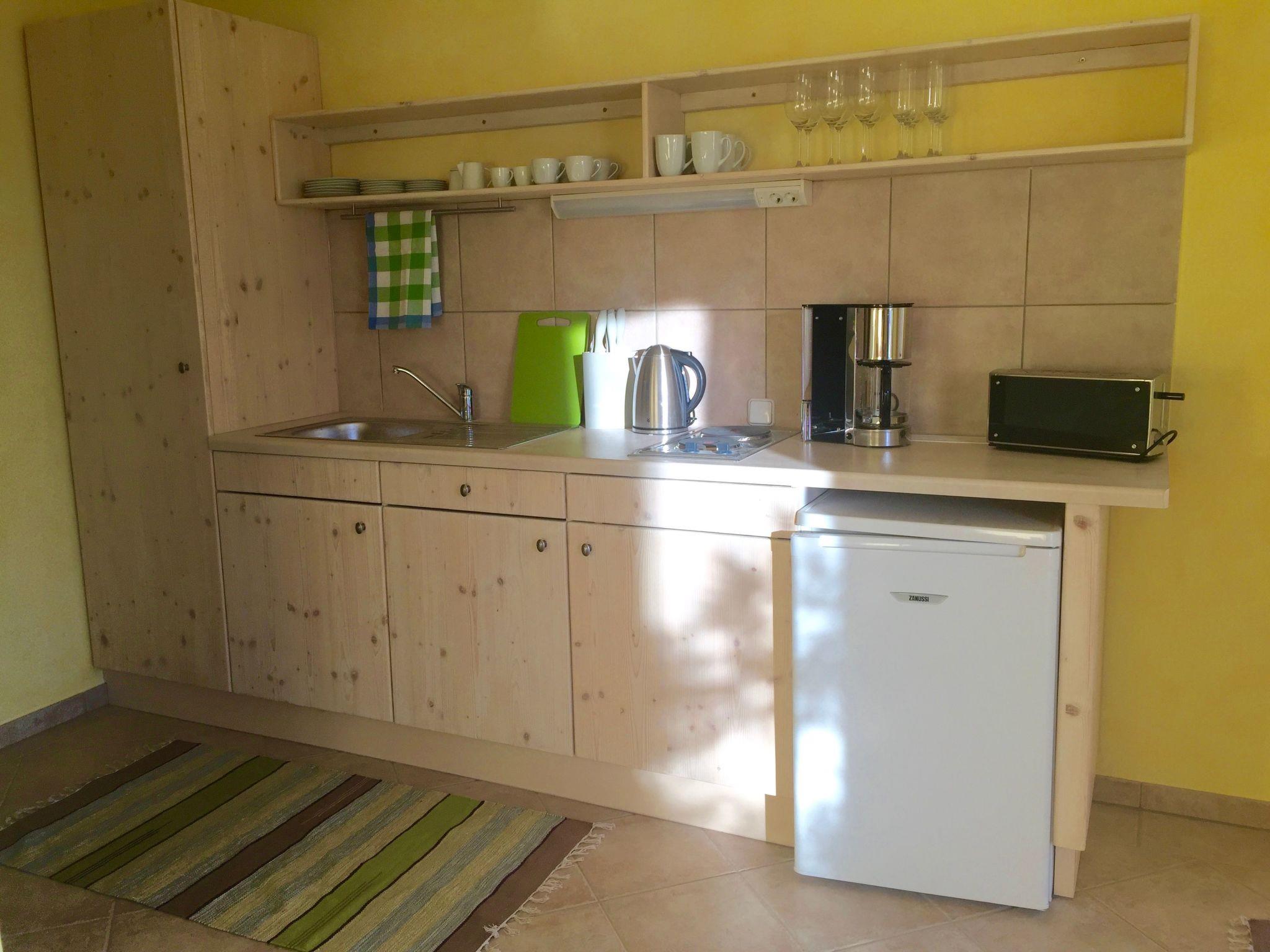 The holiday apartment on the ground floor measures around 42m² and can accommodate up to four people. The light living and dining room includes a fully-equipped kitchen with all the necessary utensils, along with a two-ring hob, a toaster, a kettle and a fully automatic coffee. A dining table for four people invites you to sit together and dine sociably. The generous sofa in the living room (270 x 120cm) can be converted easily into a comfortable bed (200 x 150cm). The separate bedroom has a comfortable double bed and a wardrobe. The modern bathroom is fitted with a shower and WC.