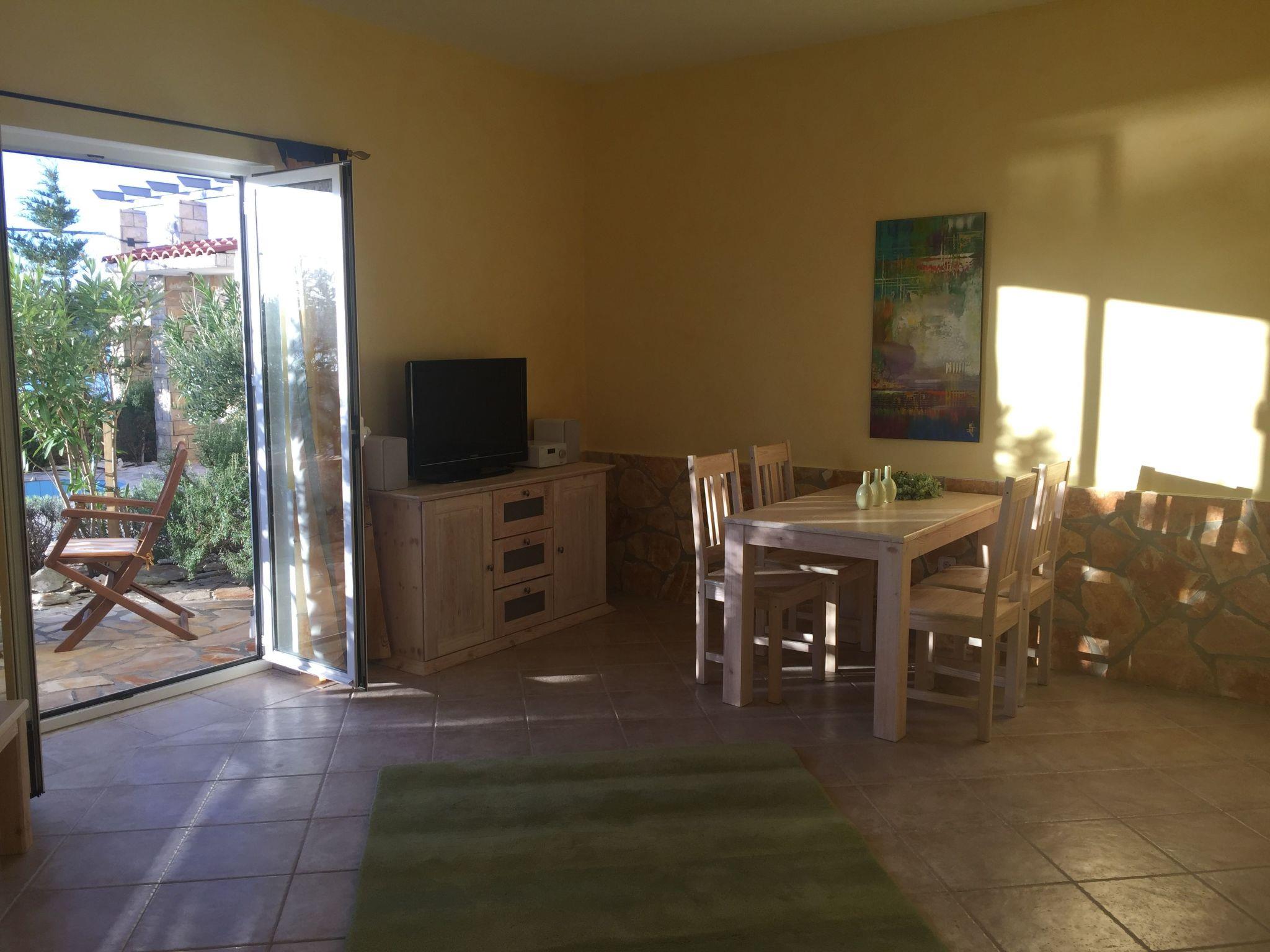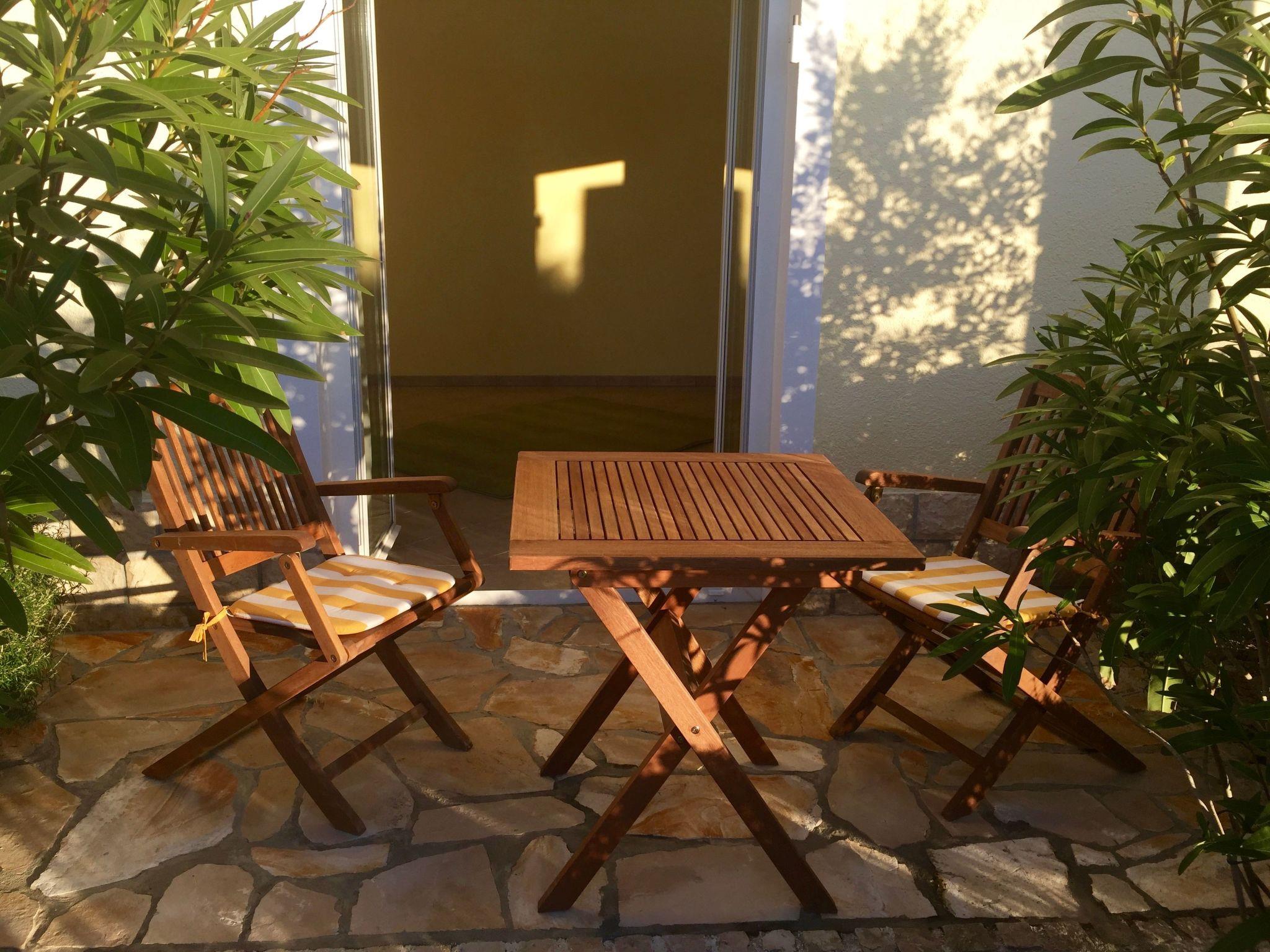 The living room opens onto the private furnished terrace, ideal for breakfast and relaxing outdoors.