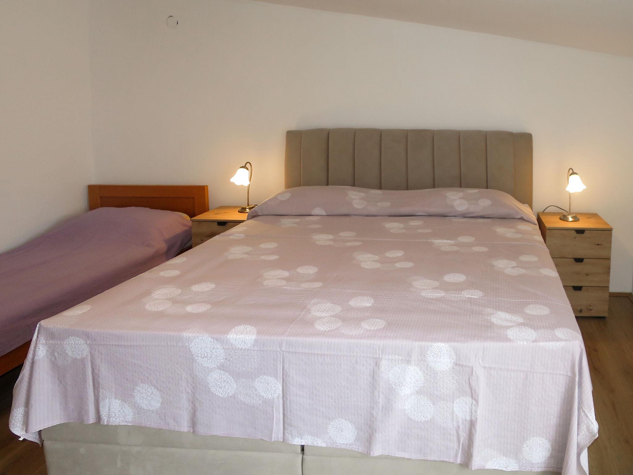 5-room house 150 m2 on 2 levels. Living/dining room with TV (flat screen), air conditioning. Exit to the terrace. 2 rooms, each room with 1 french bed (180 cm, length 200 cm). Open kitchen (oven, dishwasher, 4 gas rings, kettle, electric coffee machine). Shower/WC, sep. WC. Upper floor: entrance hall with air conditioning. 1 room with sloping ceilings, ceiling height 175 - 280 cm with 1 french bed (180 cm, length 200 cm). 1 room with sloping ceilings, ceiling height 175 - 260 cm with 1 bed (90 cm, length 200 cm), 1 double bed (2 x 90 cm, length 200 cm). Shower/WC. No heating option. Balcony 15 m2, terrace 15 m2, roofed. Terrace furniture, barbecue, deck chairs (6). Facilities: Internet (WiFi, free). Maximum 1 pet/ dog allowed.