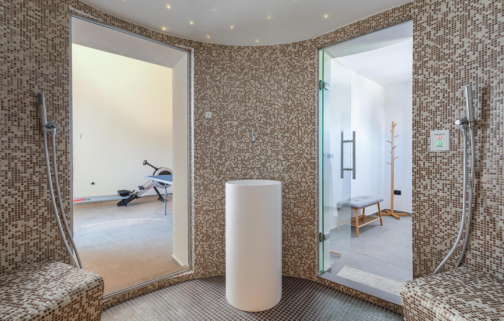 I dette usædvanligt store og luksuriøse feriehus venter lyse, åbne rum og høj kvalitetsindretning, der perfekt forener afslapning og elegance. Hver soveværelse tilbyder maksimal privatliv med eget badeværelse. Fitness- og bordtennisrummet, dampbadet og de rummelige fællesområder indbyder til aktivitet og hyggeligt samvær. Uanset om I laver mad i sommerkøkkenet eller slapper af ved poolen på en af de mange solstole – her oplever I ren afslapning, mens jeres børn leger i haven.