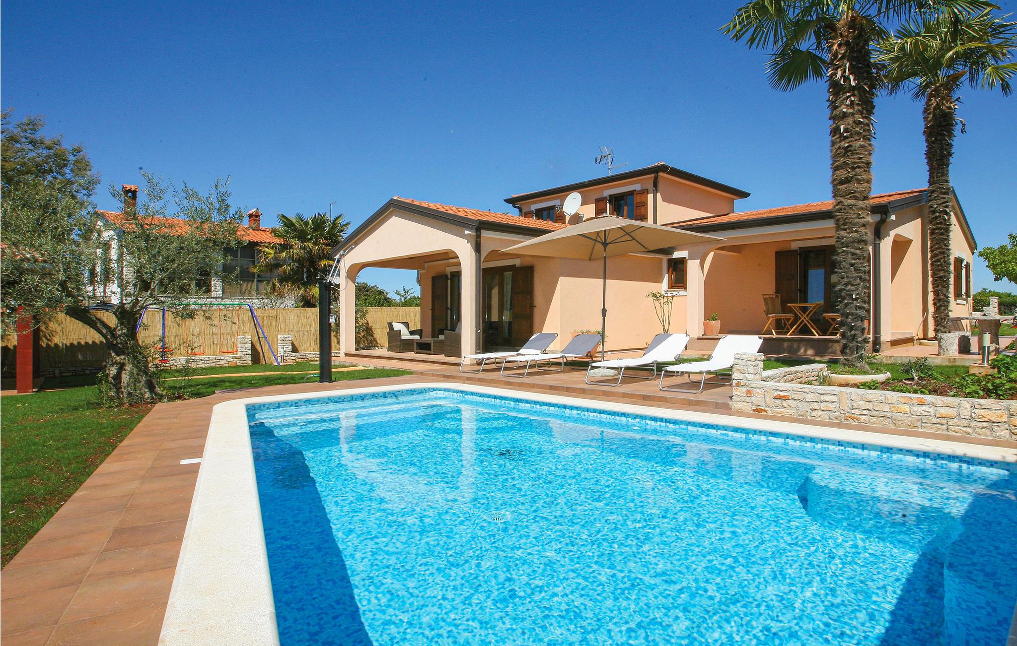 Dette smagfulde og moderne indrettede familiehus, med privat pool, er oplagt til en vellykket og uforglemmelig ferie. På den indhegnede grund, med overdækket terrasse, er der garanteret privatsfære. I kan tilberede lækre retter på grillen, udbuddet af gode kroatiske råvarer er stort. Børnene vil hurtigt forelske sig i legepladsen hvor der er rutsjebane, vippe og gynge - her kan de tilbringe timevis med leg. I jeres helt egen pool kan I forfriske jer og pjaske eller svømme alt efter lyst på de mange varme dage. I kan finde ro i den skønne have med plæner, blomster og træer - en rigtig grøn oase. I stuen er der en rummelig stue med køkken og via en vindetrappe kommer i op til 1ste sal. I stuen er der desuden to soveværelser og et badeværelse og på første sal er der endnu et soveværelse. Centrum nås på få minutter i bil. Besøg Novigrad med attraktioner og flere dejlige strande, det vil blive en uforglemmelig oplevelse.