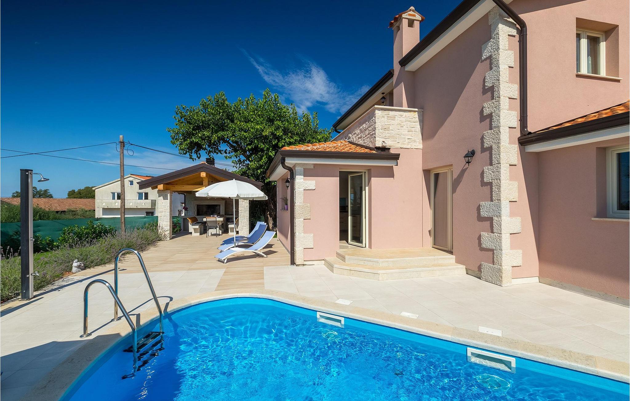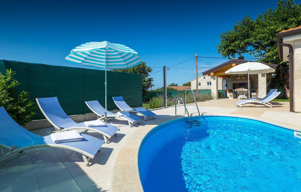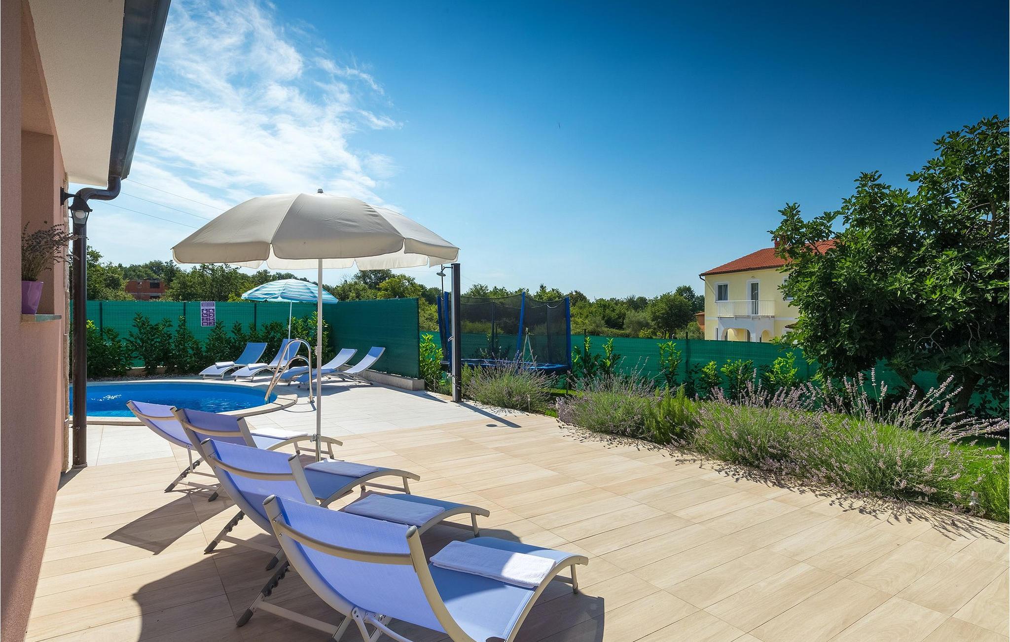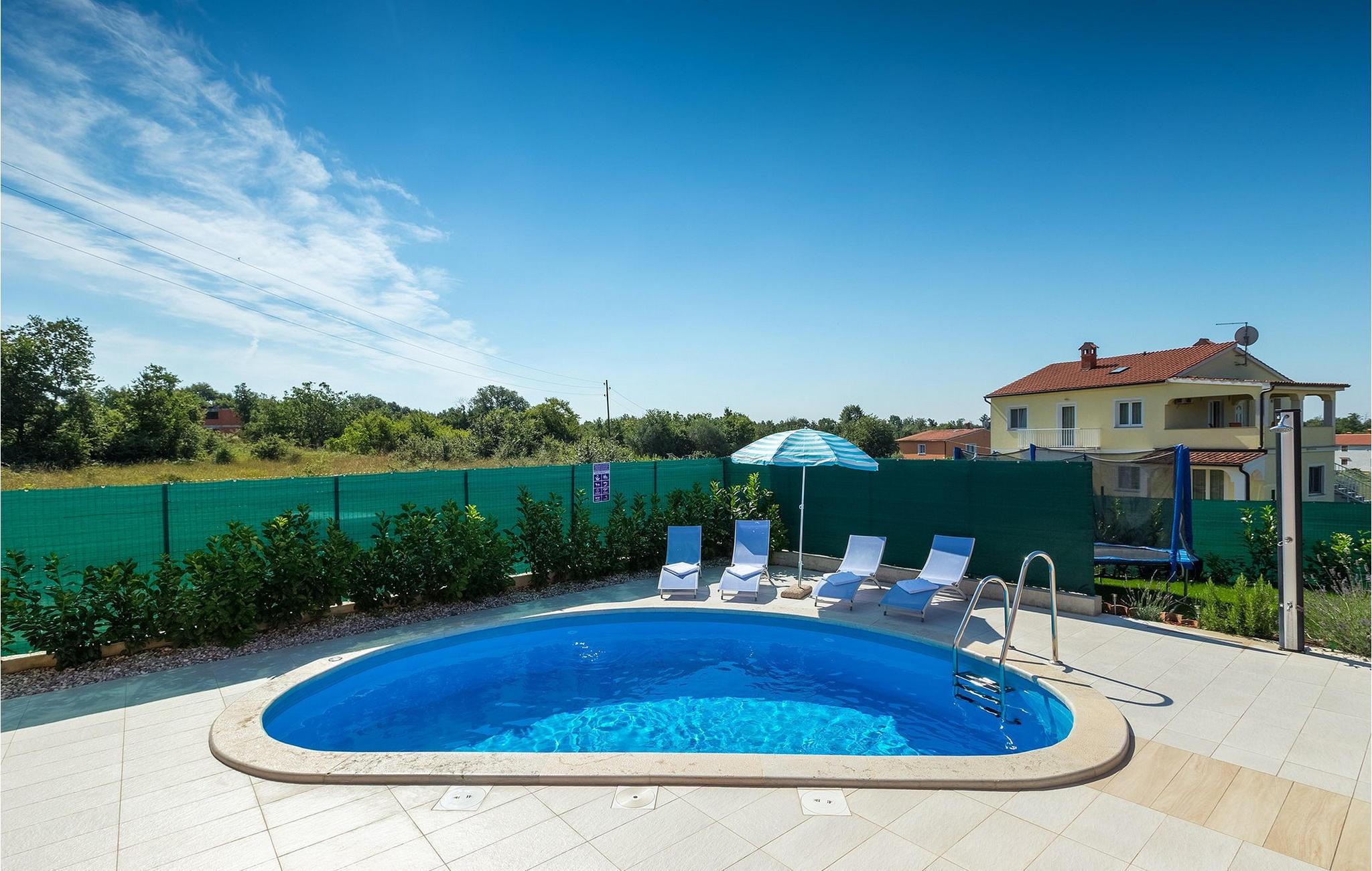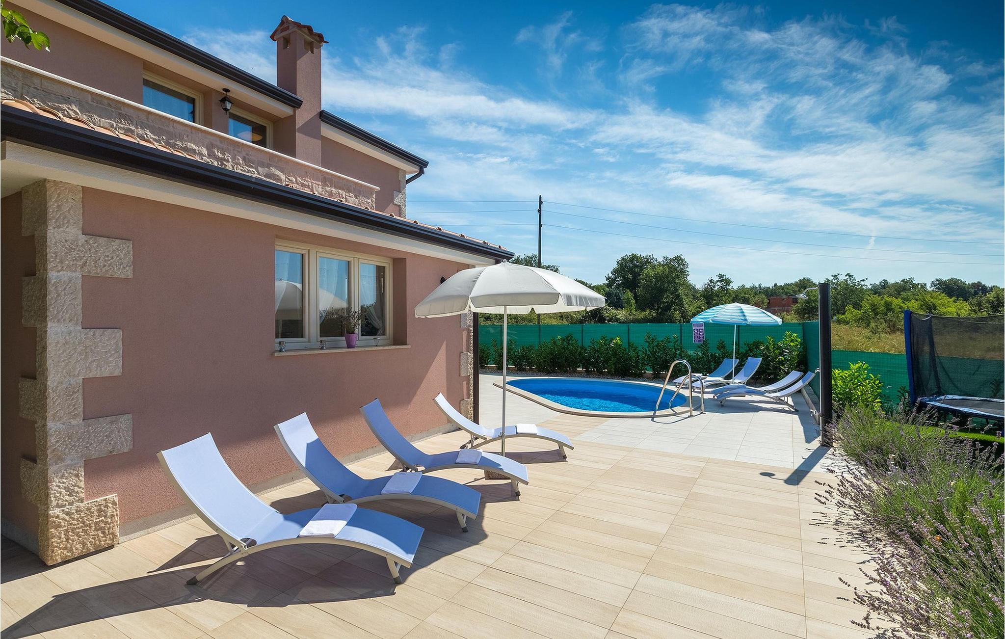 Dejlige Villa Murva er en 3-værelses villa nær Porec. Stueetagen består af et opholds- og spiseområde, forbundet med et fuldt udstyret køkken, som har direkte adgang til poolområdet i villaens have. Alle de tre soveværelser har aircondition og har dobbeltseng, tv og eget badeværelse. Et af soveværelserne ligger i stueetagen, mens den anden etage ligger på øverste etage og deler en hyggelig terrasse. Udenfor, i haven, er der en overdækket terrasse, hvor du kan nyde udendørs spisning og tilberede måltider på kulgrillen. Der er en lille græsplæne med trampolin, hvor børnene kan hygge sig og have det sjovt, mens I nyder solen på liggestolene ved siden af poolen. Villaen er den perfekte familieindkvartering, velegnet til op til 8 gæster, fuldt airconditioneret, med to private parkeringspladser og beliggende på et lille sted, men tæt på alle de faciliteter, du måtte have brug for under din ferie. :)