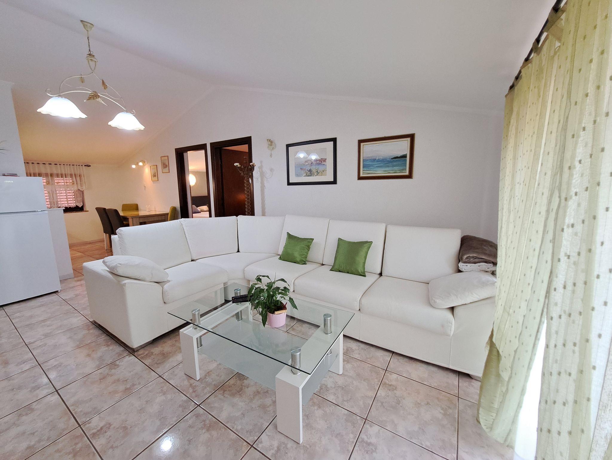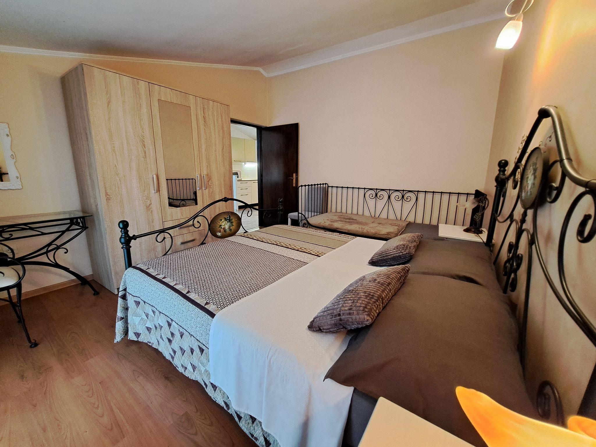 Ferienwohnung bietet Platz für 5 Gäste. Die Betten sind in Schlafzimmern, die es 2 gibt, innerhalb einer Gesamtfläche von 54m2, angeordnet. Die Gäste haben eine eigene Terrasse zur Verfügung, auf der sie in warmen Sommernächten genießen können. IM PREIS INBEGRIFFEN: Kurtaxe, Endreinigung, Klimatisierung, Parkplatz, Internet, Kinderbett, Bügeleisen, Bügelbrett, Föhn, Sonnenschirm. VERBINDLICHE ZUSÄTZLICHE KOSTEN: Aufzahlung für Kurzaufenthalte (prozentualer Zuschlag pro Nächtigungsanzahl: 30% - 1, 20% - 2, 10% - 3). UNVERBINDLICHE ZUSÄTZLICHE KOSTEN: Wäschewaschen (5,00 € Waschen), Fahrrad (25,00 € täglich (pro Stück)). Die Verfügbarkeit zusätzlicher Dienstleistungen in Ihrem reservierten Termin und die Preise derselben (falls nicht aufgeführt) müssen im Voraus überprüft werden. Zusätzliche Dienstleistungen die in der Zahlungsaufforderung nicht aufgeführt sind werden direkt beim Vermieter bezahlt, angenommen der Gast nutzt auch diese. Ermäßigung auf den Grundpreis: Gratistag 14=13 (bei einem Aufenthalt von 14 Tagen oder mehr erhalten Sie einen Gratistag für den Aufenthalt bis 31.12.26).