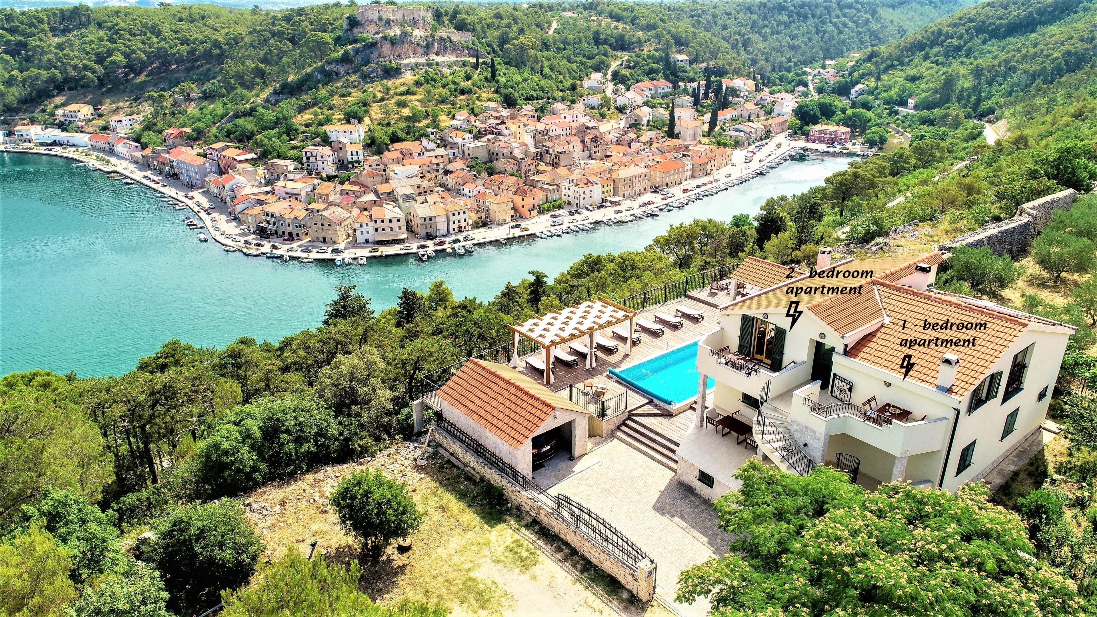 Es gibt nur wenige Dinge im Leben, die so angenehm sind, wie eine schöne Aussicht. Überall auf der Welt gibt es viele verschiedene Aussichtspunkte und dieser gehört sicherlich mit zu einem der Schönsten. Diese einzigartige Aussicht und der Außenbereich, machen dieses Haus zu etwas Besonderen. Es liegt hoch über der Stadt in einer abgelegenen Gegend, wo Sie einen beheizten Gemeinschafts-Pool genießen, sich auf der großen Terrasse sonnen, im Schatten unter einer hölzernen Pergola entspannen, in der kleinen Sommerküche am Pool grillen und im Freien speisen können.