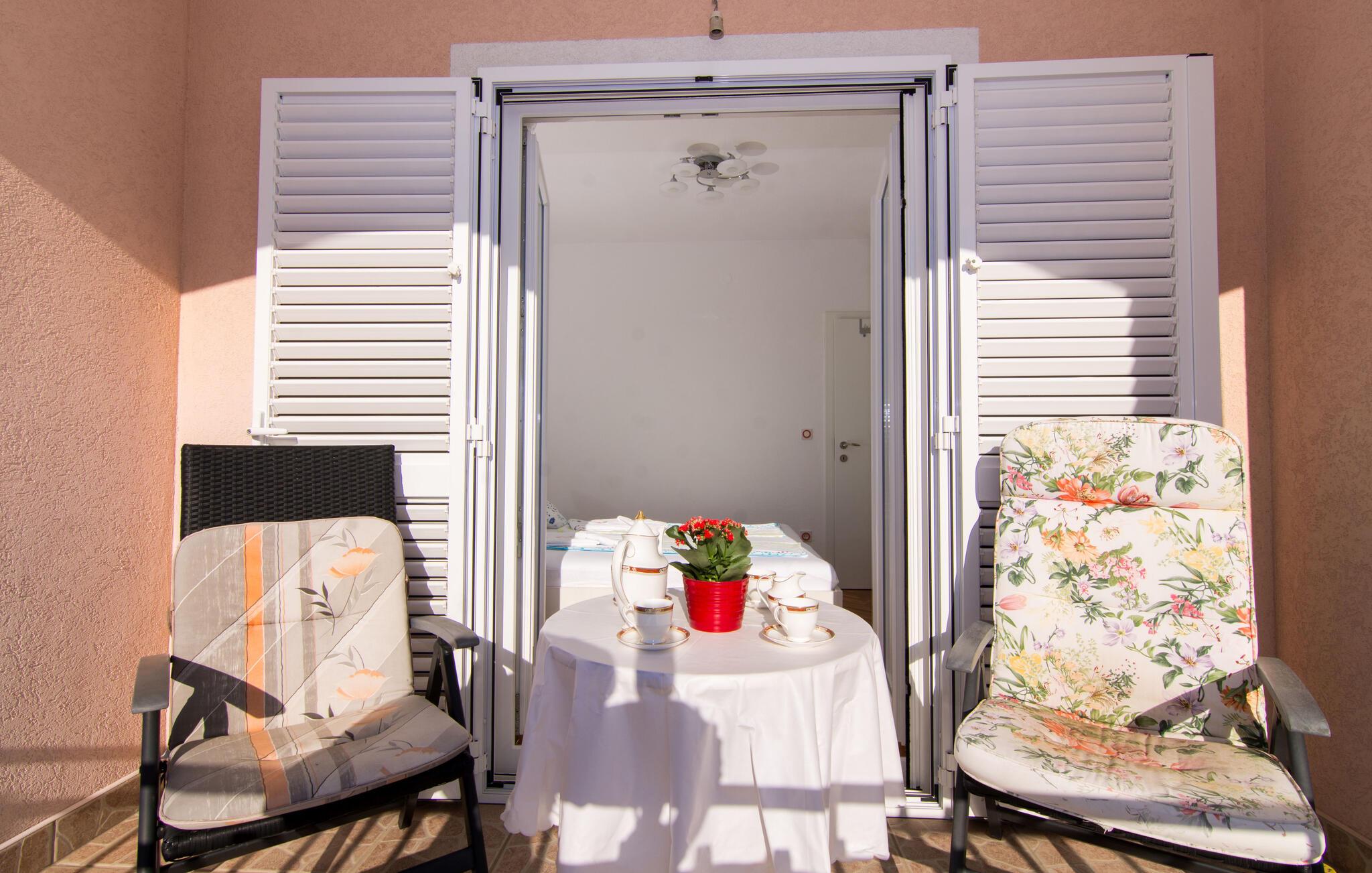 Træd ud på balkonen, hvor I kan nyde den smukke udsigt over det nærliggende hav. Se solnedgangen bade de fredelige omgivelser i gyldent aftenlys med et glas vin. Snak på den åbne terrasse til langt ud på sommernatten og hyg jer med grillmaden på den fælles grund.