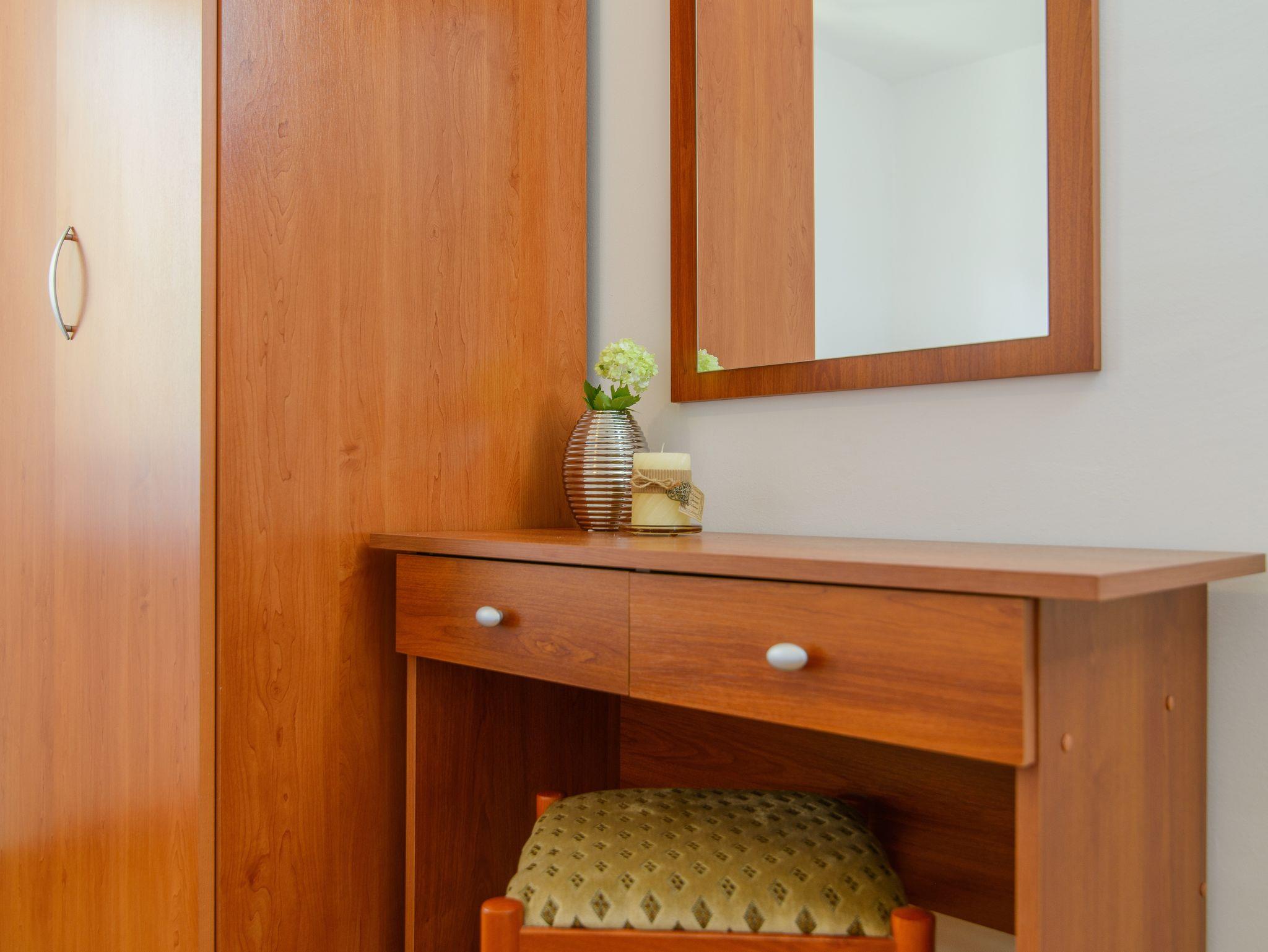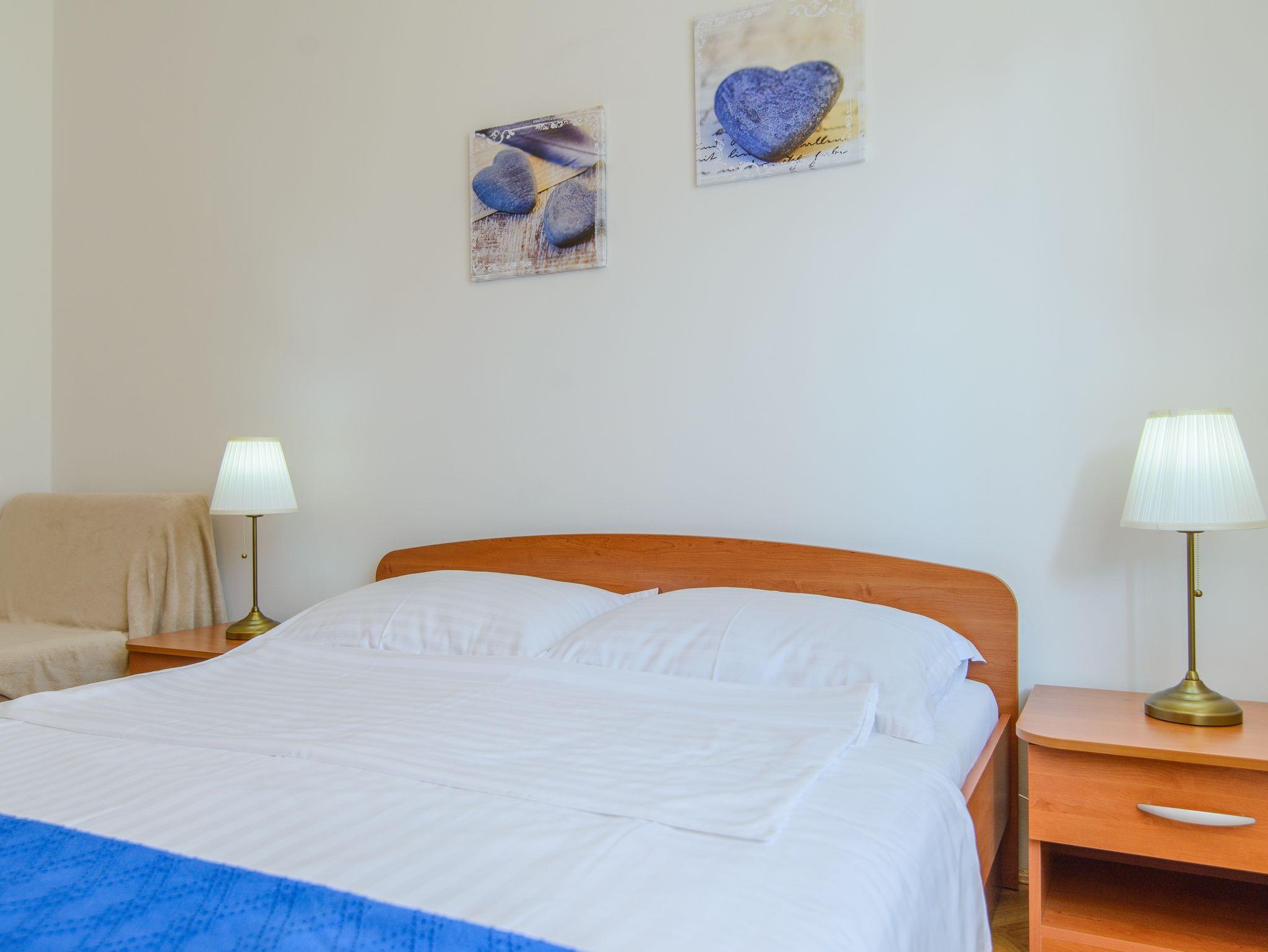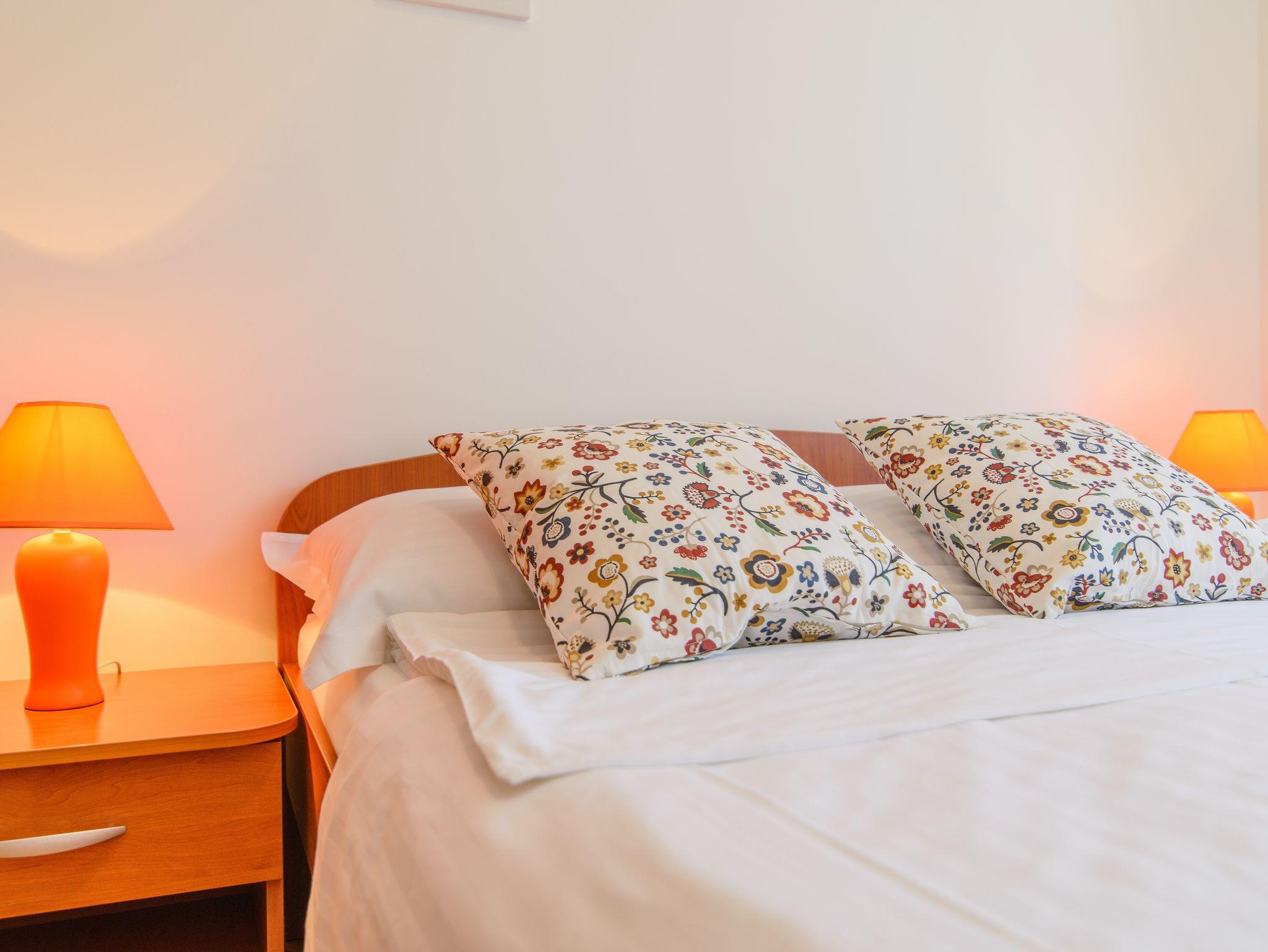 Ferienwohnung bietet Platz für 5 Gäste. Die Betten sind in Schlafzimmern, die es 2 gibt, innerhalb einer Gesamtfläche von 44m2, angeordnet. Die Gäste haben eine eigene Terrasse zur Verfügung, auf der sie in warmen Sommernächten genießen können. Das Apartment bietet Meerblick. Es ist erlaubt, Speisen auf dem Gemeinschafts-Grill vorzubereiten. Während ihres Aufenthalts können Gäste das gemeinsam zur Nutzung stehende Schwimmbad benutzen. IM PREIS INBEGRIFFEN: Kurtaxe, Endreinigung, Klimatisierung, Zentralheizung, Pool, Parkplatz, Internet, Kinderbett, Bügeleisen, Bügelbrett, Föhn. Die Verfügbarkeit zusätzlicher Dienstleistungen in Ihrem reservierten Termin und die Preise derselben (falls nicht aufgeführt) müssen im Voraus überprüft werden. Zusätzliche Dienstleistungen die in der Zahlungsaufforderung nicht aufgeführt sind werden direkt beim Vermieter bezahlt, angenommen der Gast nutzt auch diese.