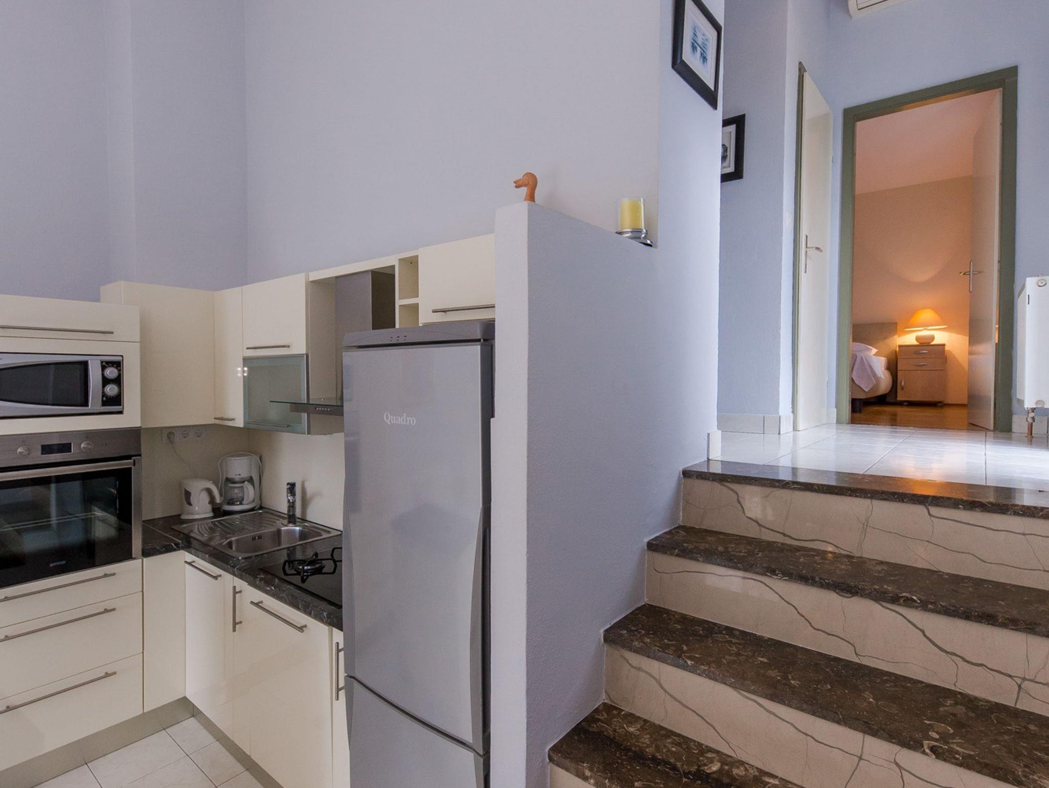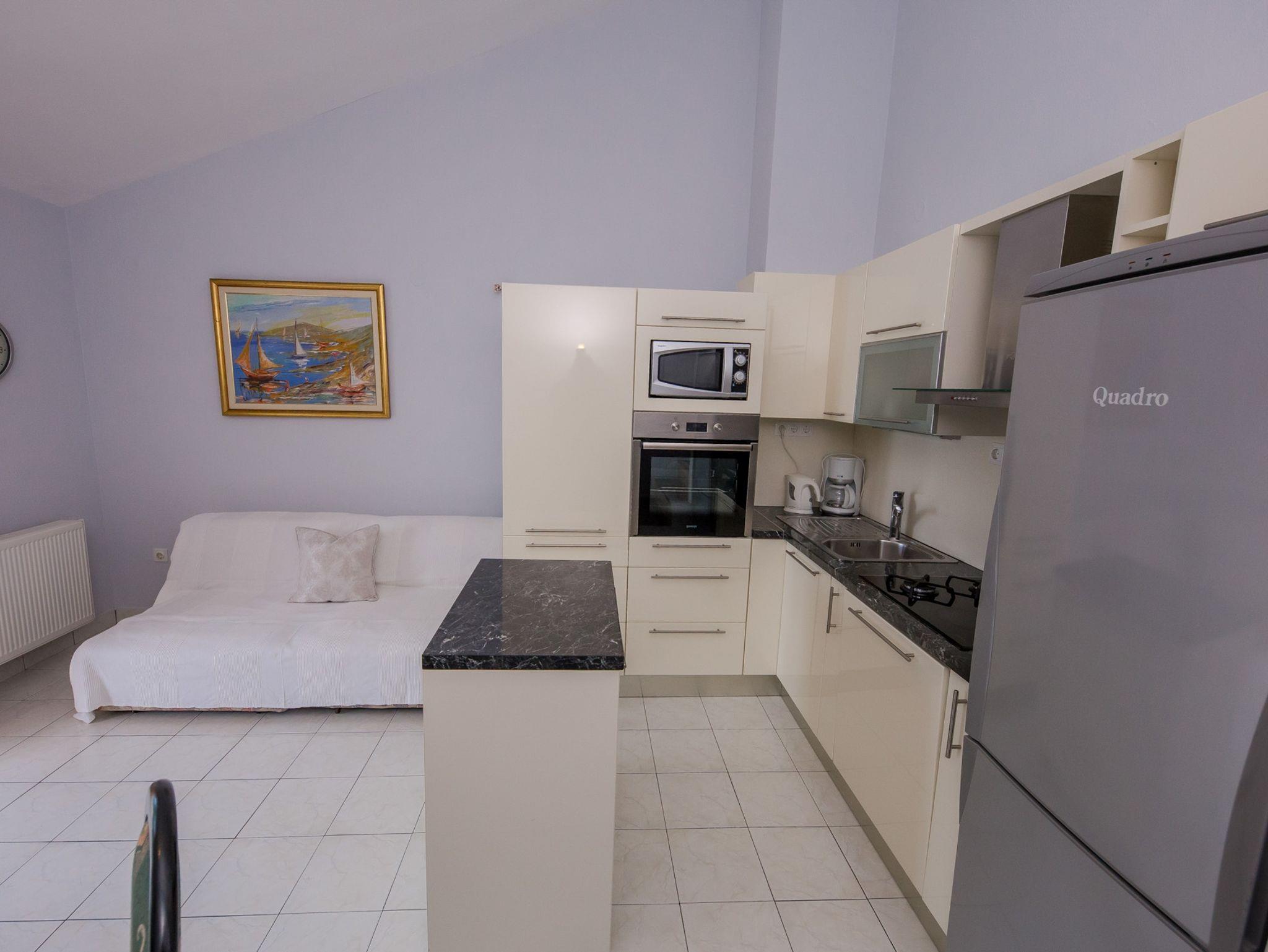 Ferienwohnung bietet Platz für 4 Gäste. Die Betten sind in Schlafzimmern, die es 1 gibt, und in Wohnzimmer, innerhalb einer Gesamtfläche von 42m2, angeordnet. Die Gäste haben eine eigene Terrasse zur Verfügung, auf der sie in warmen Sommernächten genießen können. Das Apartment bietet Meerblick. Es ist erlaubt, Speisen auf dem Gemeinschafts-Grill vorzubereiten. IM PREIS INBEGRIFFEN: Kurtaxe, Endreinigung, Klimatisierung, Parkplatz, Internet, Bügeleisen, Bügelbrett, Föhn, Liegestühle. VERBINDLICHE ZUSÄTZLICHE KOSTEN: Aufzahlung für Kurzaufenthalte (prozentualer Zuschlag pro Nächtigungsanzahl: 30% - 1, 20% - 2, 10% - 3). Die Verfügbarkeit zusätzlicher Dienstleistungen in Ihrem reservierten Termin und die Preise derselben (falls nicht aufgeführt) müssen im Voraus überprüft werden. Zusätzliche Dienstleistungen die in der Zahlungsaufforderung nicht aufgeführt sind werden direkt beim Vermieter bezahlt, angenommen der Gast nutzt auch diese.