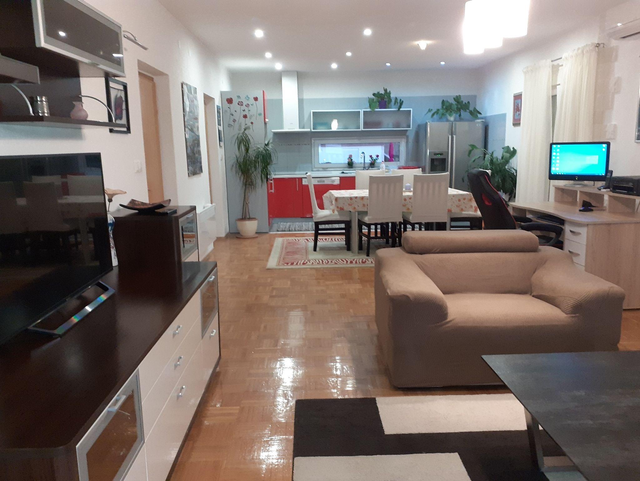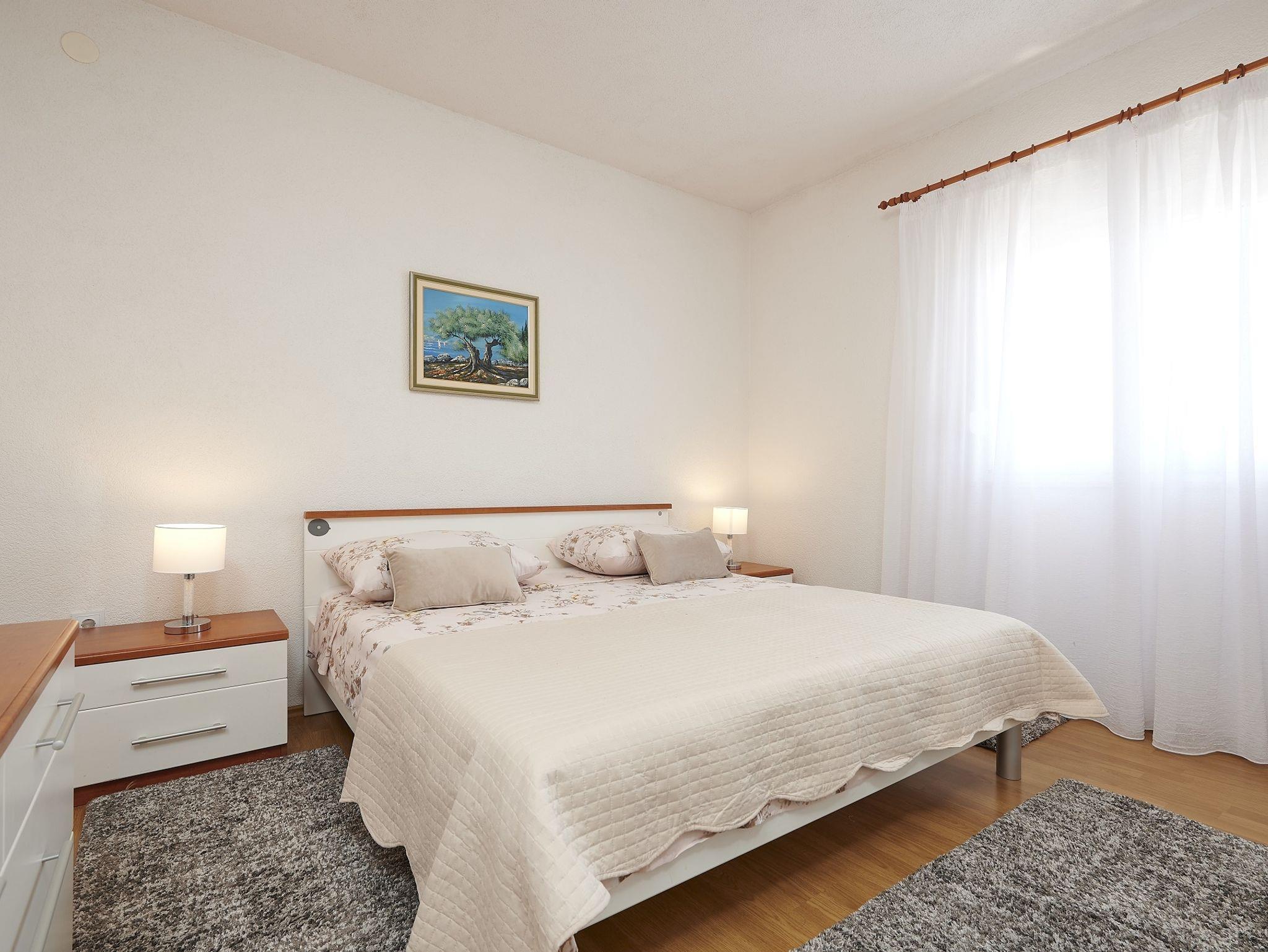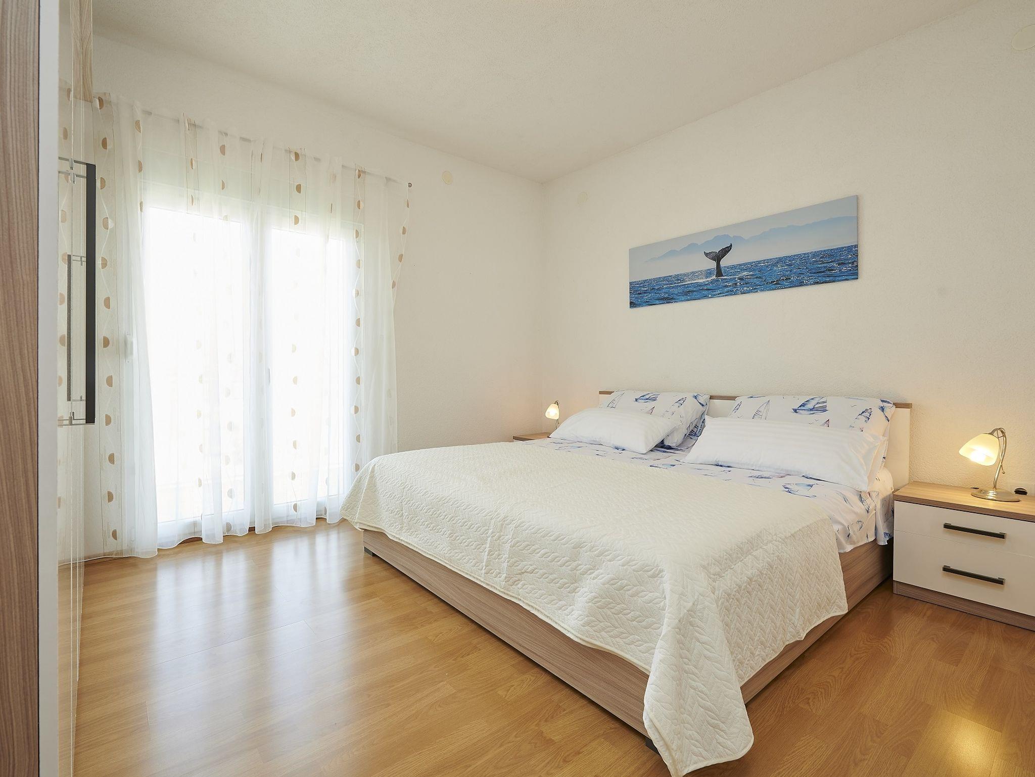 Ferienwohnung bietet Platz für 5 Gäste. Die Betten sind in Schlafzimmern, die es 3 gibt, innerhalb einer Gesamtfläche von 55m2, angeordnet. Die Gäste haben eine eigene Terrasse zur Verfügung, auf der sie in warmen Sommernächten genießen können. Das Apartment bietet Meerblick. Es ist erlaubt, Speisen auf dem Gemeinschafts-Grill vorzubereiten. IM PREIS INBEGRIFFEN: Kurtaxe, Endreinigung, Klimatisierung, Parkplatz, Internet, Kinderbett, Bügeleisen, Bügelbrett, Föhn. VERBINDLICHE ZUSÄTZLICHE KOSTEN: Aufzahlung für Kurzaufenthalte (prozentualer Zuschlag pro Nächtigungsanzahl: 30% - 1, 20% - 2, 10% - 3). Die Verfügbarkeit zusätzlicher Dienstleistungen in Ihrem reservierten Termin und die Preise derselben (falls nicht aufgeführt) müssen im Voraus überprüft werden. Zusätzliche Dienstleistungen die in der Zahlungsaufforderung nicht aufgeführt sind werden direkt beim Vermieter bezahlt, angenommen der Gast nutzt auch diese.