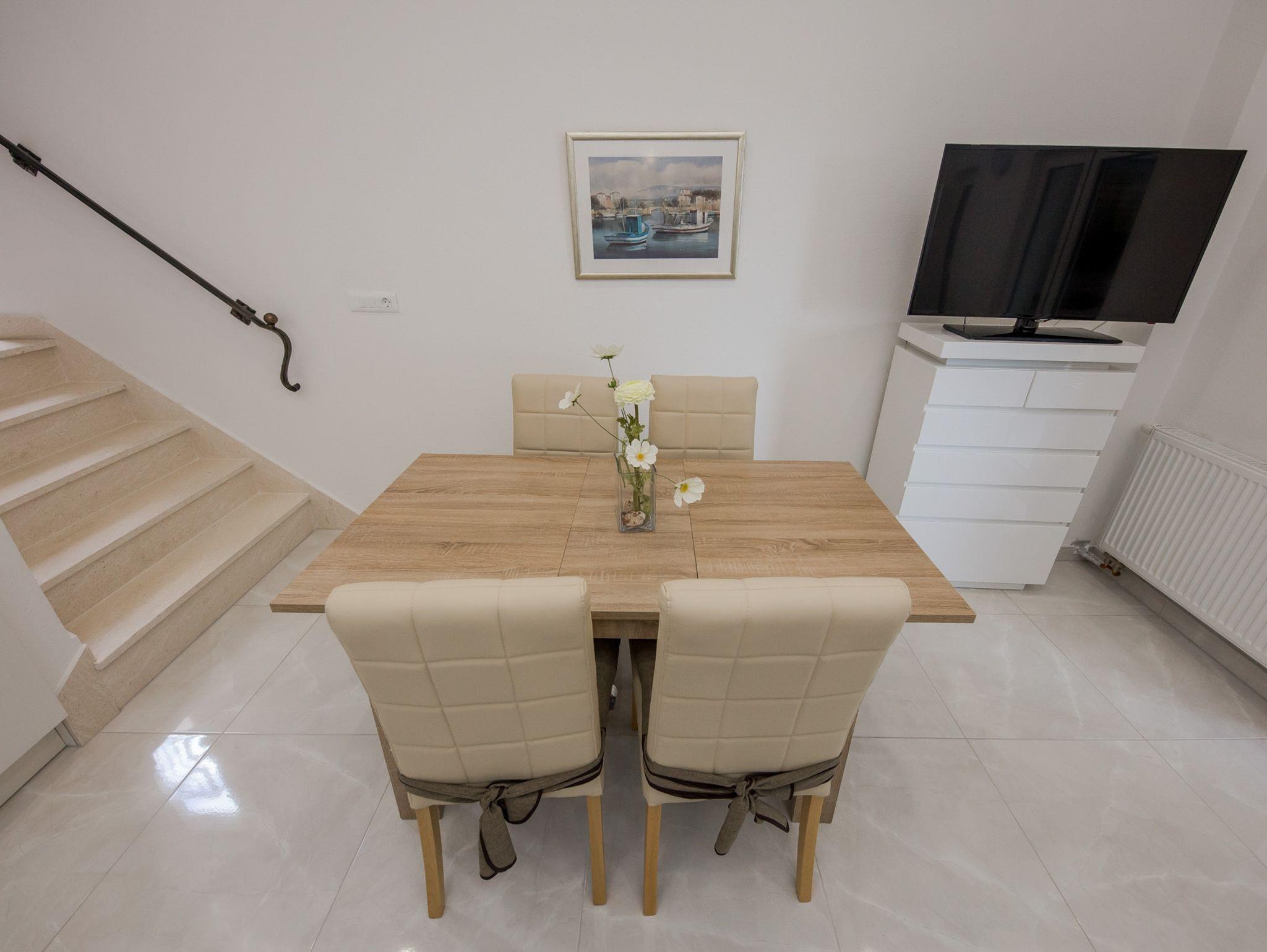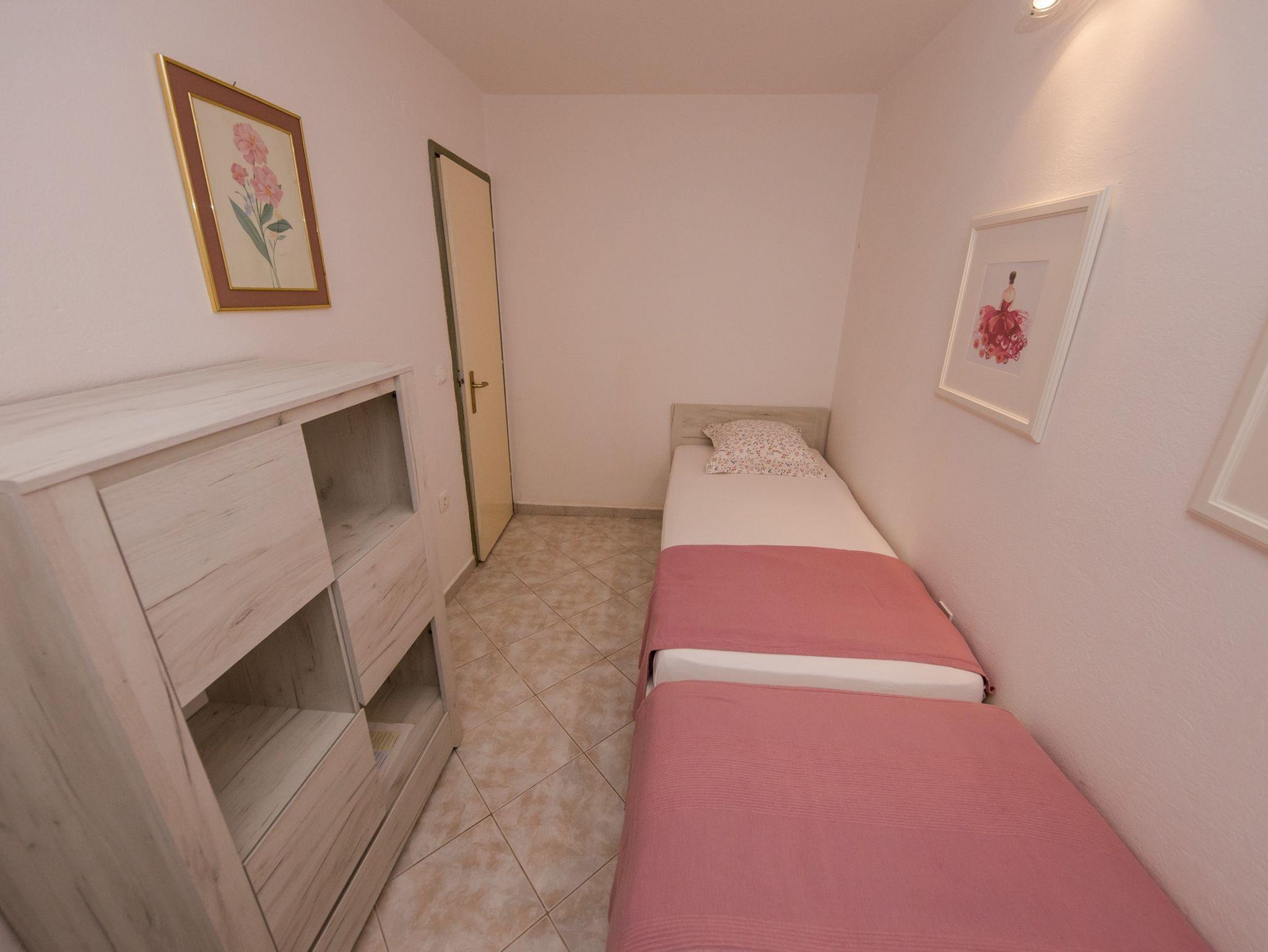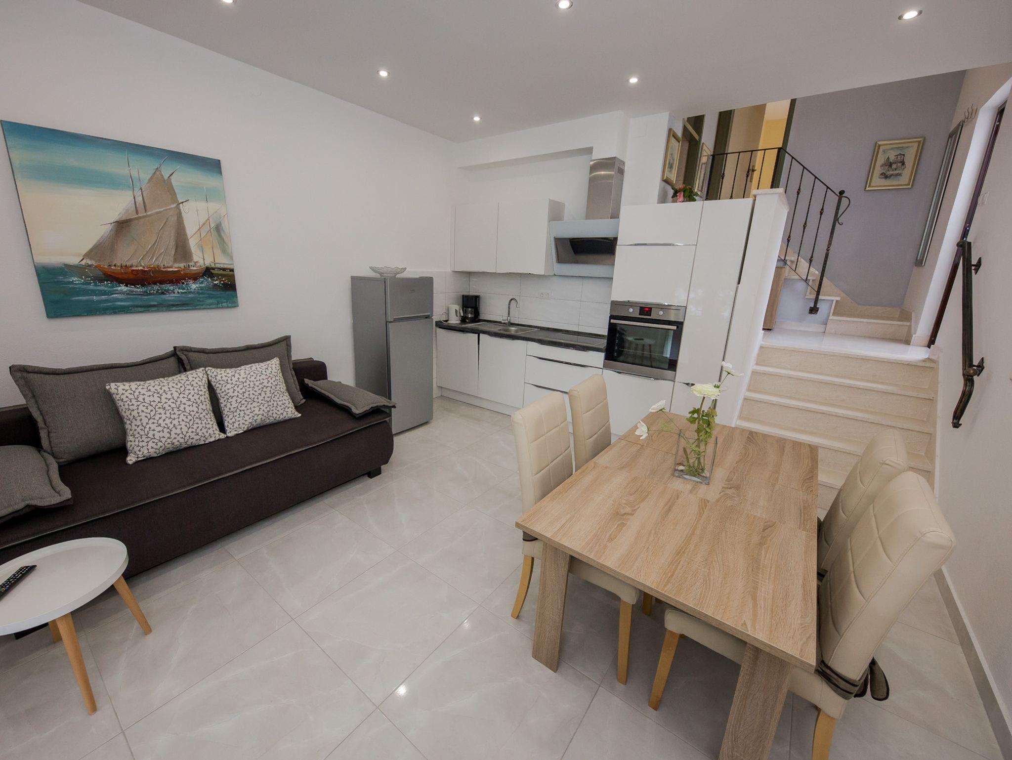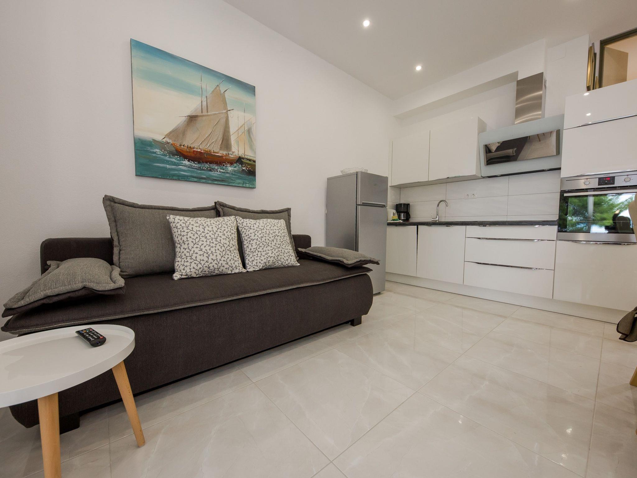 Ferienwohnung bietet Platz für 4 Gäste. Die Betten sind in Schlafzimmern, die es 2 gibt, innerhalb einer Gesamtfläche von 42m2, angeordnet. Die Gäste haben eine eigene Terrasse zur Verfügung, auf der sie in warmen Sommernächten genießen können. Das Apartment bietet Meerblick. Es ist erlaubt, Speisen auf dem Gemeinschafts-Grill vorzubereiten. IM PREIS INBEGRIFFEN: Kurtaxe, Endreinigung, Klimatisierung, Parkplatz, Internet, Bügeleisen, Bügelbrett, Föhn, Liegestühle. VERBINDLICHE ZUSÄTZLICHE KOSTEN: Aufzahlung für Kurzaufenthalte (prozentualer Zuschlag pro Nächtigungsanzahl: 30% - 1, 20% - 2, 10% - 3). Die Verfügbarkeit zusätzlicher Dienstleistungen in Ihrem reservierten Termin und die Preise derselben (falls nicht aufgeführt) müssen im Voraus überprüft werden. Zusätzliche Dienstleistungen die in der Zahlungsaufforderung nicht aufgeführt sind werden direkt beim Vermieter bezahlt, angenommen der Gast nutzt auch diese.