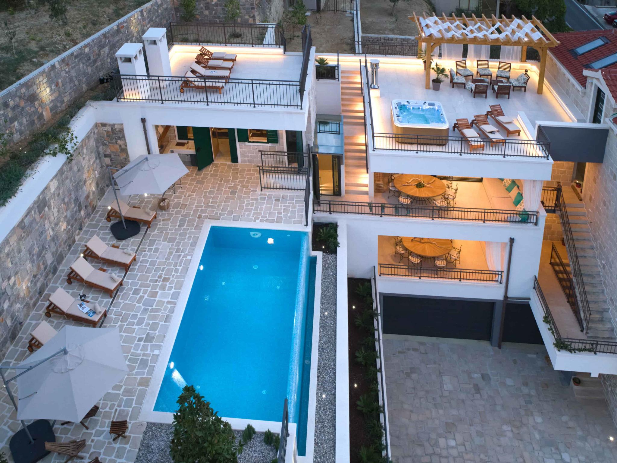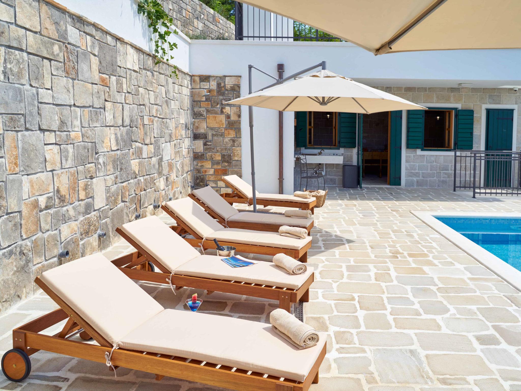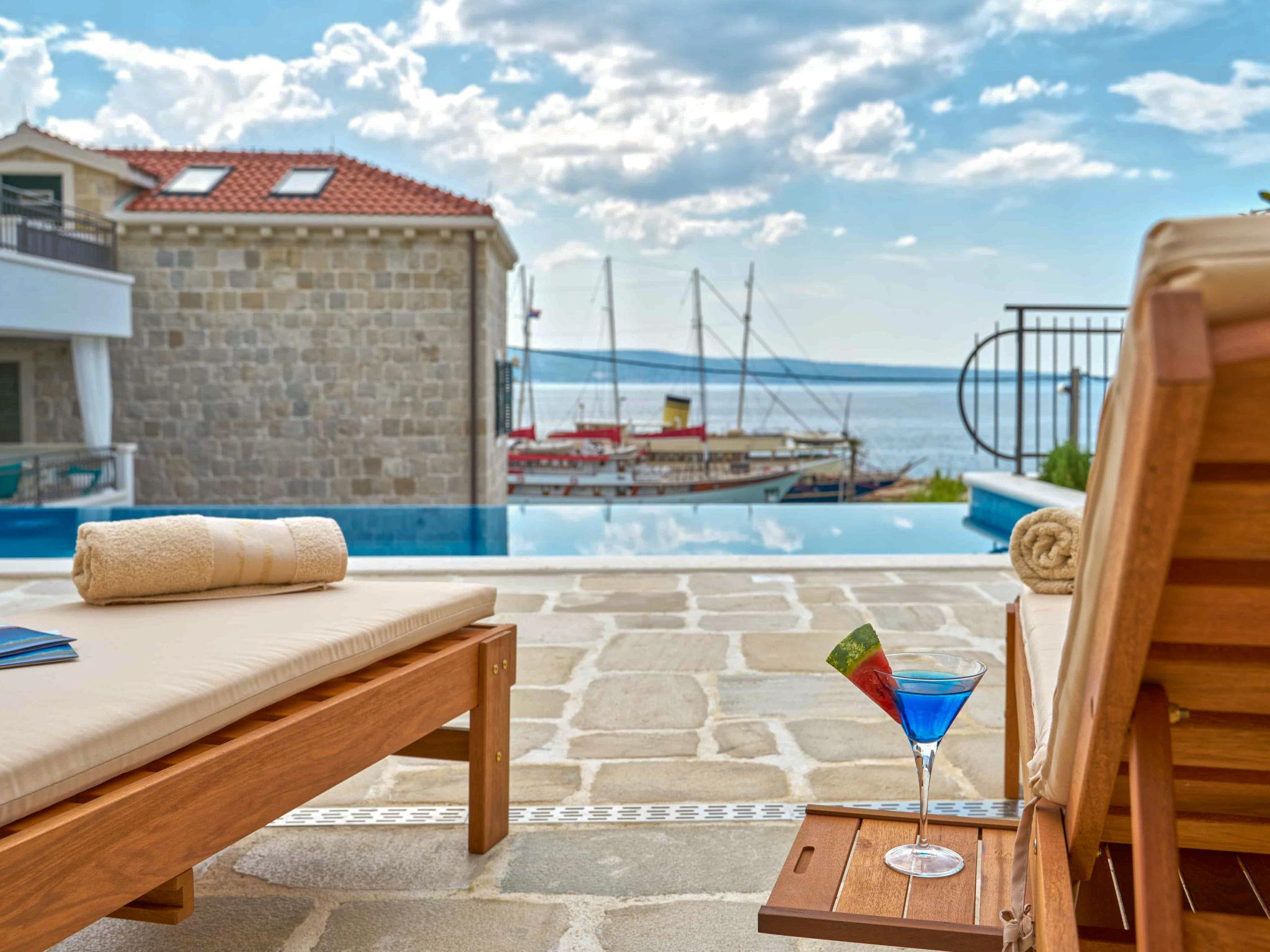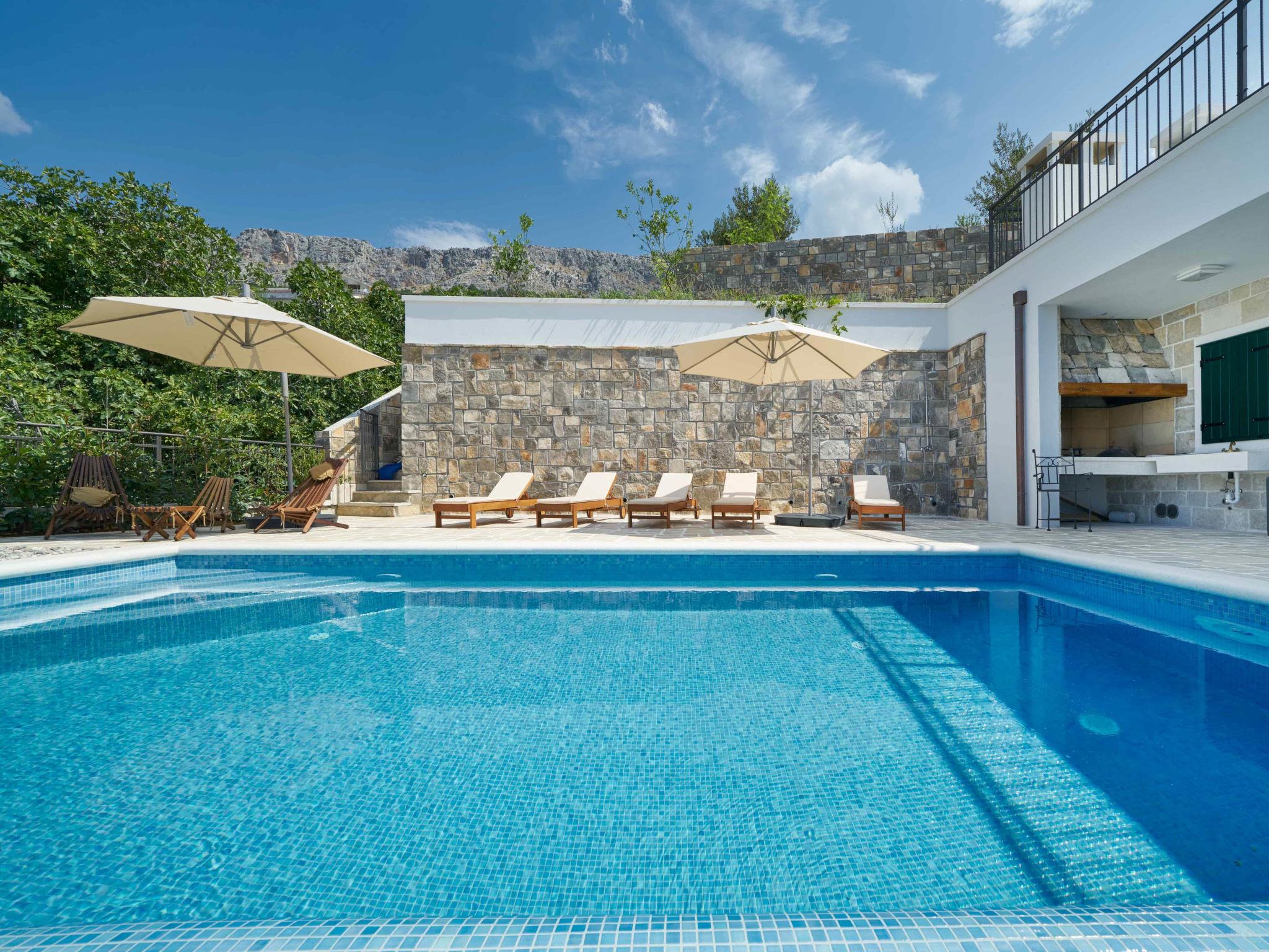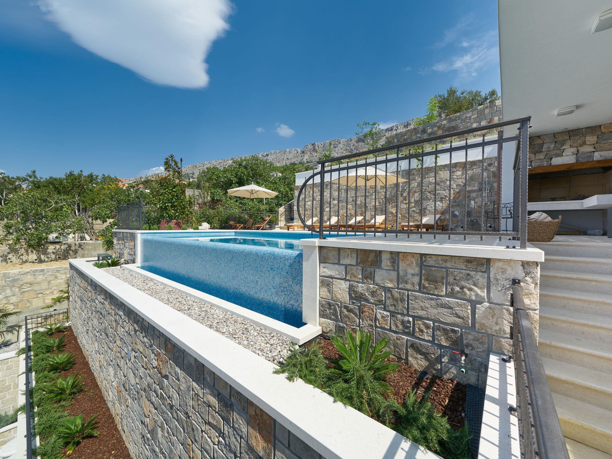 Beautiful villa "Mladenka", 2 storeys, built in 1880, renovated in 2020. In the hamlet Suhi Potok 7 km from the centre of Omiš, in a sunny position, 20 m from the sea, 20 m from the beach, road to cross. Private: property 1'200 m2 (fenced), swimming pool angular, heated (4 x 7 m, seasonal availability: 01.May. - 15.Oct.) with internal staircase. WC in the pool area, outdoor shower, hot tub, terrace (70 m2), garden furniture, barbecue, barbecue house, pool maintenance by the owner/gardener. In the house: internet access, sauna, billiard table, roof terrace, air conditioning, burglar alarm system, washing machine, tumble dryer. Room cleaning daily on request (extra). Breakfast on request (extra). Parking (for 4 cars) at the house on the premises, single garage. Shop 300 m, supermarket 2 km, restaurant 400 m, bus stop 130 m, sandy beach 20 m. Please note: main road close by 5 m from the property. Airfield 35 km from the property. Roof terrace (80 m2, terrace furniture).