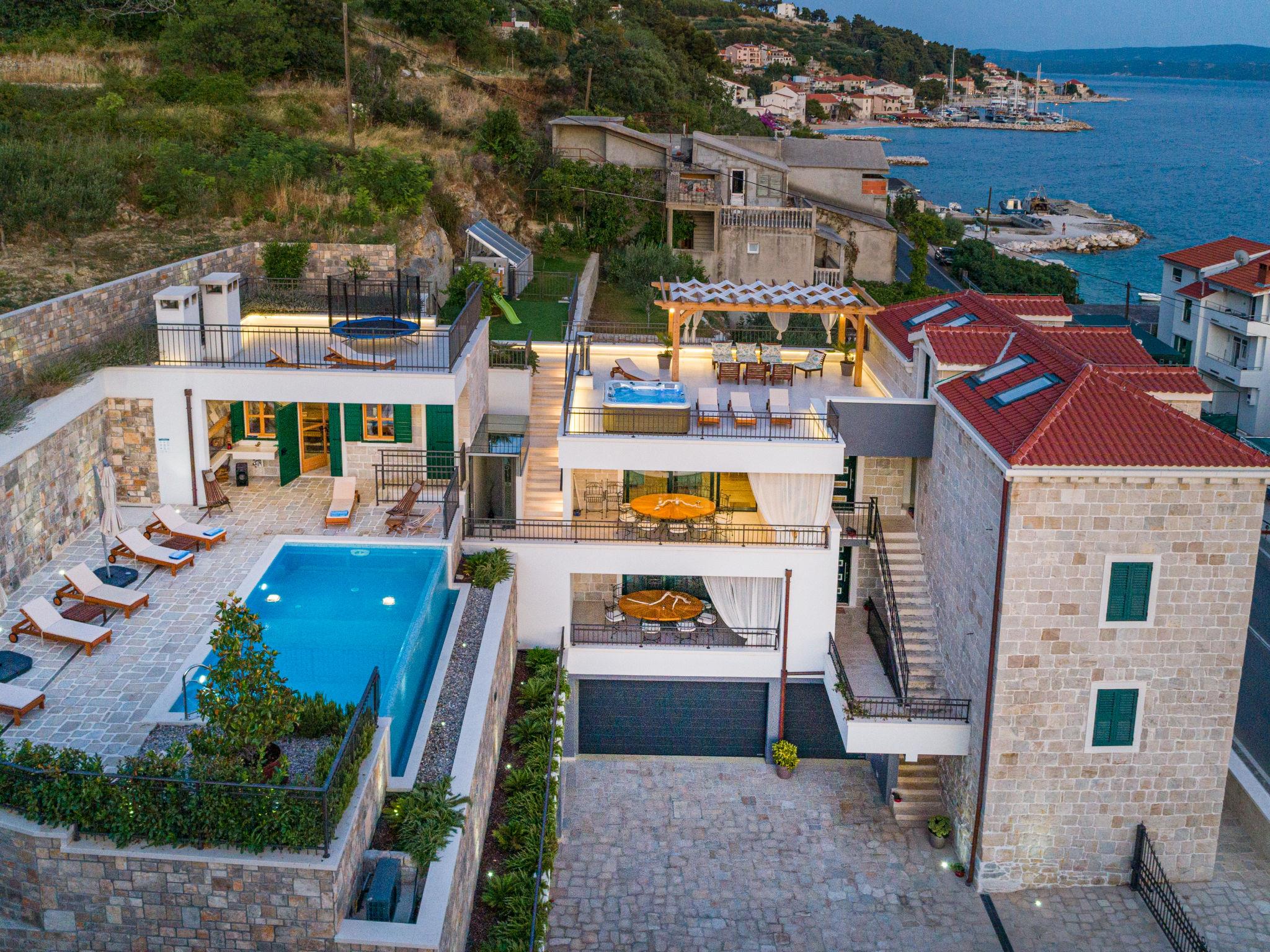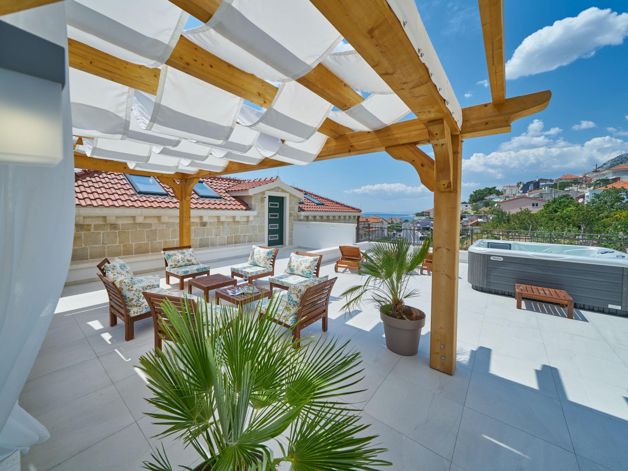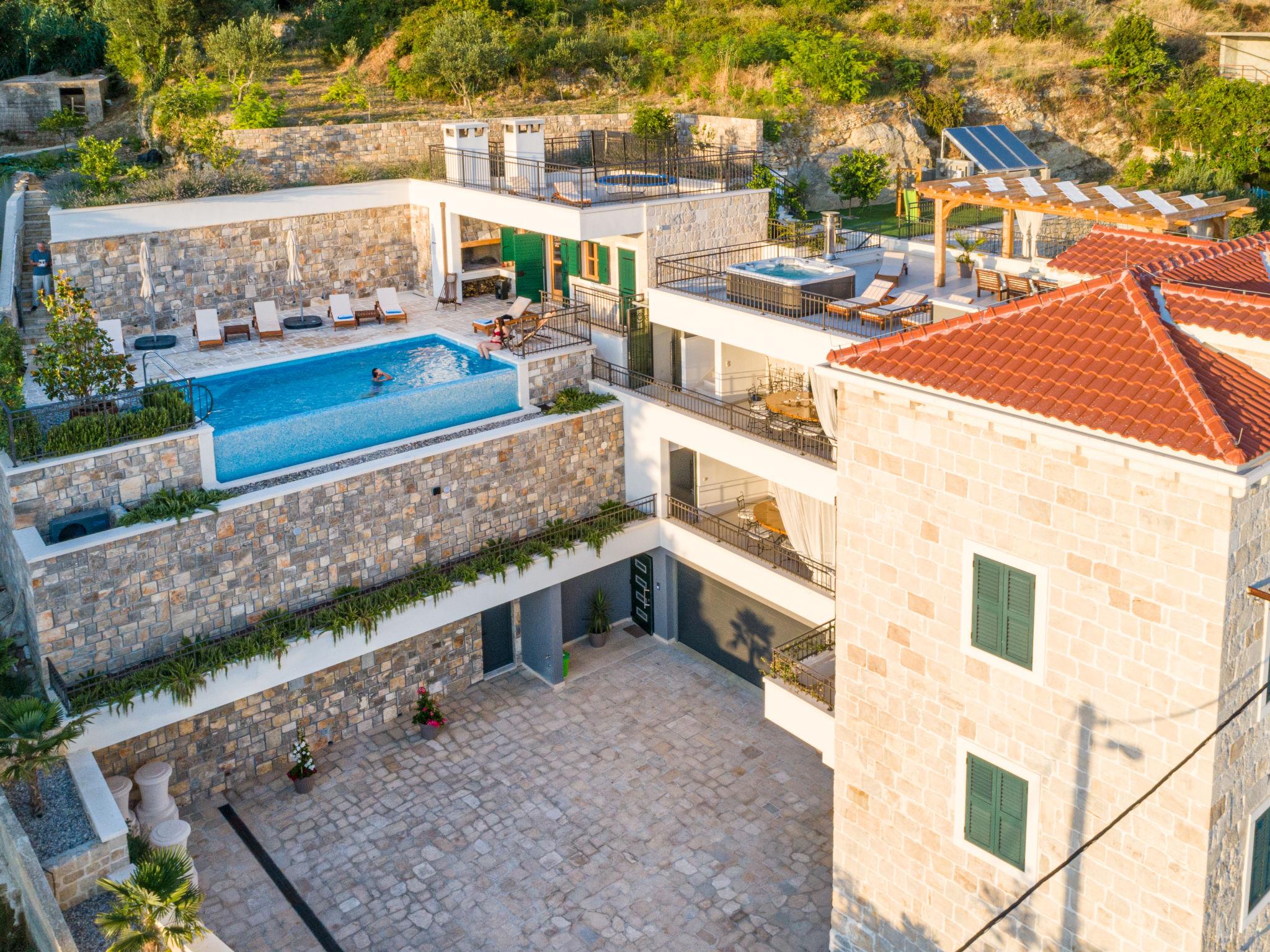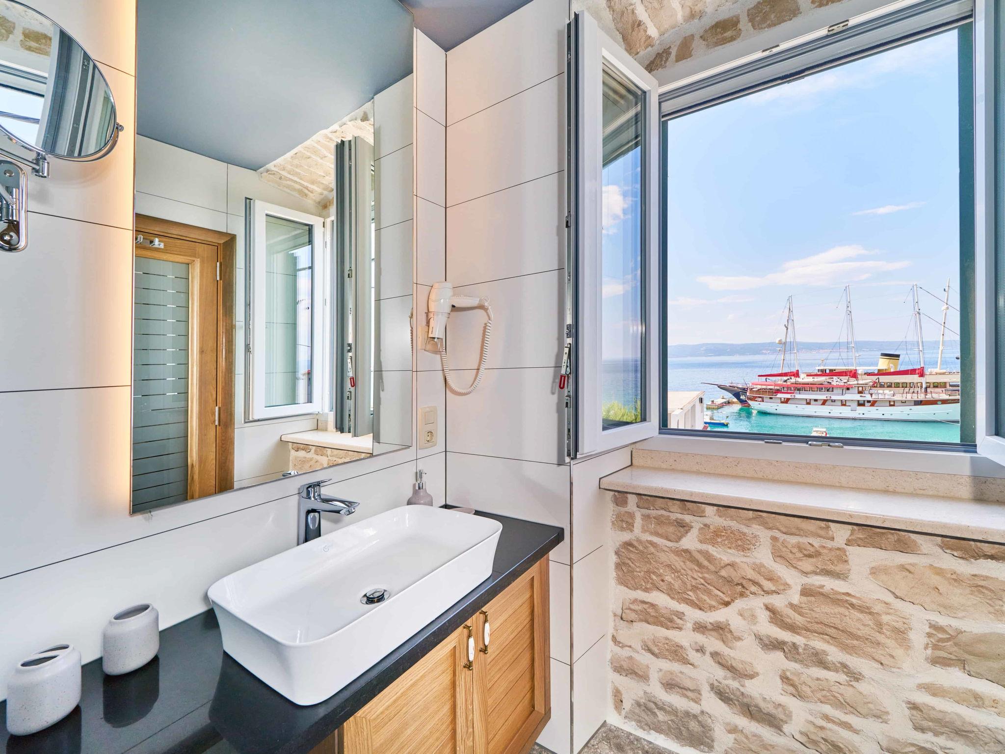 Beautiful villa "Mladenka", 2 storeys, built in 1880, renovated in 2020. In the hamlet Suhi Potok 7 km from the centre of Omiš, in a sunny position, 20 m from the sea, 20 m from the beach, road to cross. Private: property 1'200 m2 (fenced), swimming pool angular, heated (4 x 7 m, seasonal availability: 01.May. - 15.Oct.) with internal staircase. WC in the pool area, outdoor shower, hot tub, terrace (70 m2), garden furniture, barbecue, barbecue house, pool maintenance by the owner/gardener. In the house: internet access, sauna, billiard table, roof terrace, air conditioning, burglar alarm system, washing machine, tumble dryer. Room cleaning daily on request (extra). Breakfast on request (extra). Parking (for 4 cars) at the house on the premises, single garage. Shop 300 m, supermarket 2 km, restaurant 400 m, bus stop 130 m, sandy beach 20 m. Please note: main road close by 5 m from the property. Airfield 35 km from the property. Roof terrace (80 m2, terrace furniture).