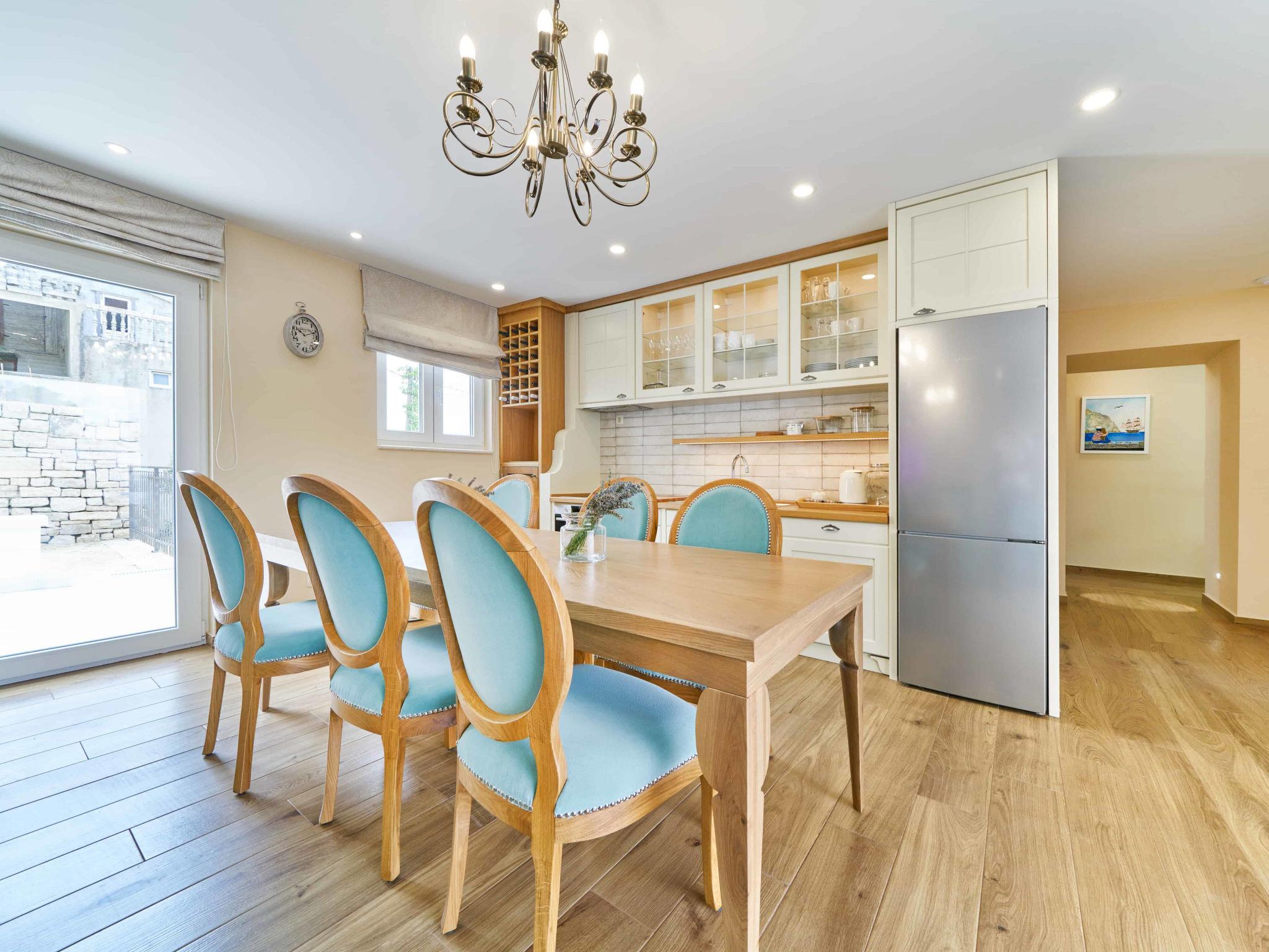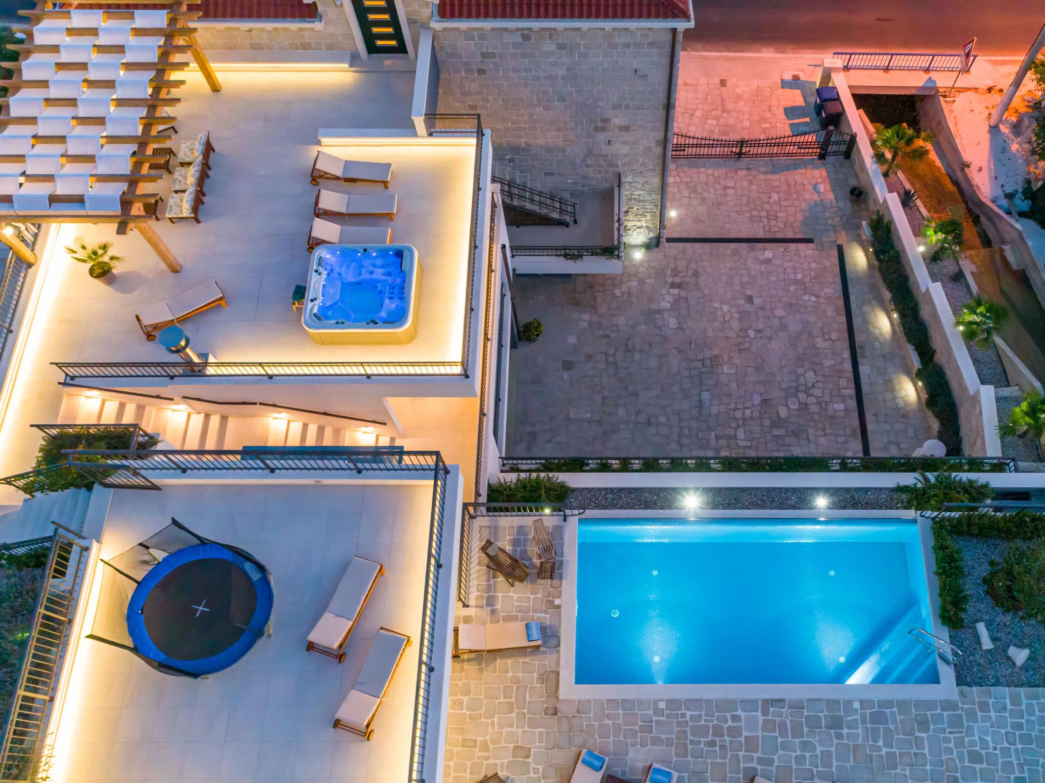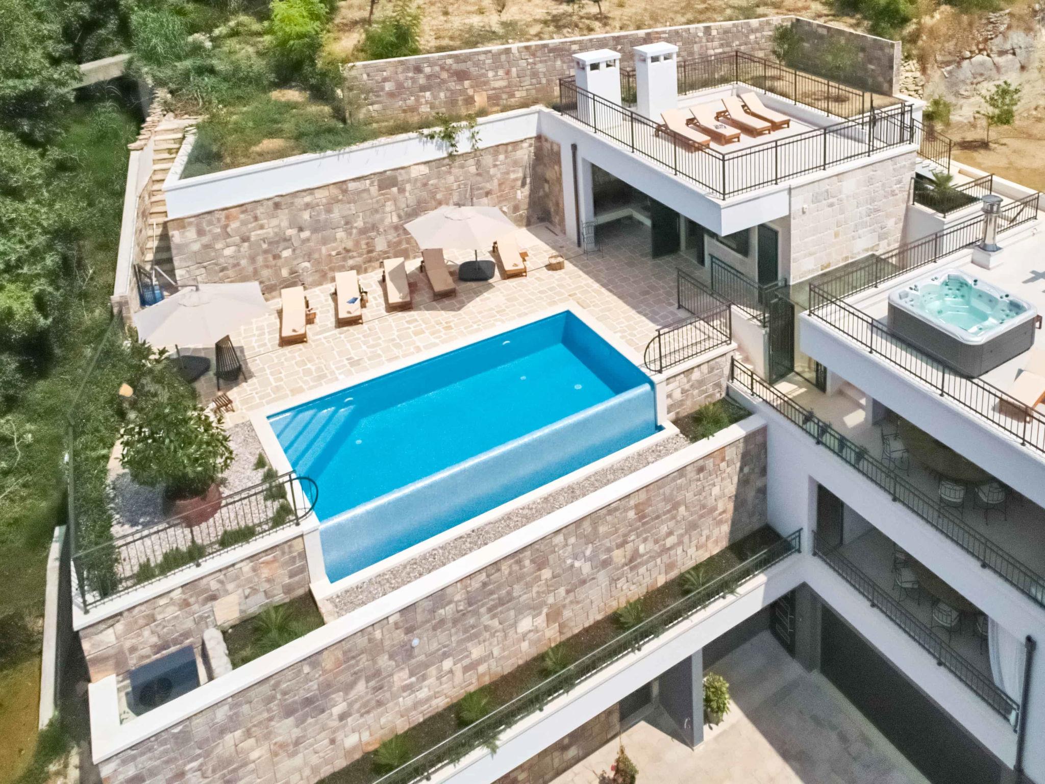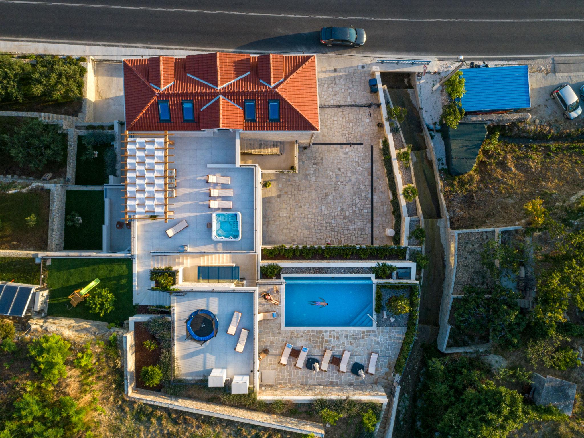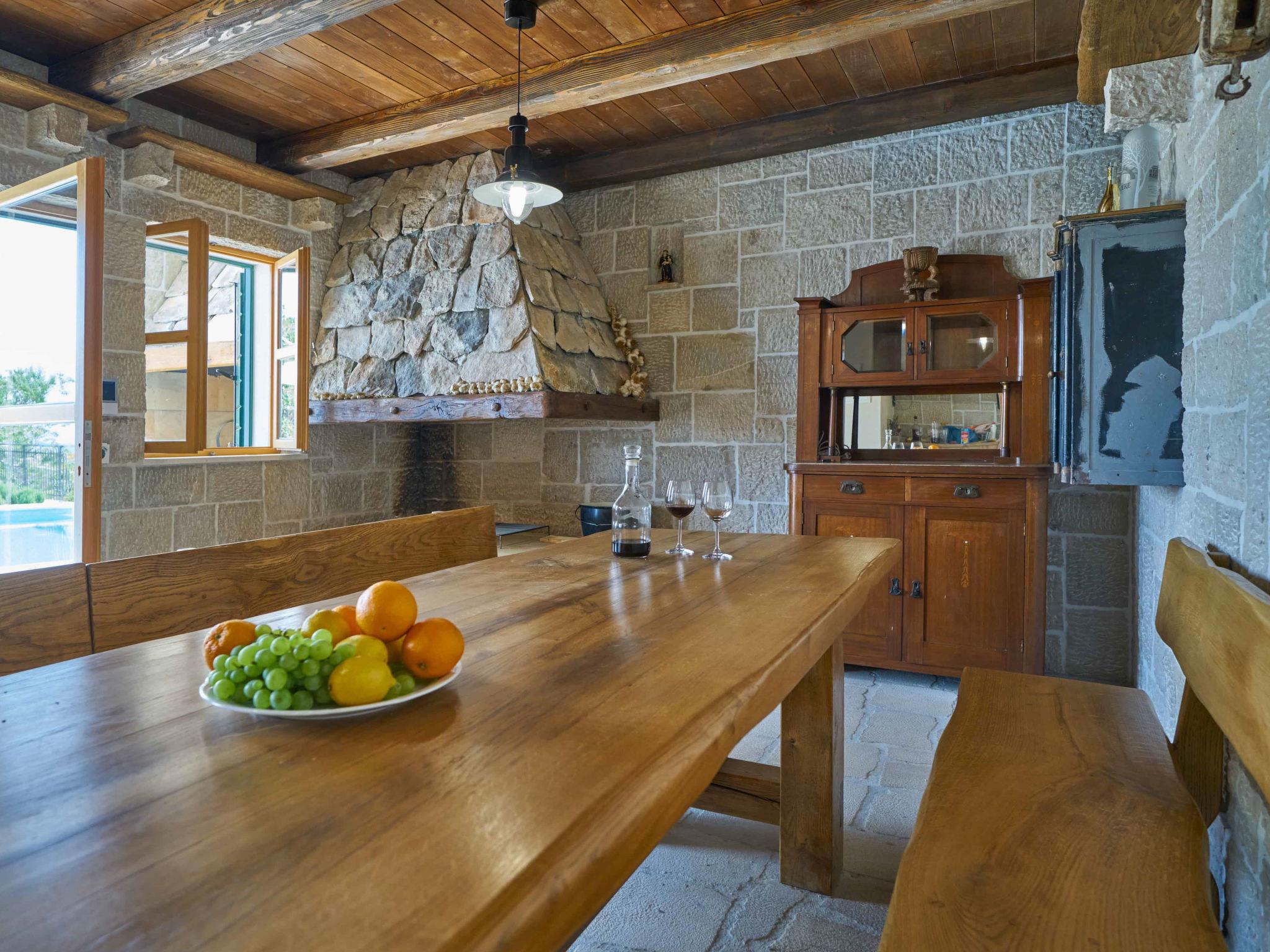 Beautiful villa "Mladenka", 2 storeys, built in 1880, renovated in 2020. In the hamlet Suhi Potok 7 km from the centre of Omiš, in a sunny position, 20 m from the sea, 20 m from the beach, road to cross. Private: property 1'200 m2 (fenced), swimming pool angular, heated (4 x 7 m, seasonal availability: 01.May. - 15.Oct.) with internal staircase. WC in the pool area, outdoor shower, hot tub, terrace (70 m2), garden furniture, barbecue, barbecue house, pool maintenance by the owner/gardener. In the house: internet access, sauna, billiard table, roof terrace, air conditioning, burglar alarm system, washing machine, tumble dryer. Room cleaning daily on request (extra). Breakfast on request (extra). Parking (for 4 cars) at the house on the premises, single garage. Shop 300 m, supermarket 2 km, restaurant 400 m, bus stop 130 m, sandy beach 20 m. Please note: main road close by 5 m from the property. Airfield 35 km from the property. Roof terrace (80 m2, terrace furniture).