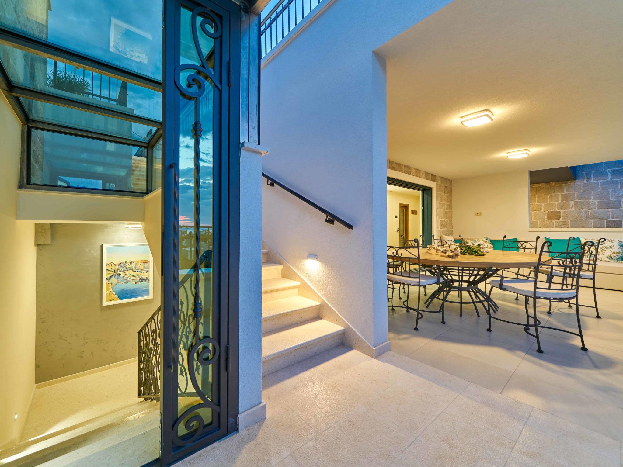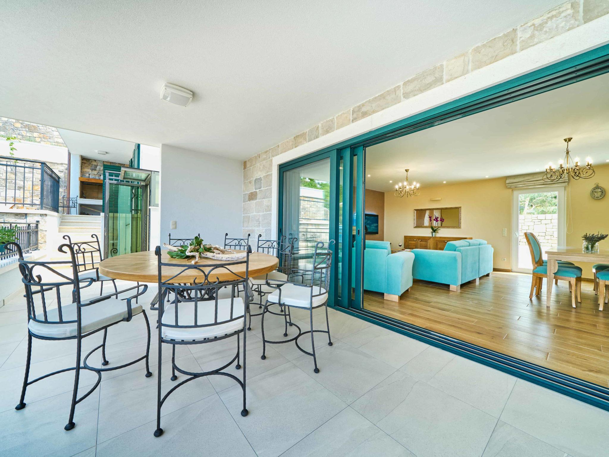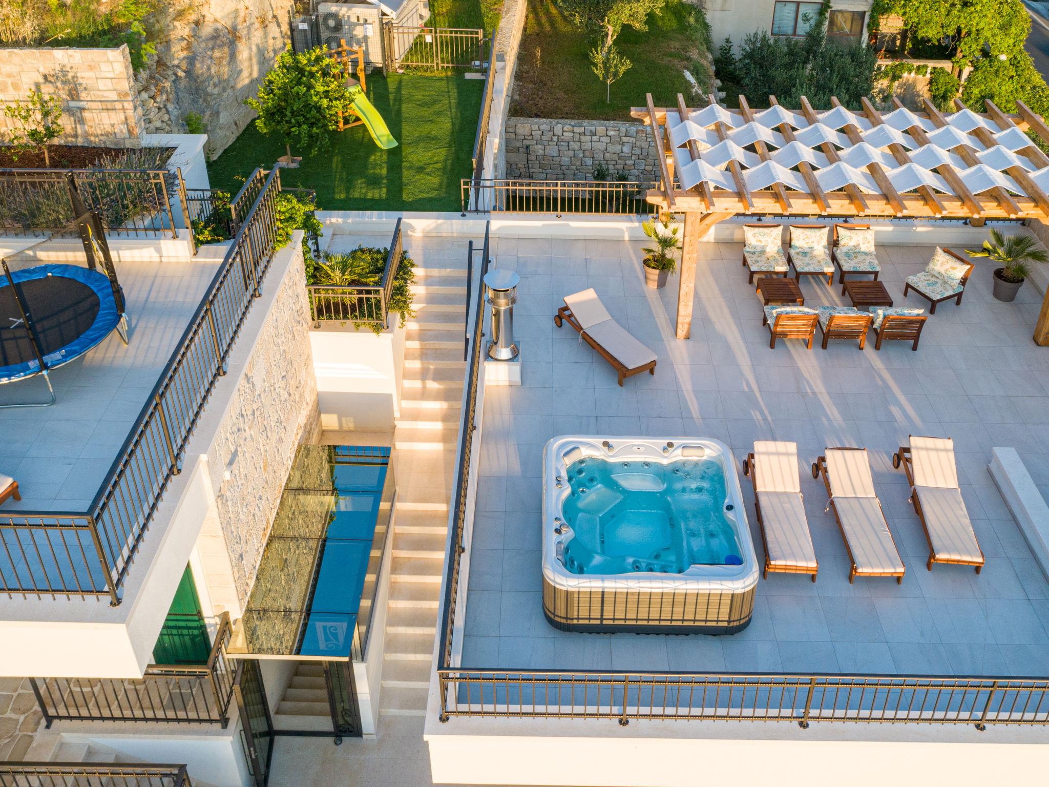 8-room villa 280 m2 on 2 levels. Spacious, beautiful furnishings: living/dining room with open-hearth fireplace and satellite TV (flat screen), air conditioning. Exit to the terrace. 2 rooms, each room with 1 french bed (180 cm, length 200 cm), shower/WC and satellite TV (flat screen). 1 room with 2 beds (90 cm, length 200 cm), shower/WC and satellite TV (flat screen). Open kitchen (oven, dishwasher, 4 ceramic glass hob hotplates, toaster, kettle, microwave, freezer, electric coffee machine). Sep. WC. Upper floor: living/dining room with open-hearth fireplace and satellite TV (flat screen). Exit to the terrace, to the swimming pool. 2 rooms, each room with 1 french bed (180 cm, length 200 cm), shower/WC and satellite TV (flat screen). 1 room with 2 beds (90 cm, length 200 cm), shower/WC and satellite TV (flat screen). Open kitchen (oven, dishwasher, 4 ceramic glass hob hotplates, toaster, kettle, microwave, freezer, electric coffee machine). Sep. WC. Floor heating. Balcony 10 m2, 2 terraces 20 m2, covered. Terrace furniture, deck chairs. Beautiful view of the sea. Facilities: safe, iron, children's high chair, baby cot, hair dryer. Internet (WiFi, free). Please note: smoke alarm, fire extinguisher.