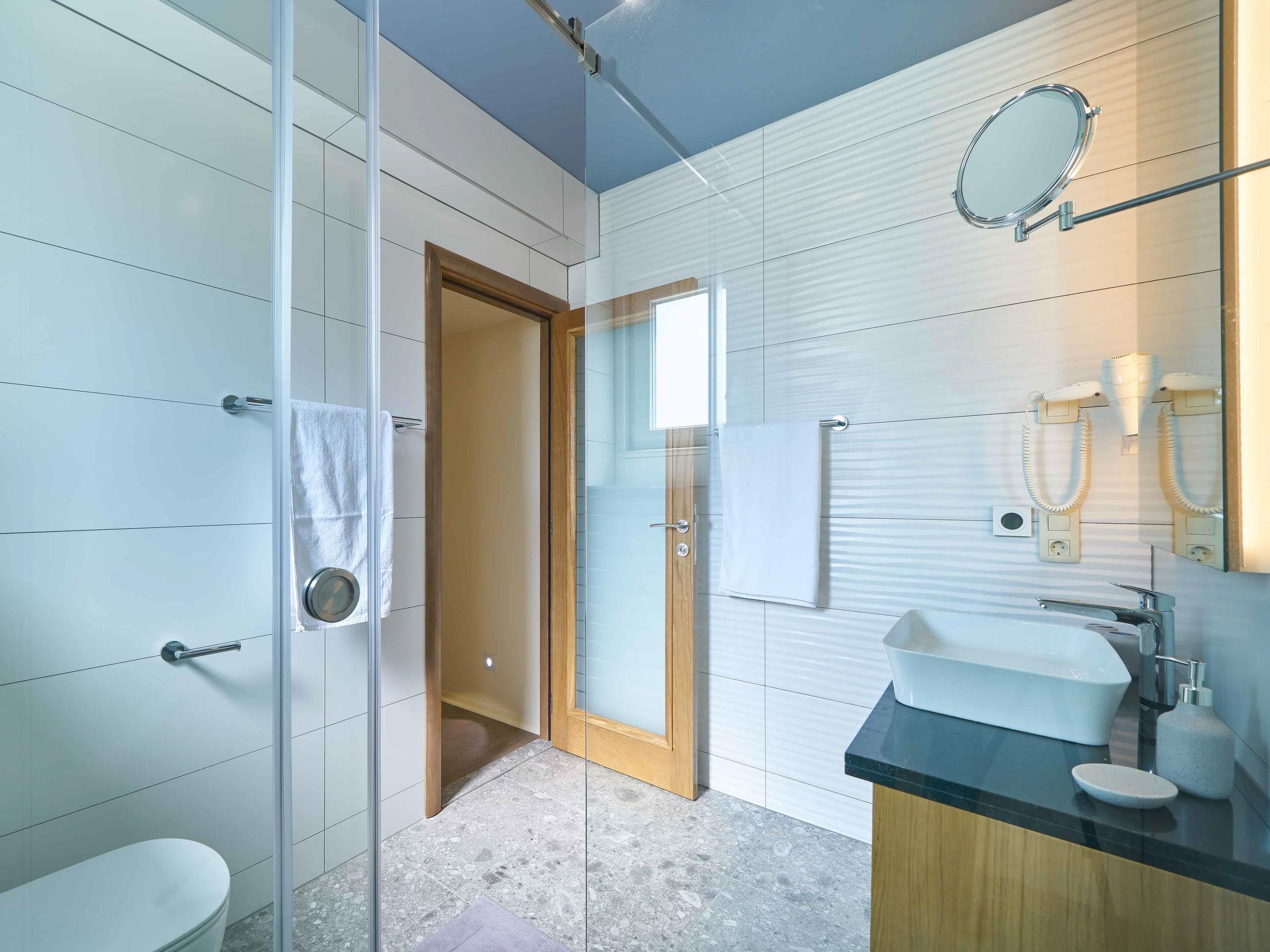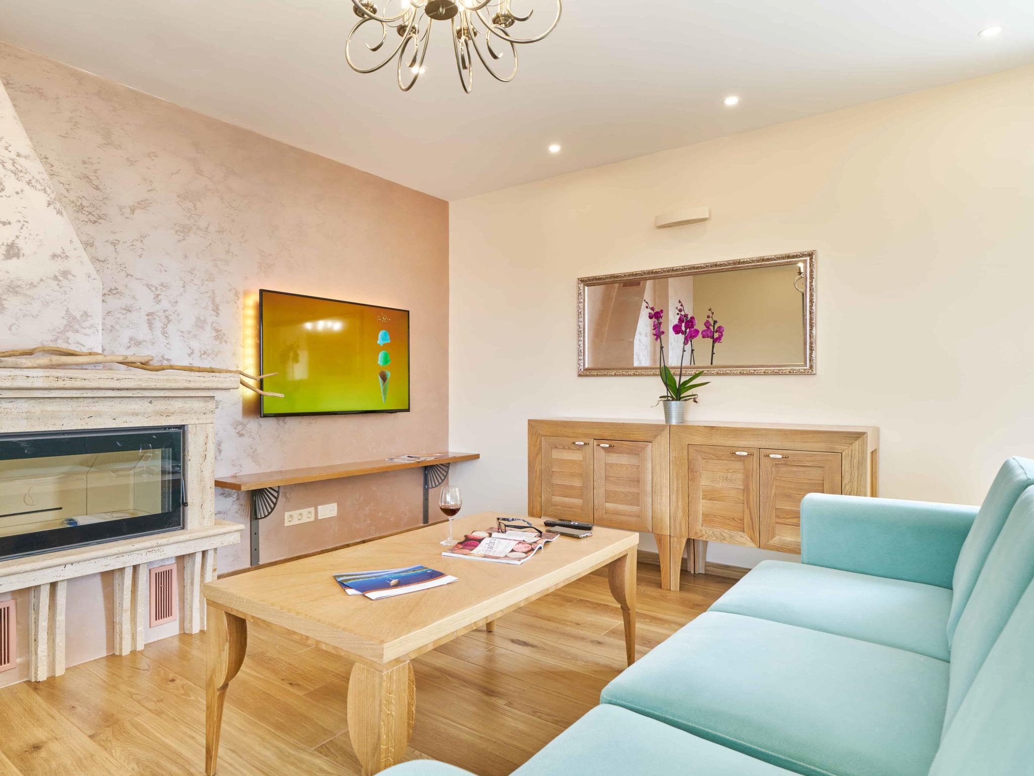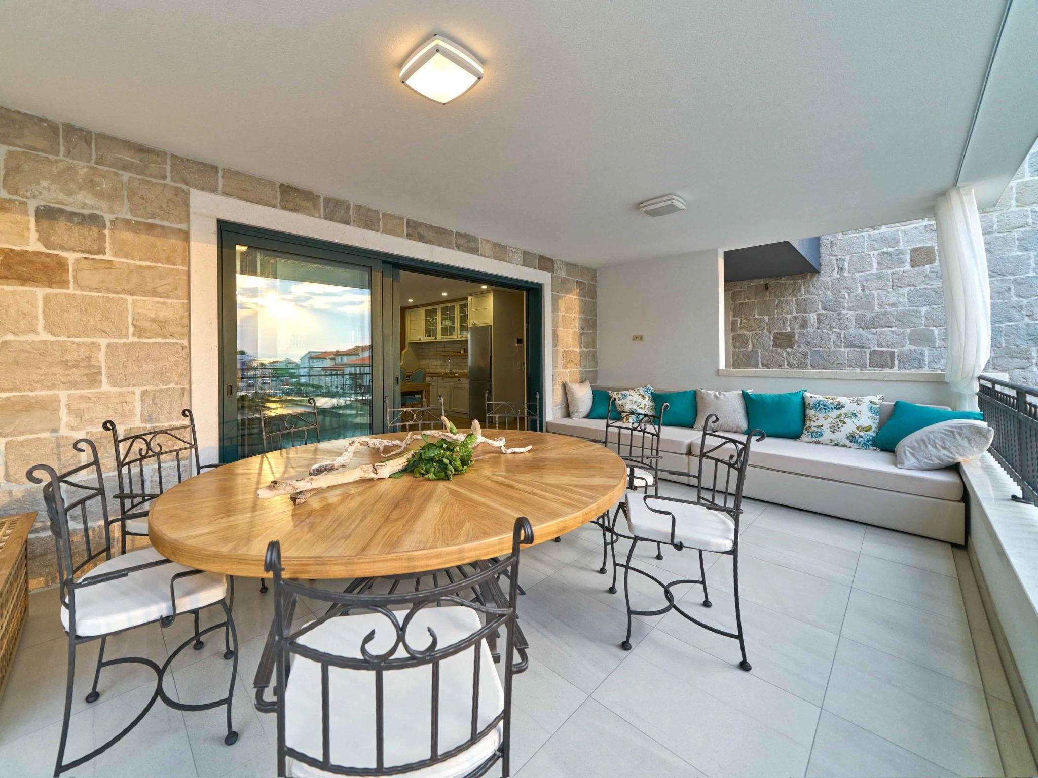 8-room villa 280 m2 on 2 levels. Spacious, beautiful furnishings: living/dining room with open-hearth fireplace and satellite TV (flat screen), air conditioning. Exit to the terrace. 2 rooms, each room with 1 french bed (180 cm, length 200 cm), shower/WC and satellite TV (flat screen). 1 room with 2 beds (90 cm, length 200 cm), shower/WC and satellite TV (flat screen). Open kitchen (oven, dishwasher, 4 ceramic glass hob hotplates, toaster, kettle, microwave, freezer, electric coffee machine). Sep. WC. Upper floor: living/dining room with open-hearth fireplace and satellite TV (flat screen). Exit to the terrace, to the swimming pool. 2 rooms, each room with 1 french bed (180 cm, length 200 cm), shower/WC and satellite TV (flat screen). 1 room with 2 beds (90 cm, length 200 cm), shower/WC and satellite TV (flat screen). Open kitchen (oven, dishwasher, 4 ceramic glass hob hotplates, toaster, kettle, microwave, freezer, electric coffee machine). Sep. WC. Floor heating. Balcony 10 m2, 2 terraces 20 m2, covered. Terrace furniture, deck chairs. Beautiful view of the sea. Facilities: safe, iron, children's high chair, baby cot, hair dryer. Internet (WiFi, free). Please note: smoke alarm, fire extinguisher.