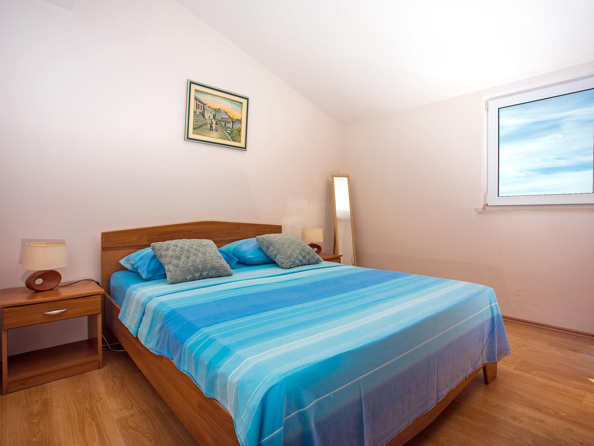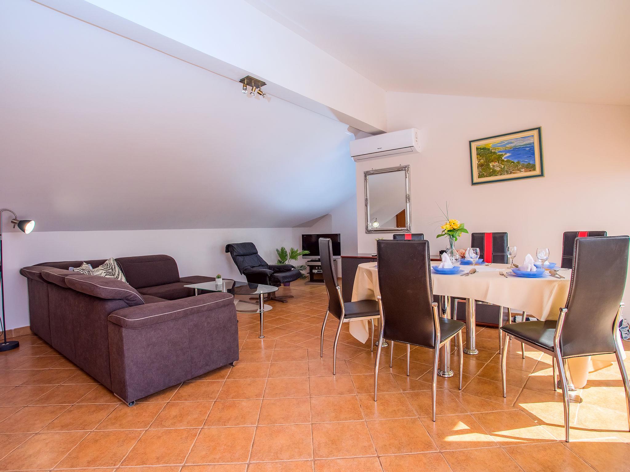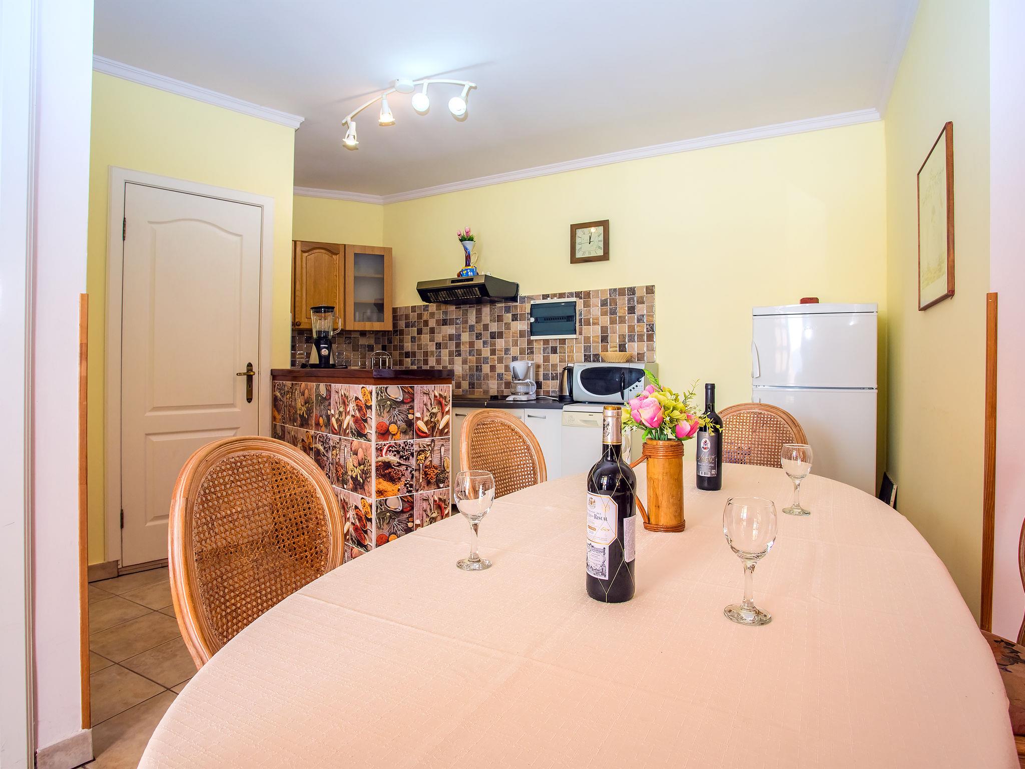 8-room house 250 m2 on 3 levels. Living/dining room with satellite TV (flat screen), air conditioning. Exit to the terrace. 2 rooms, each room with 1 french bed (180 cm, length 200 cm). 1 room with 2 x 1 bunk beds (80 cm, length 200 cm). Open kitchen (2 hot plates, oven, dishwasher, microwave, freezer, electric coffee machine). Shower, sep. WC. No heating option. Upper floor: (open staircase) living/dining room with sloping ceilings with satellite TV (flat screen), air conditioning. Exit to the terrace. 2 rooms, each room with 1 french bed (180 cm, length 200 cm). With sloping ceilings, 1 room with 2 beds (80 cm, length 200 cm). Open kitchen (4 hot plates, oven, dishwasher, microwave, freezer). Shower, sep. WC. Terrace 85 m2 partly roofed terrace 45 m2. Terrace furniture, barbecue, deck chairs. Marvellous panoramic view of the sea. Facilities: hair dryer. Internet (WiFi, free).