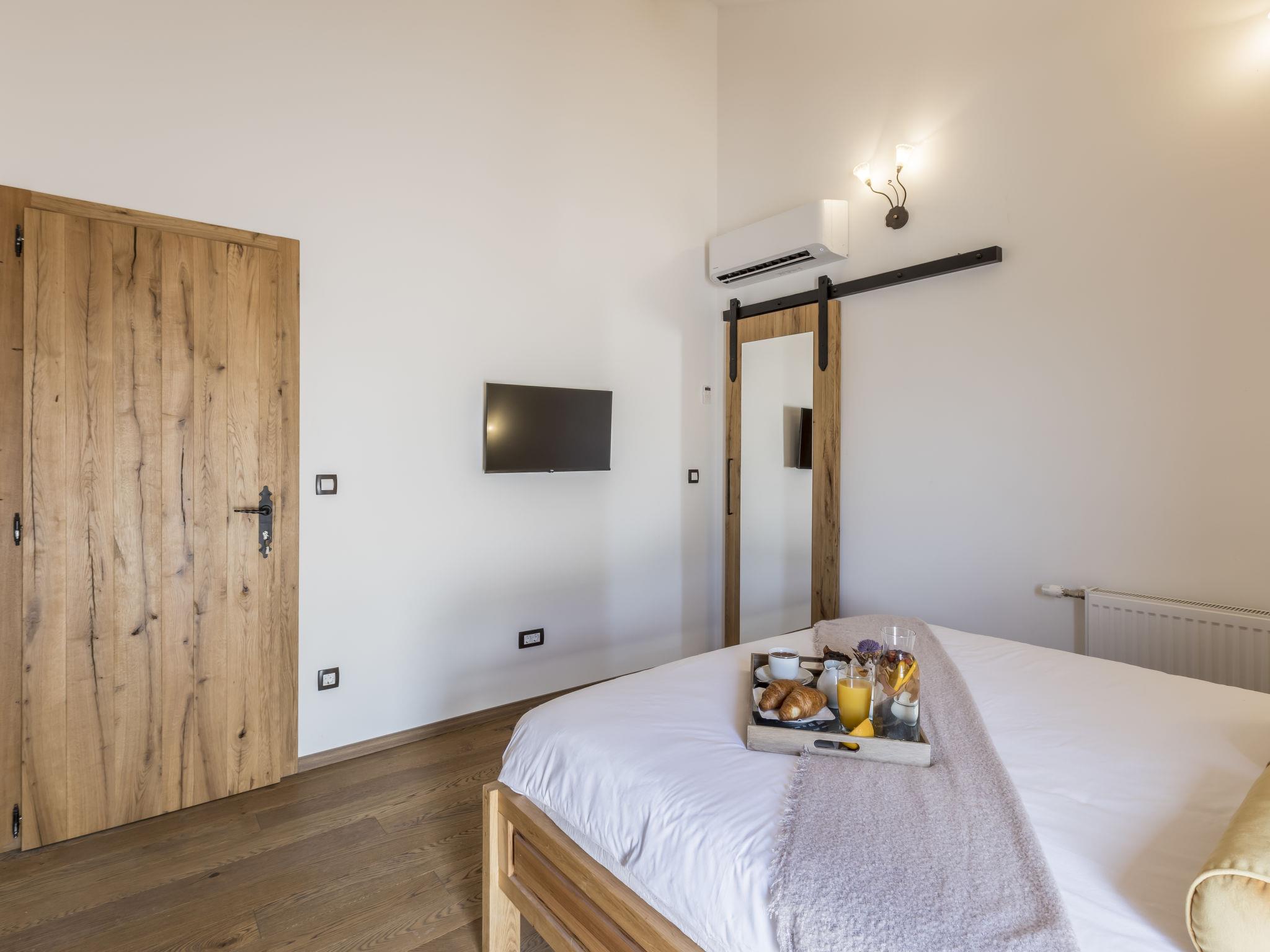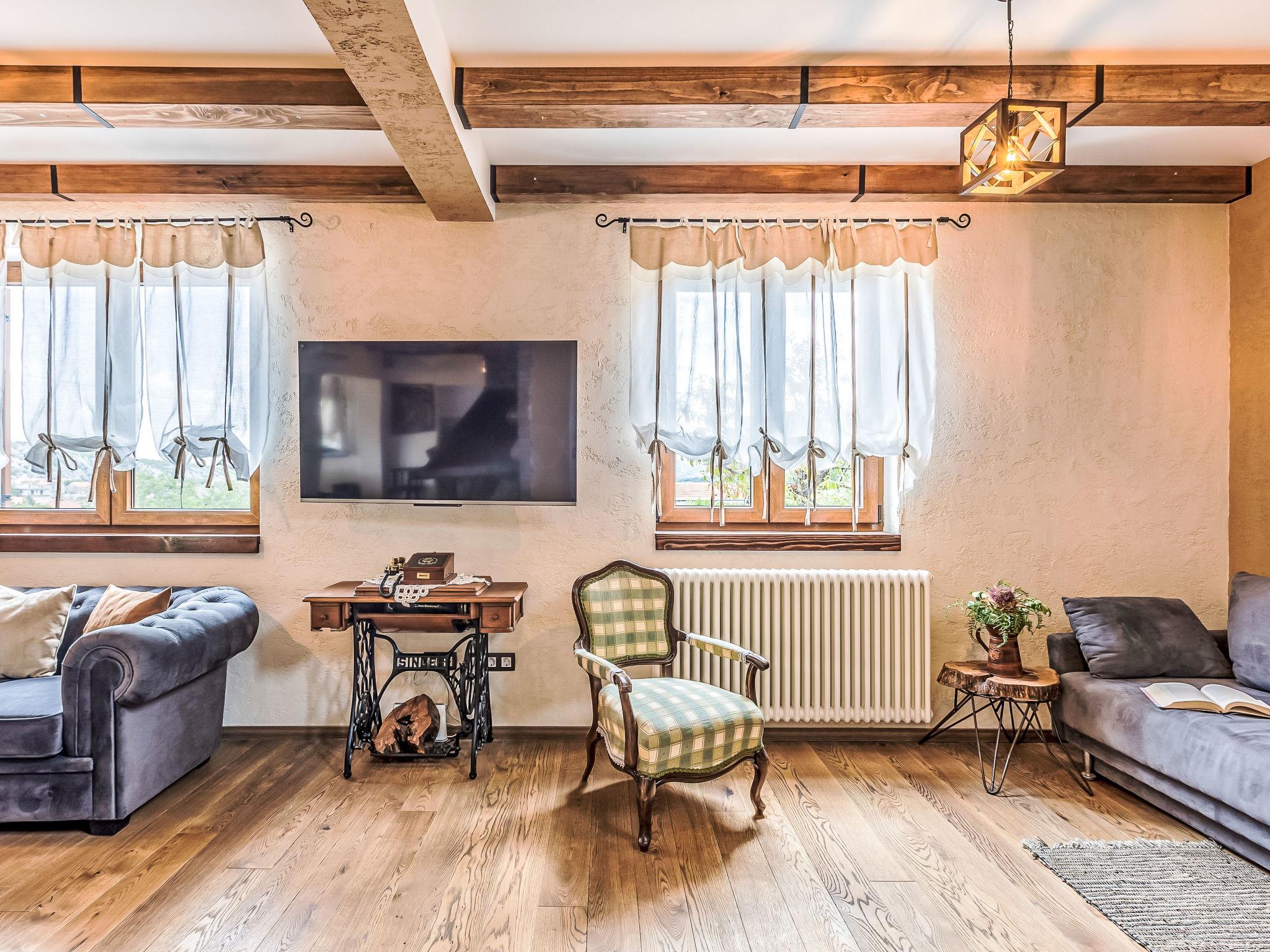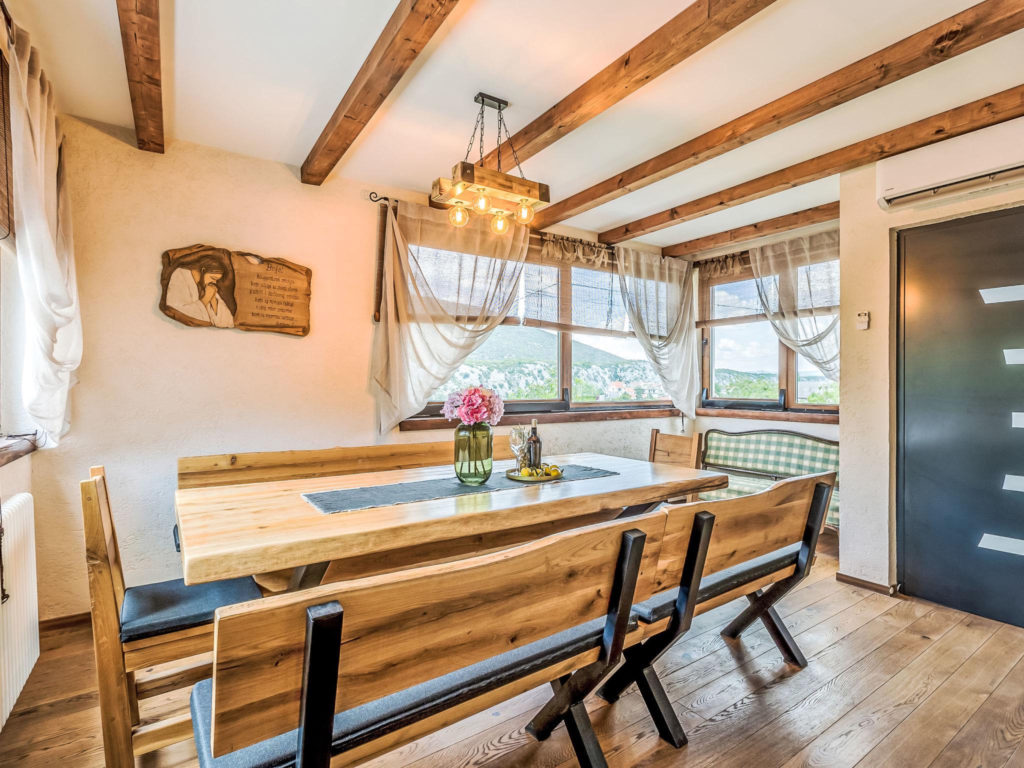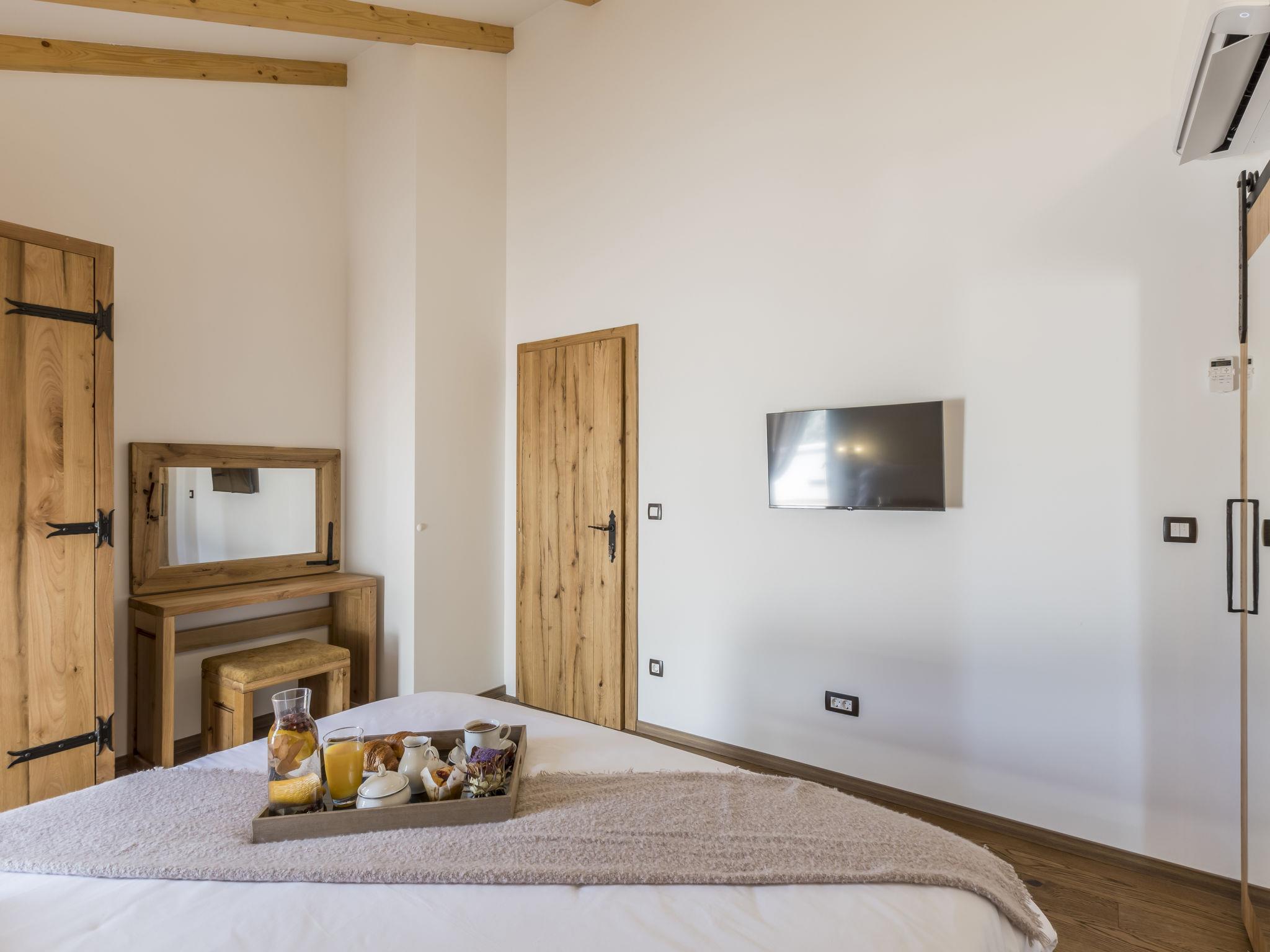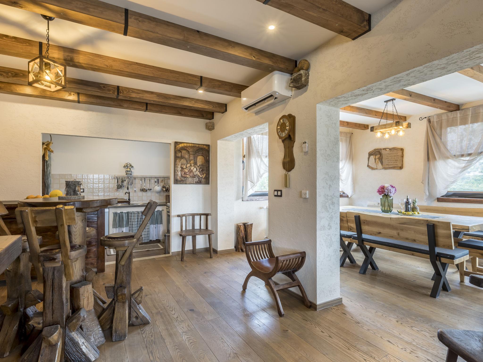 6-room villa 150 m2. Upper floor: living/dining room 45 m2 with satellite TV and air conditioning. 1 room with 1 french bed (160 cm, length 200 cm), satellite TV and air conditioning. Open kitchen (2 hot plates, oven, dishwasher, 2 gas rings, toaster, kettle, microwave, freezer, electric coffee machine). Shower/WC. Top floor: 3 rooms, each room with 1 french bed (160 cm, length 200 cm), shower/WC, satellite TV and air conditioning. Barbecue, deck chairs. Very beautiful panoramic view of the mountains. Facilities: safe, iron, hair dryer. Internet (WiFi, free). Please note: non-smoking house.