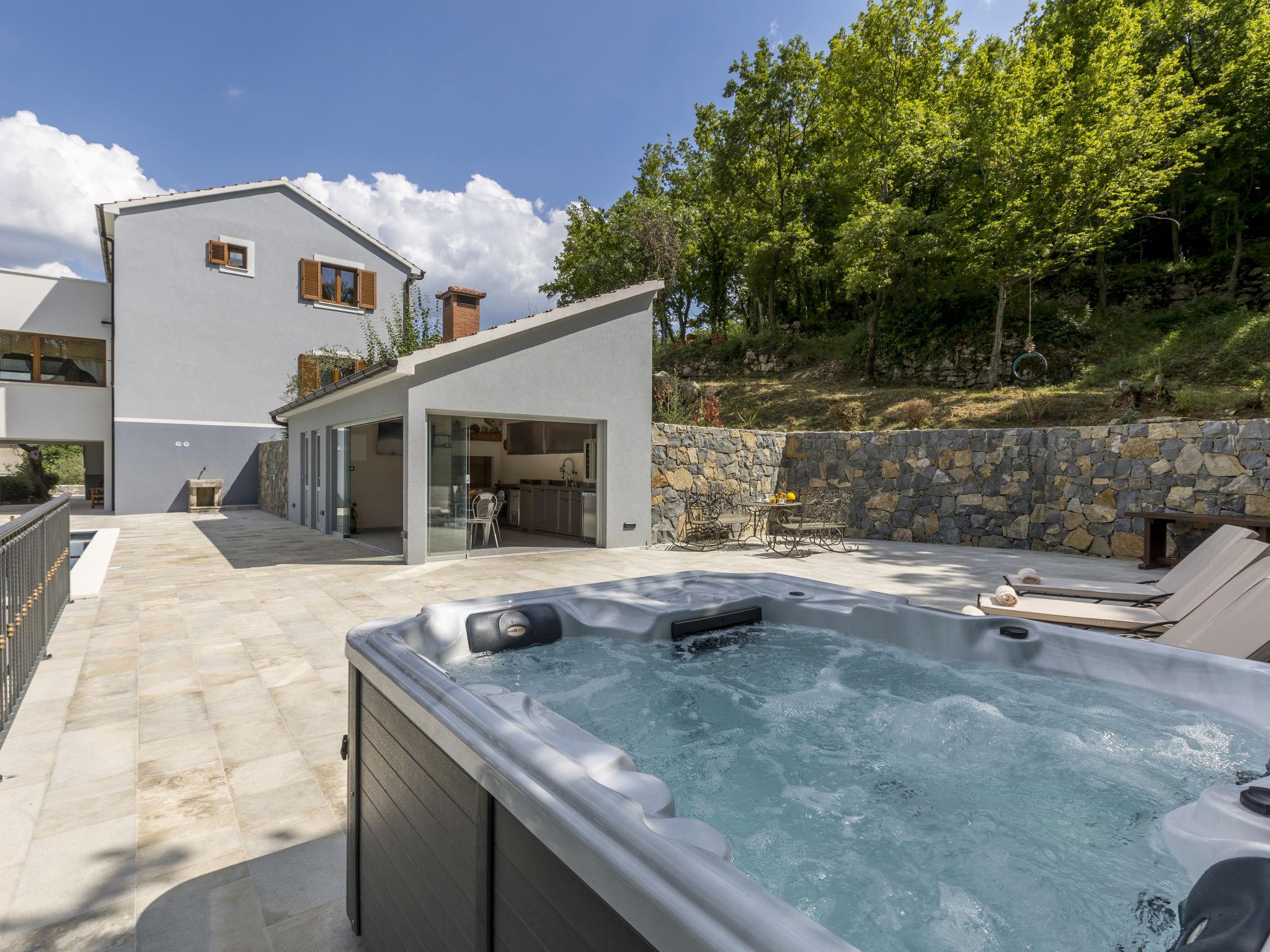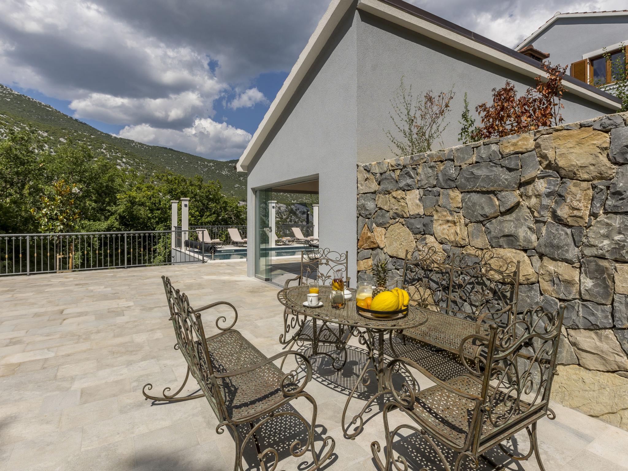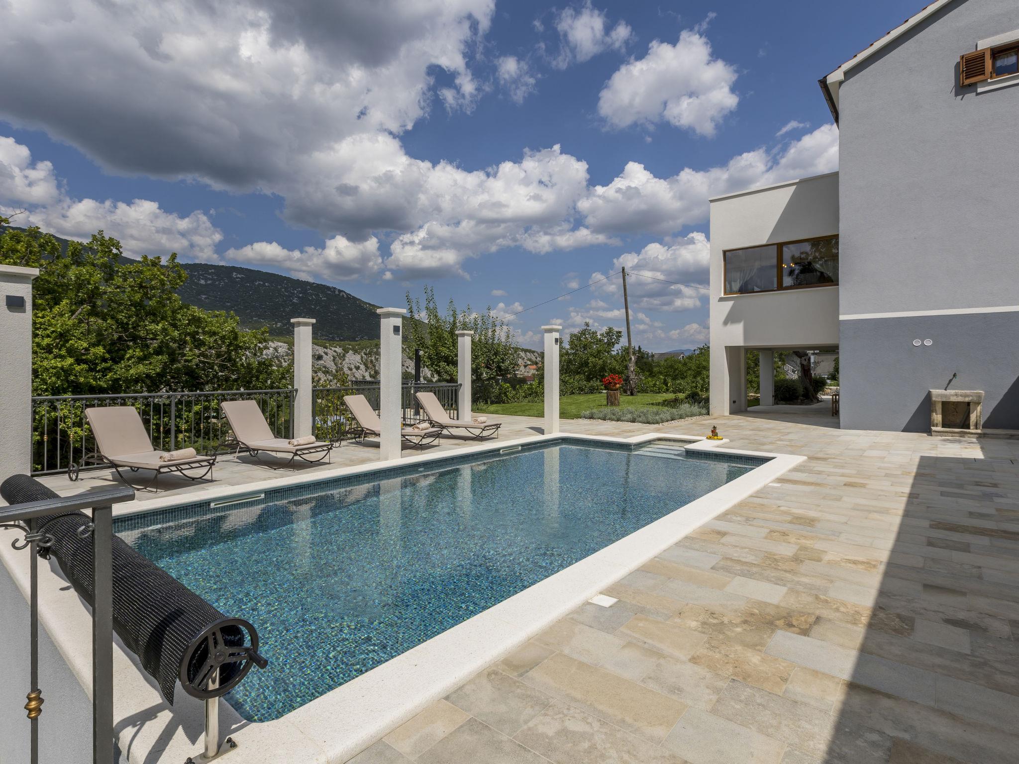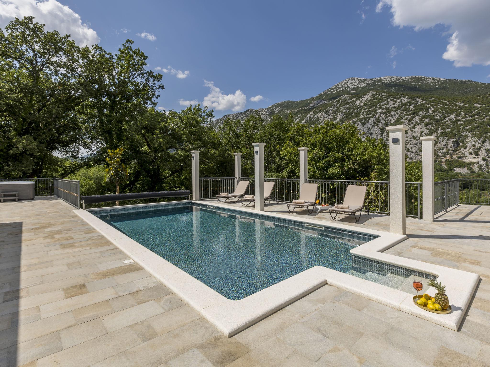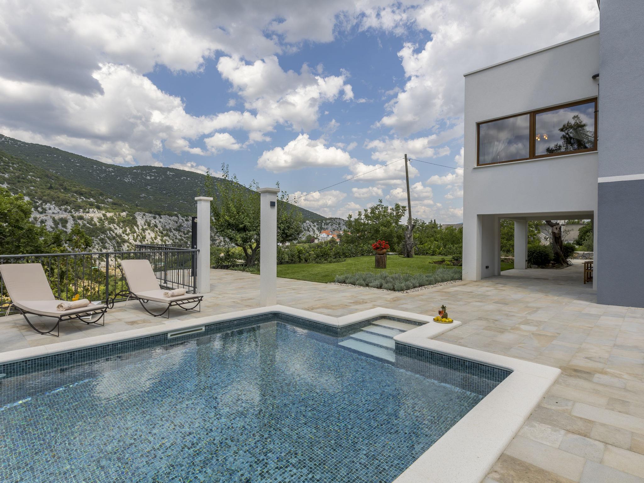 Very beautiful villa "Greystone", 3 storeys. 14 km from the centre of Omiš, in a secluded, quiet, sunny position, 14 km from the sea, 14 km from the beach, in a cul-de-sac. Private: property 500 m2 (fenced), swimming pool angular (24 m2, seasonal availability: 01.May. - 01.Nov.) with internal staircase. Outdoor shower, hot tub, pool house with fridge, shower, WC and cooking stove, pool maintenance by the owner/gardener. In the house: internet access, sauna, washing machine, tumble dryer. Parking (for 4 cars) at the house on the premises. Shop 2.7 km, bus stop 1.2 km, sandy beach 14 km. Please note: airfield 50 km from the property. Neighbourhood highly sensitive to noise. Quietness and good behaviour expected.