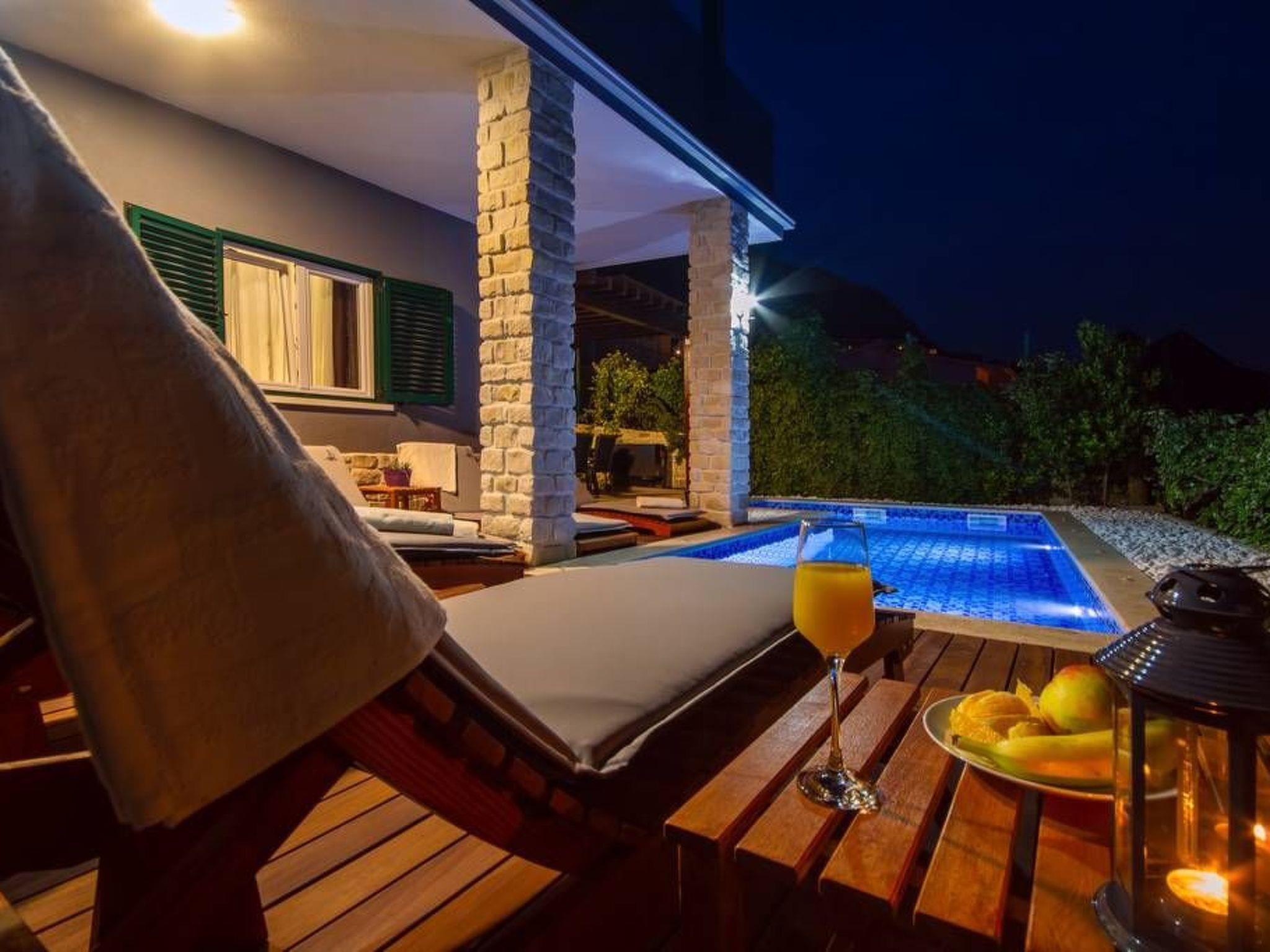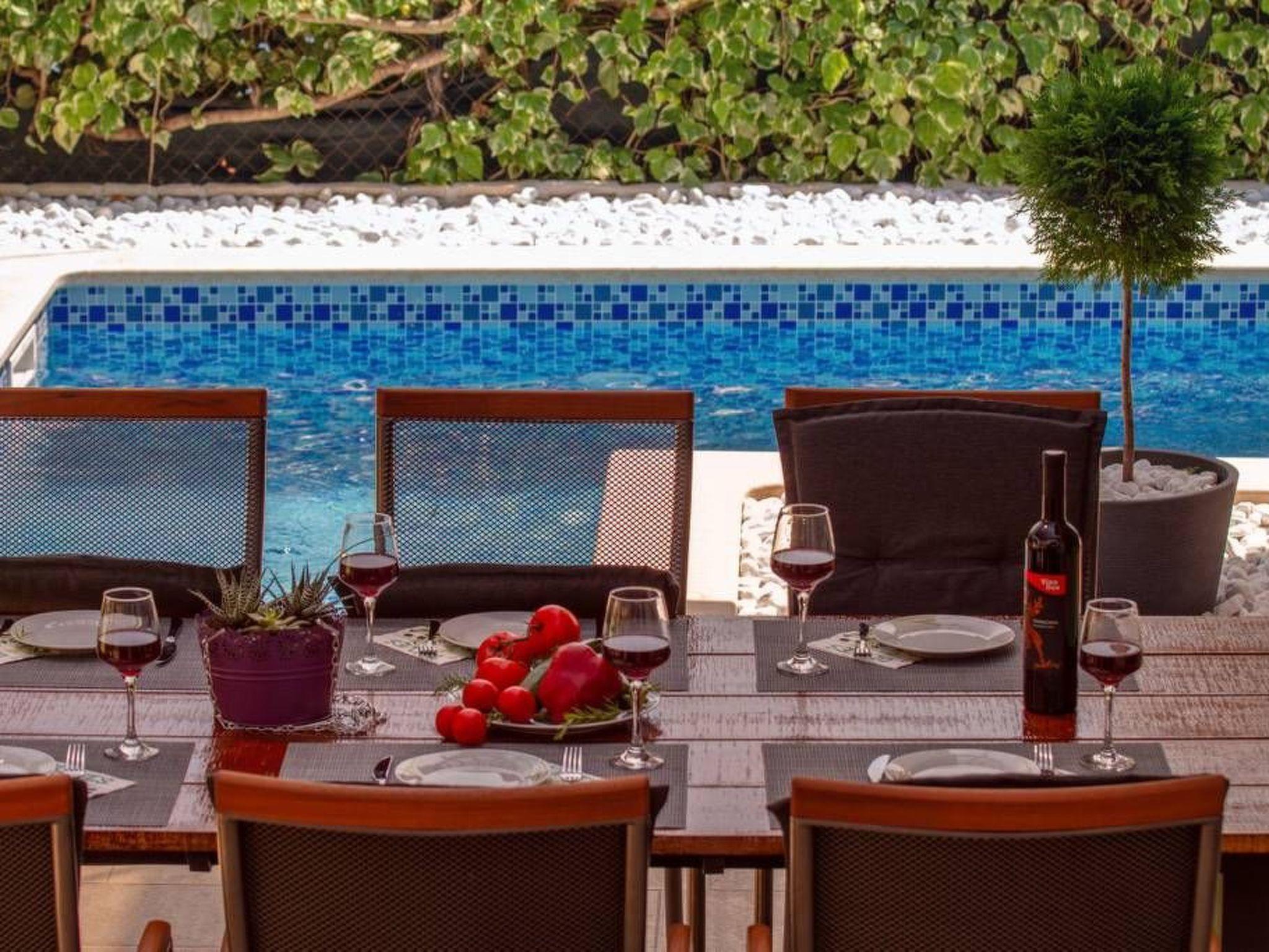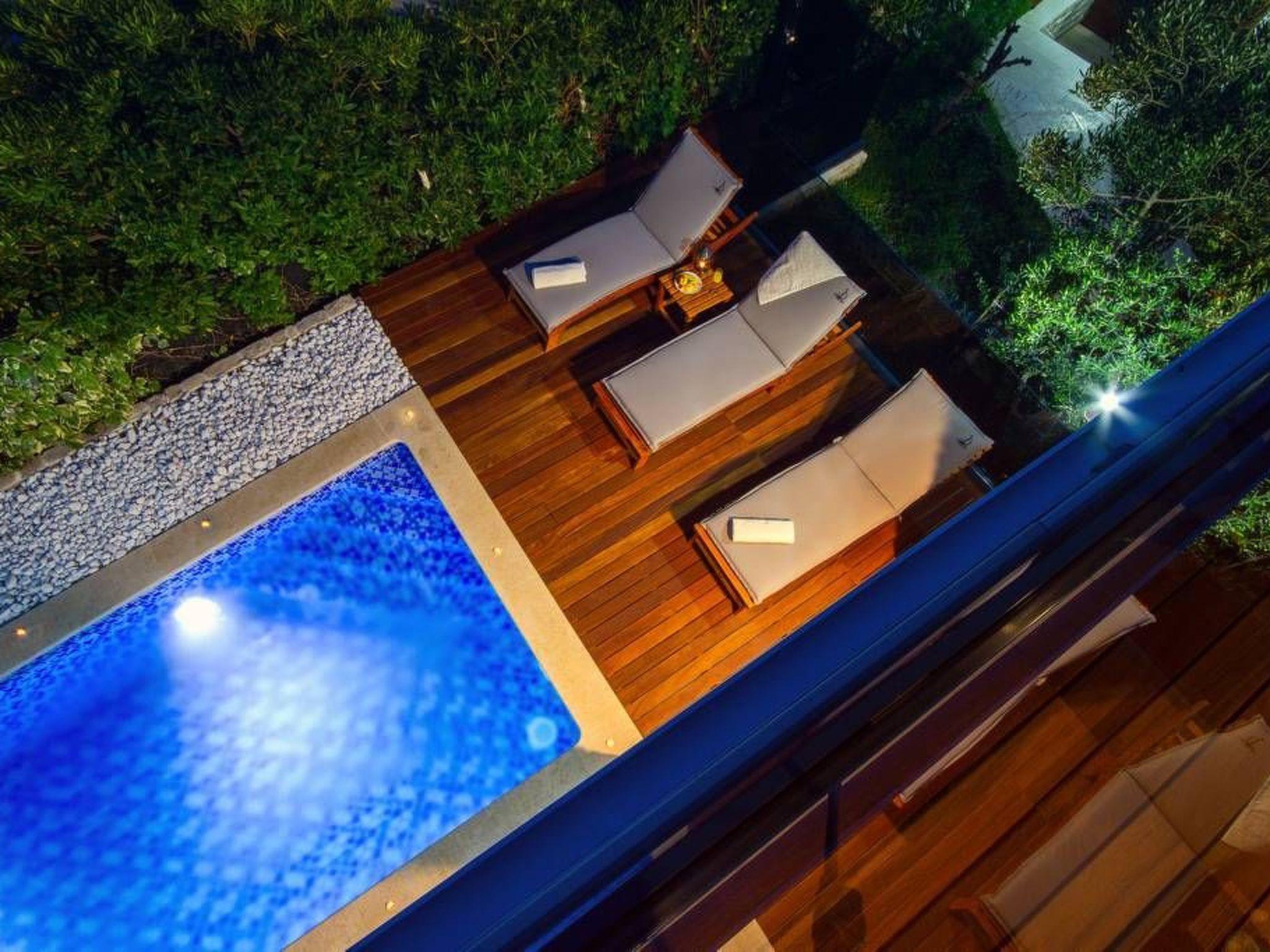 Heated pool with massage is situated in front of the villa surrounded with beautiful decking and highest quality sun chairs. Outside dinning area with big barbecue is situated by the pool and green areas around the villa will ensure privacy and your personal paradise.