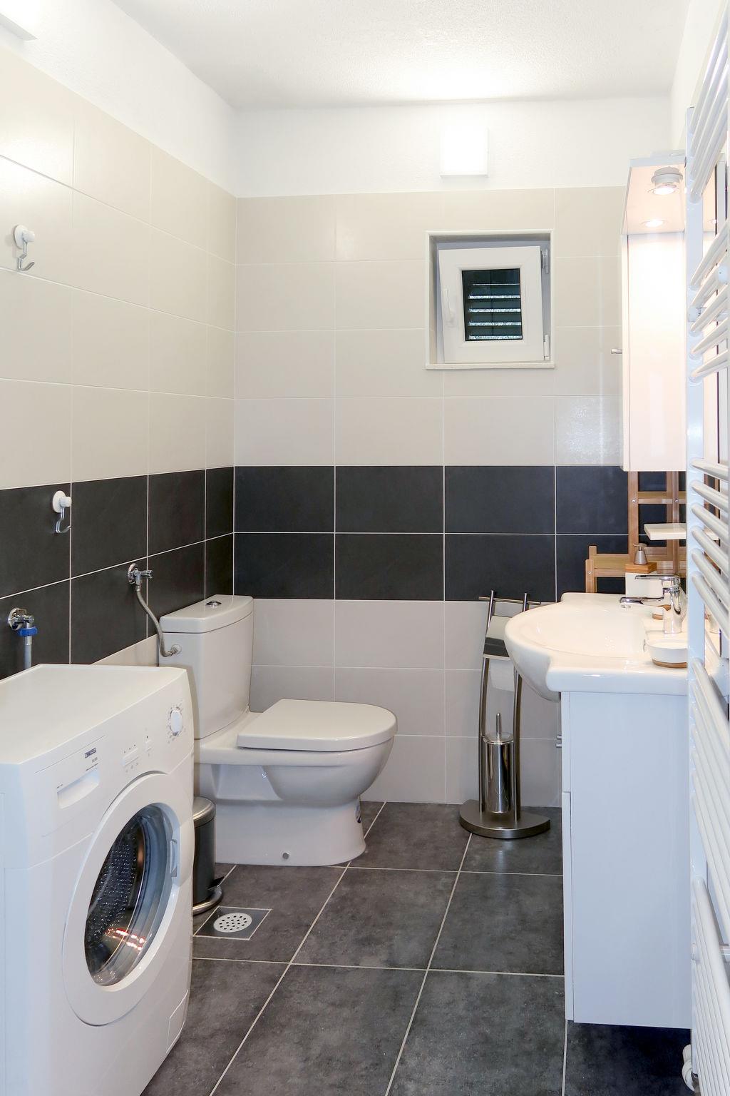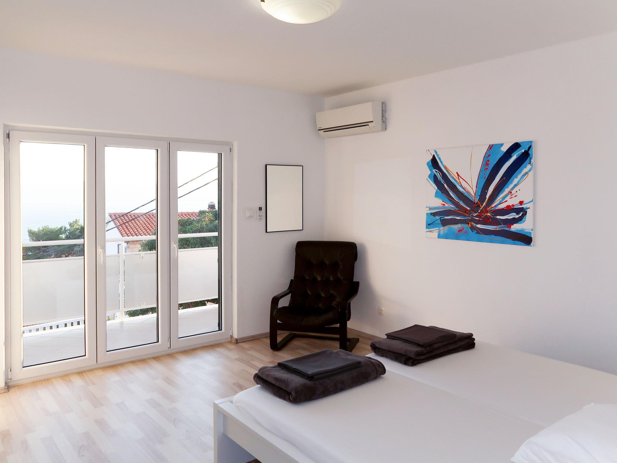 "Bacic", 3-room apartment 75 m2 on 1st floor. Living/dining room with 1 sofabed, satellite TV and air conditioning. Exit to the balcony. 2 rooms, each room with 1 double bed and air conditioning. Exit to the balcony. Open kitchen (1 hot plate, oven, dishwasher, 3 gas rings, toaster, kettle, microwave, freezer, electric coffee machine). Shower/WC. No heating option. 2 balconies 15 m2. Balcony furniture. View of the sea. Facilities: washing machine, baby cot. Internet (WiFi, free). Please note: non-smoking house. Private entrance.