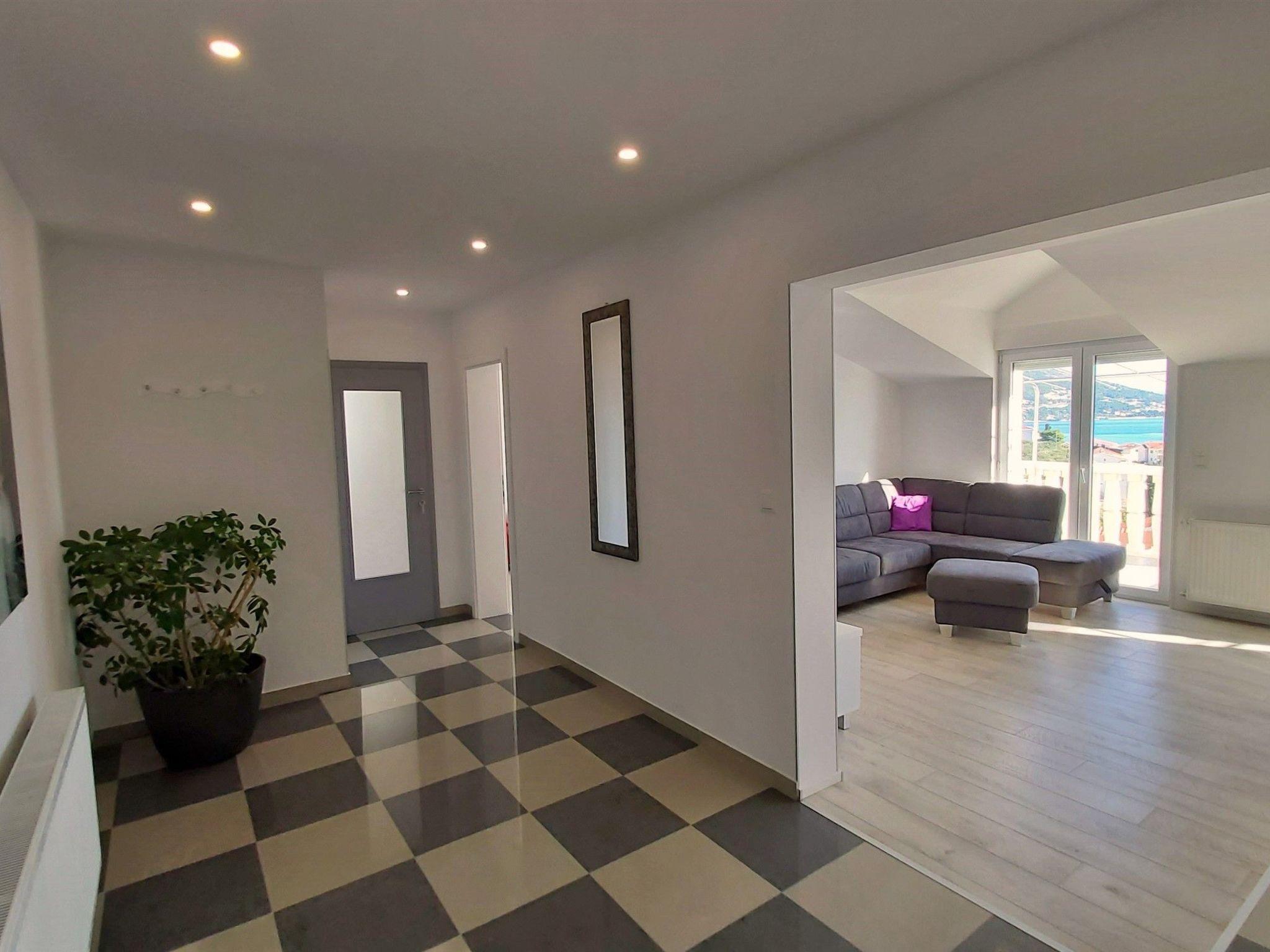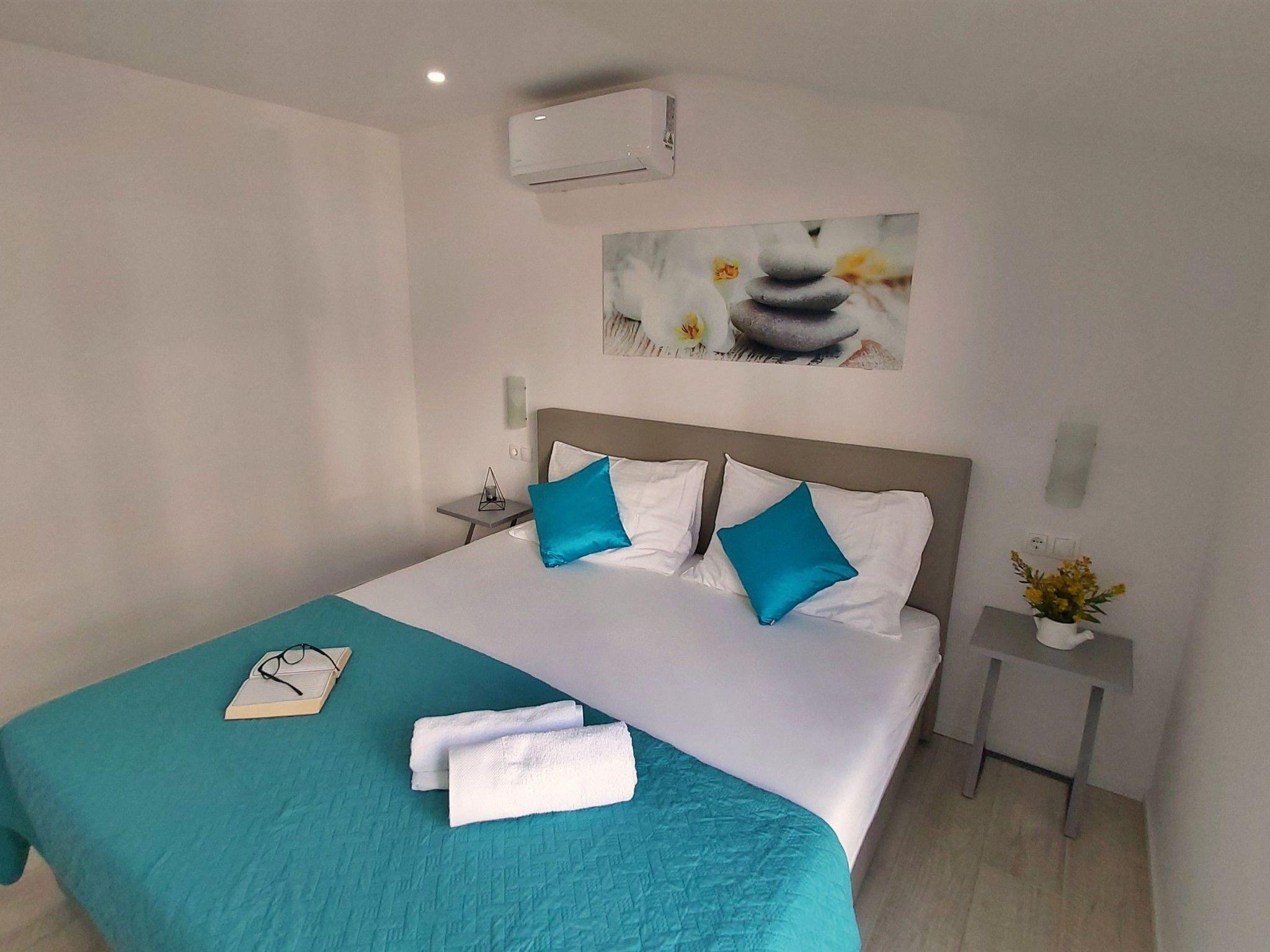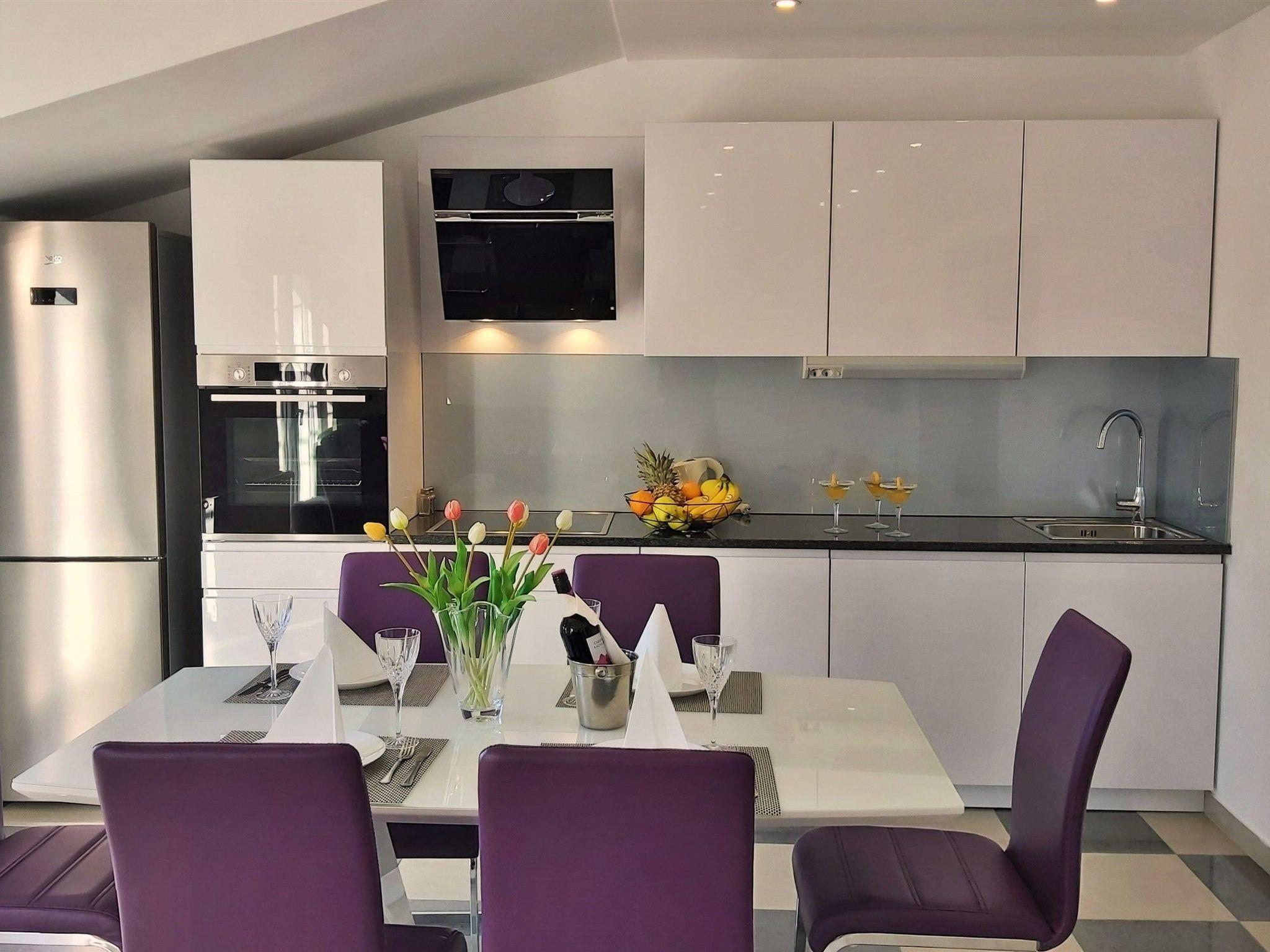 It is a private apartment in a building, on the 2nd floor, and it can accommodate up to 5 persons. The apartment features two bedrooms with double beds, in one of them is a sofa bed for one additional sleeping possibility, an equipped kitchen (including an oven, a dishwasher, kitchenware and other kitchen appliances) with a living room and a dining/sitting area, 2 bathrooms and a sea-view balcony with an outdoor dining/sitting area.Additional amenities include Wi-Fi, SAT/TV, a washing machine and air-conditioning (one unit in each bedroom and one unit in the living room).